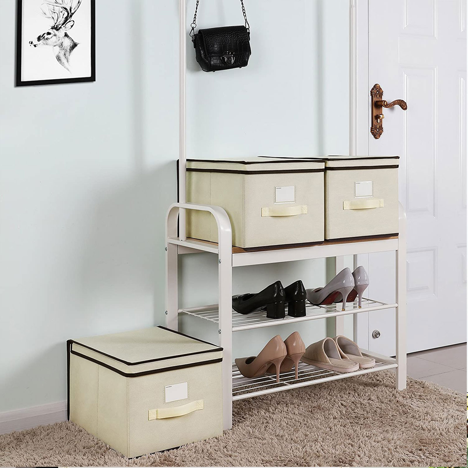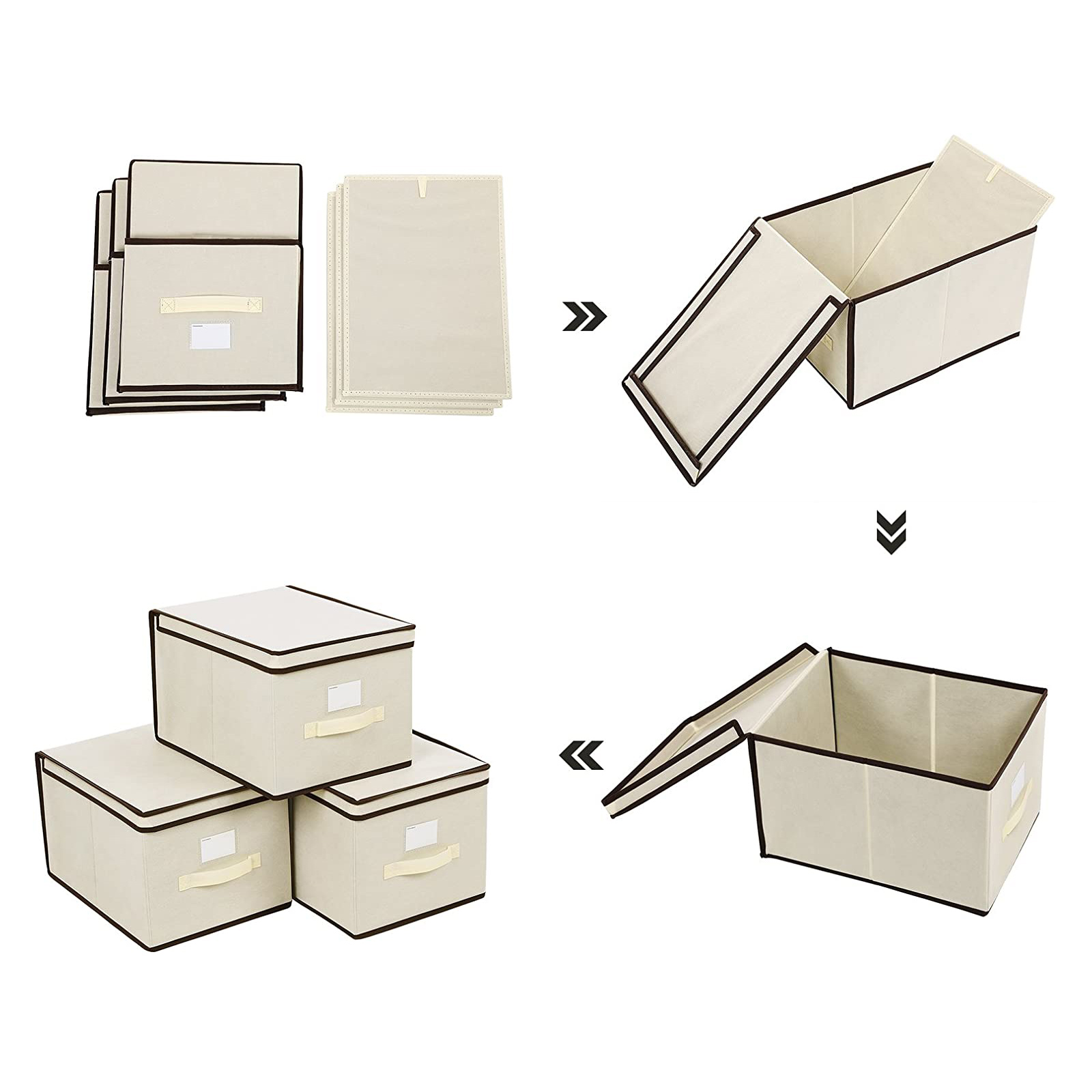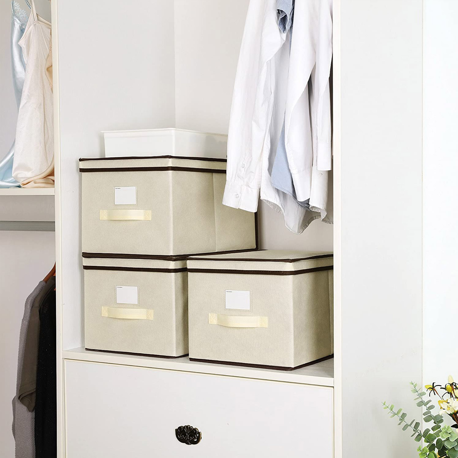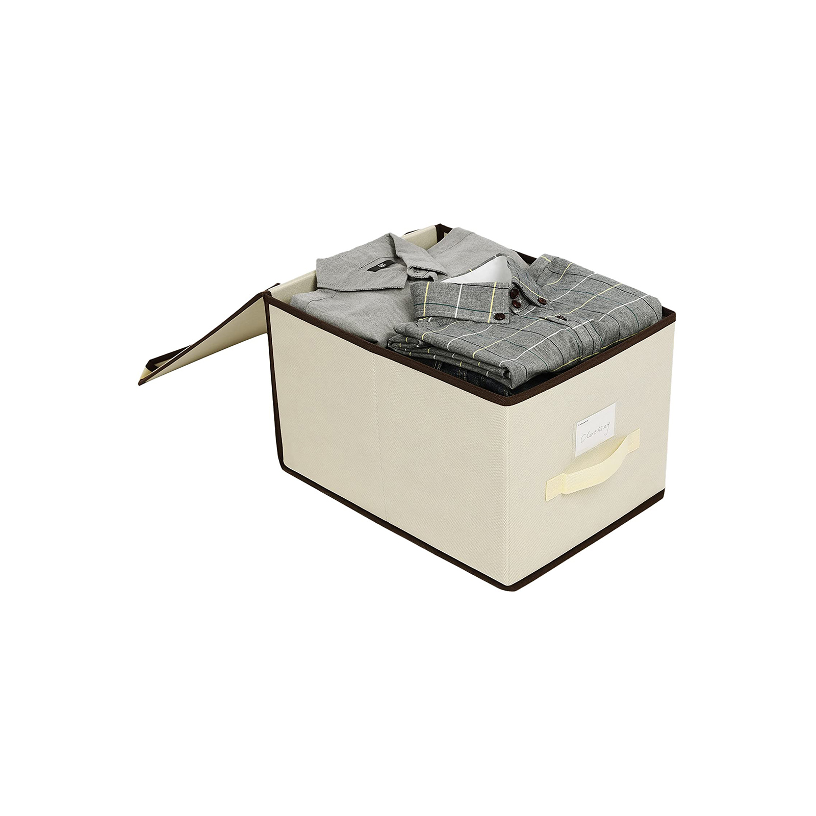Super rummelig kasse uden bund (m?l: 40 x 25 x 30 cm (B x H x D)) kan opbevare t?j, leget?j, magasiner osv. Gennemt?nkt m?rkat: Takket v?re PP-vinduet og de medf?lgende m?rkater kan du m?rke det opbevarede indhold, s? du hurtigt kan finde de opbevarede genstande.H?ndtagene p? begge sider g?r kassen nem at b?re.N?r den ikke er i brug, kan kasserne nemt foldes sammen og opbevares pladsbesparende. Produktdetaljer: Farve: beige Materiale: Vliesstof, karton M?l: 40 x 25 x 30 cm (B x H x D) V?gt: 3,1 kg / s?t Leveringsomfang: 3 x opbevaringskasse Bem?rkninger:Det kan v?re, at varen lugter “nyt”, n?r den pakkes ud. Denne lugt er ikke skadelig og forsvinder efter et par timer, hvis den luftes ud. Vaskes ikke med vand. Ved pletter og snavs t?rres overfladen af med en let fugtig klud og t?rres derefter p? et luftigt sted.