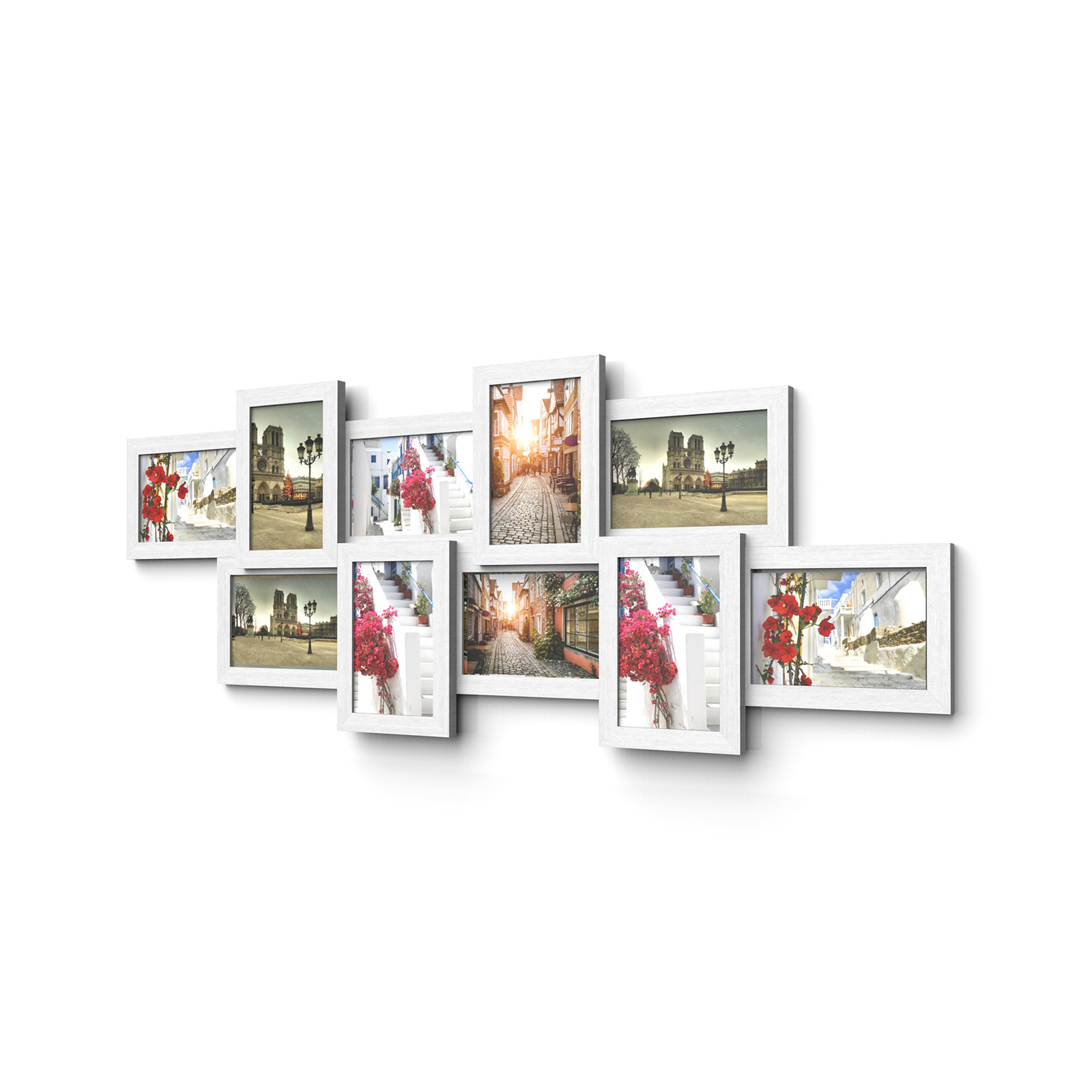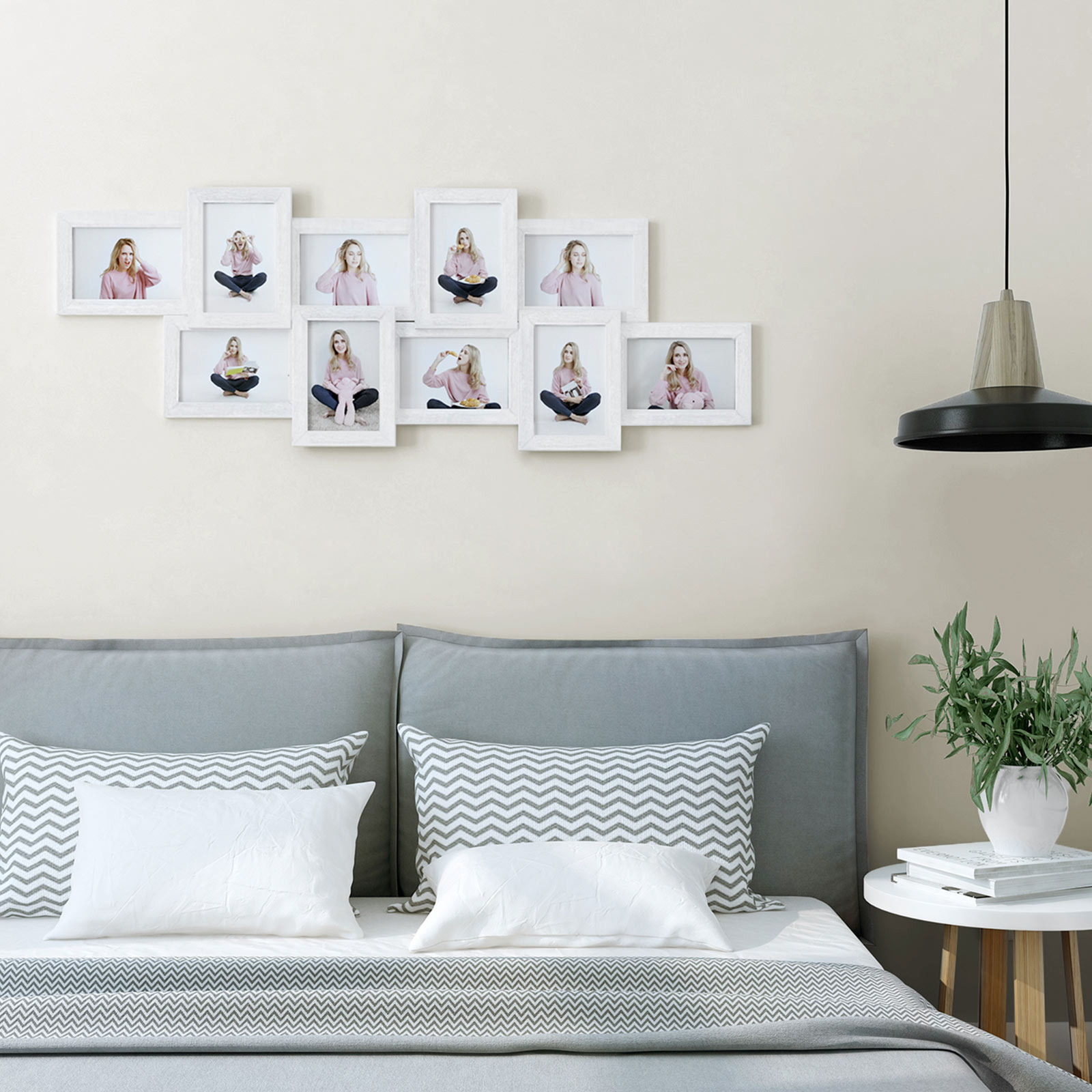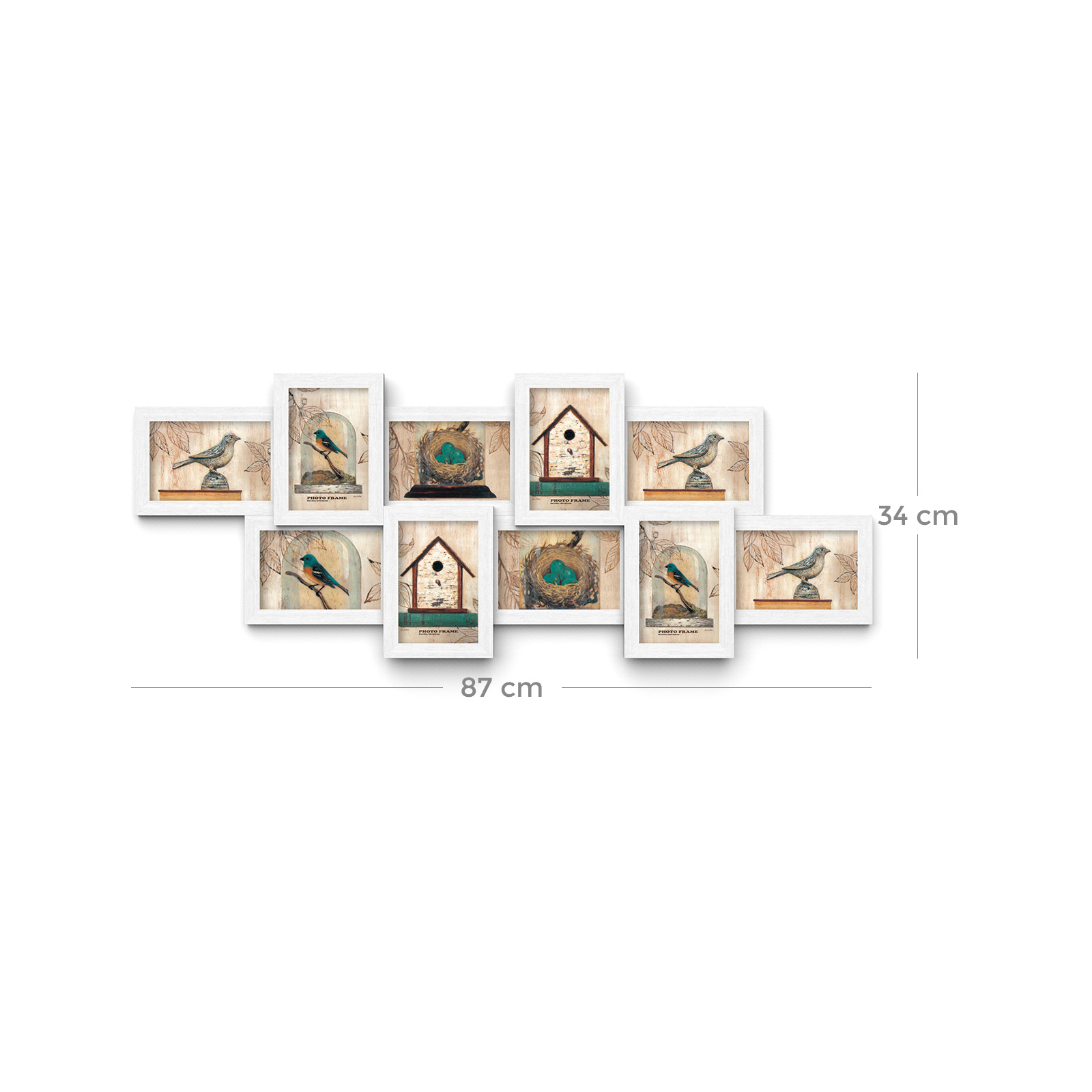 Fyld denne ramme med dine yndlingsfotos og h?ng den op. Billedrammen med tr?struktur vil pynte din v?g og altid minde dig om de smukke ?jeblikke. Produktdetaljer: – M?l: 87 x 34 cm – Tykkelsen p? MDF-pladen: 1,2 cm – Rammebredde: 1,8 cm – Tykkelsen p? billedd?kslet af PS: 1 mm – Farve: hvid; sort Leveringsomfang: – 1 x billedramme til 10 fotos – 1 x vejledning – 1 x beslagspose SONGMICS Bem?rkninger: – F?r brug skal du fjerne beskyttelsesfolien p? begge sider af billedd?kslerne af PS. – Samling b?r ikke foreg? p? en ru overflade for at undg? ridser. – Billedrammen best?r af flere dele, som skal samles.