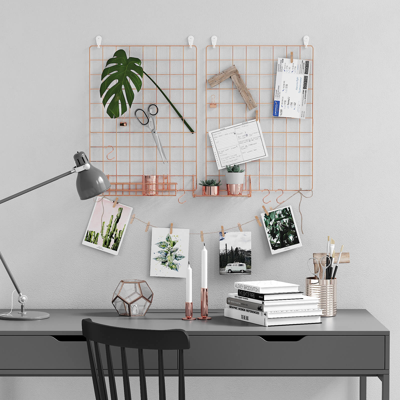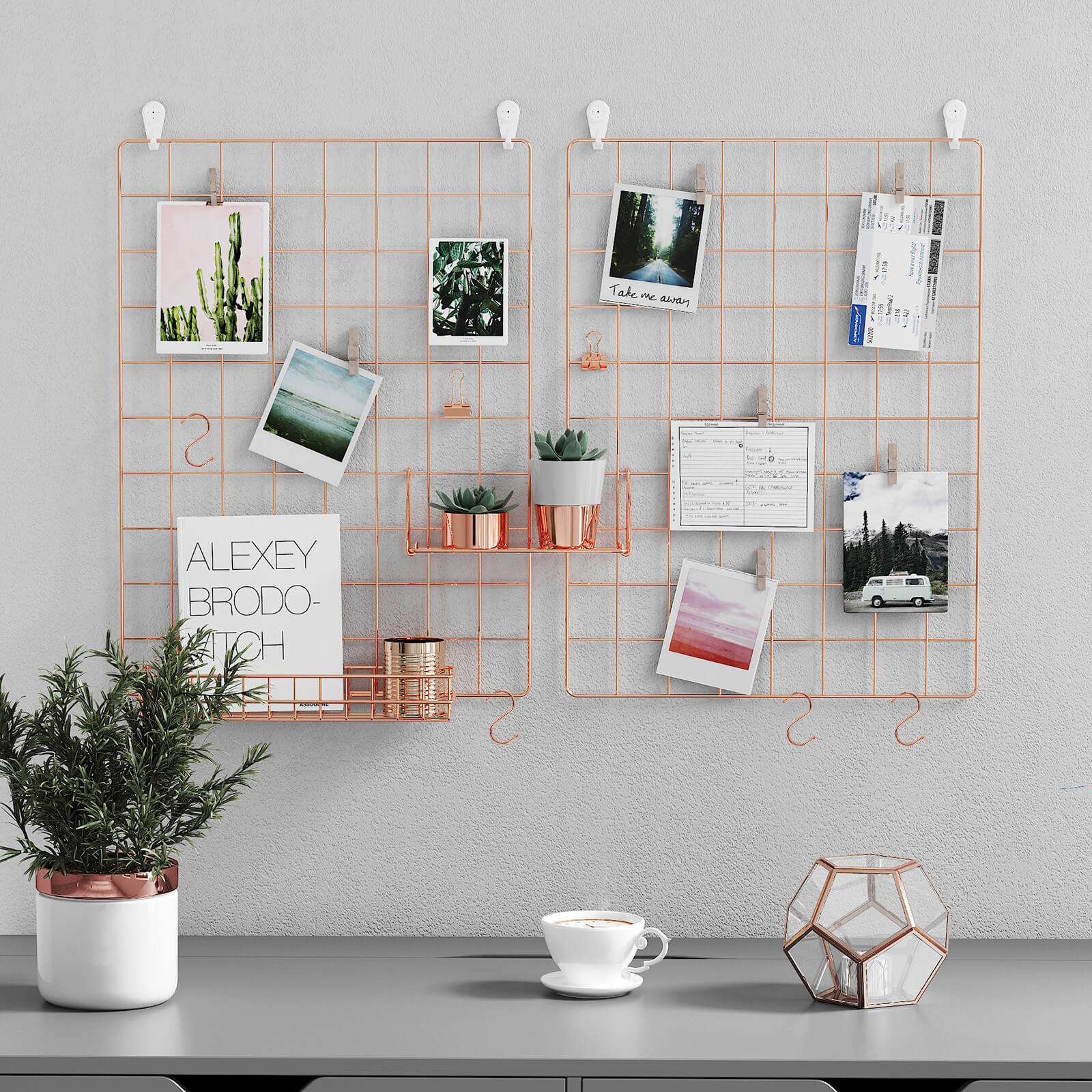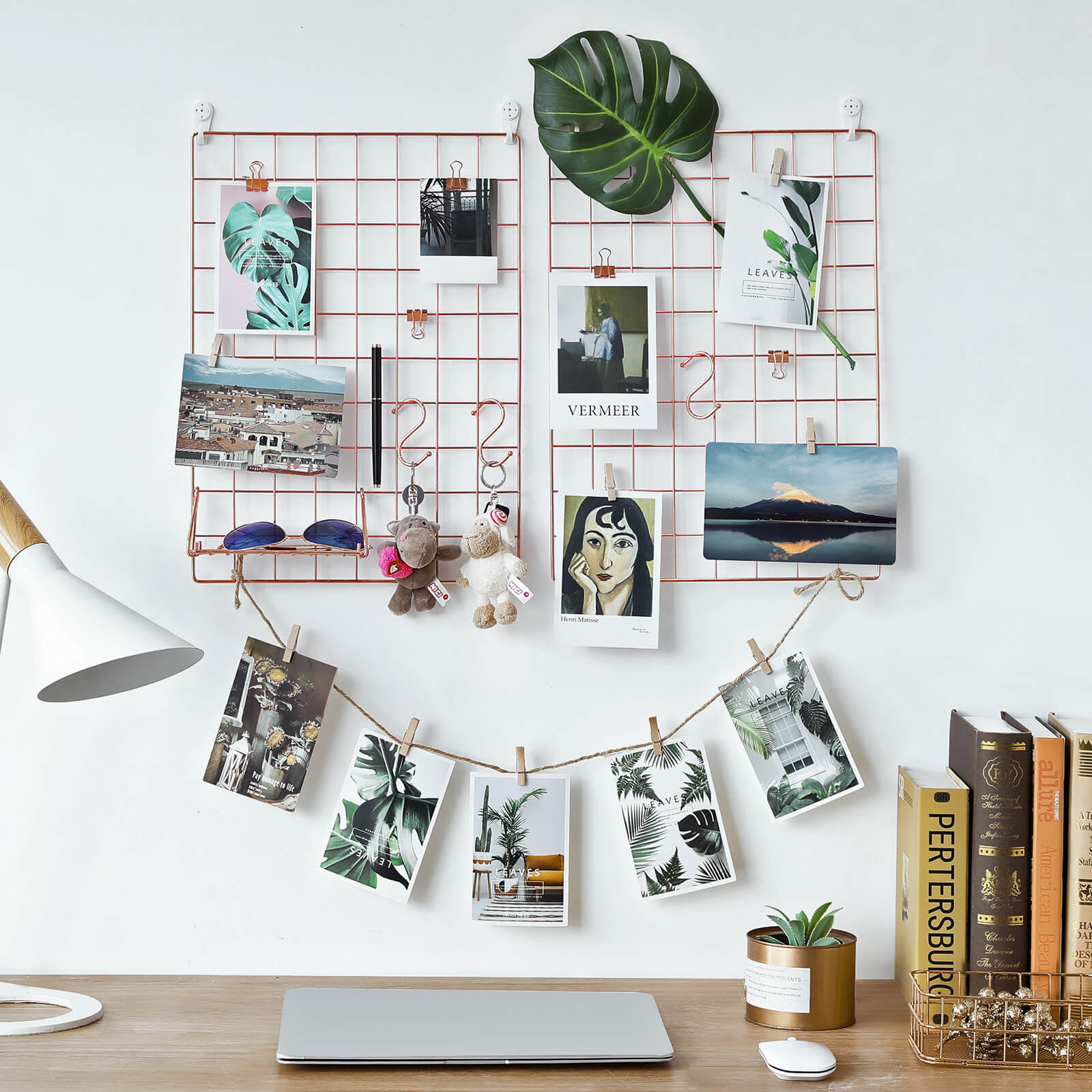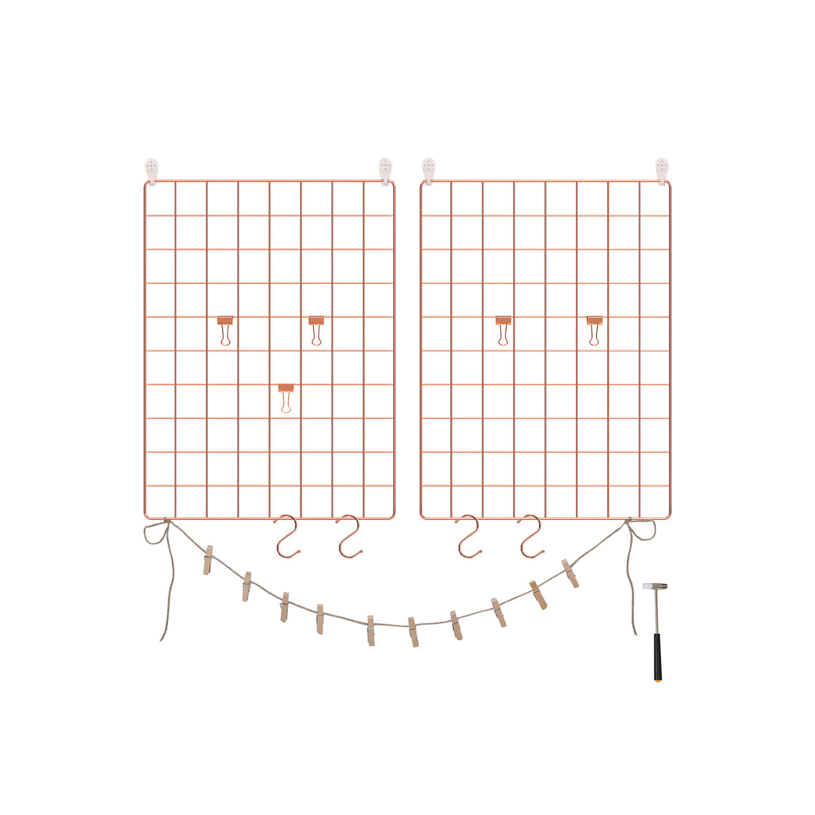 Til de sm?, men vigtige ting i livet Forsvinder dine regninger og kvitteringer altid p? uforklarlig vis? Overskrider du hele tiden deadlines for dine projekter? S? har du brug for en opslagstavle, hvor du kan h?nge regninger, vigtige noter eller andre sm?ting. En gave til dine k?re eller dig selv G?r denne gitterv?g til en f?dselsdagsgave, julegave eller en “bare fordi jeg elsker dig”-gave, og skab et unikt udstillingsomr?de for fotos, der minder dig og dine k?re om de gode stunder, I har haft sammen. Men hvis du ogs? personligt kan lide denne stilfulde v?ghylde, hvorfor s? ikke bare fork?le dig selv med den? Produktdetaljer: – Farve: Ros?guld – Materiale: Jern – St?rrelse p? hver plade: 42 x 31 cm – L?ngde p? hampesnor: 1 m – V?gt: 0,75 kg – B?reevne: 5 kg Leveringsomfang: – 2 x gitterplade – 4 x S-kroge – 1 x hampesnor – 5 x metalklemmer i rosaguld – 10 x tr?klemmer – 4 x sporl?se v?gkroge – 1 x hammer (19 cm) – 1 x vejledning (DE, EN, FR, ES, IT) SONGMICS Bem?rkninger: – Opbevar produktet utilg?ngeligt for b?rn og k?ledyr. – H?ng ikke genstande, der vejer mere end 5 kg, p? pladerne.