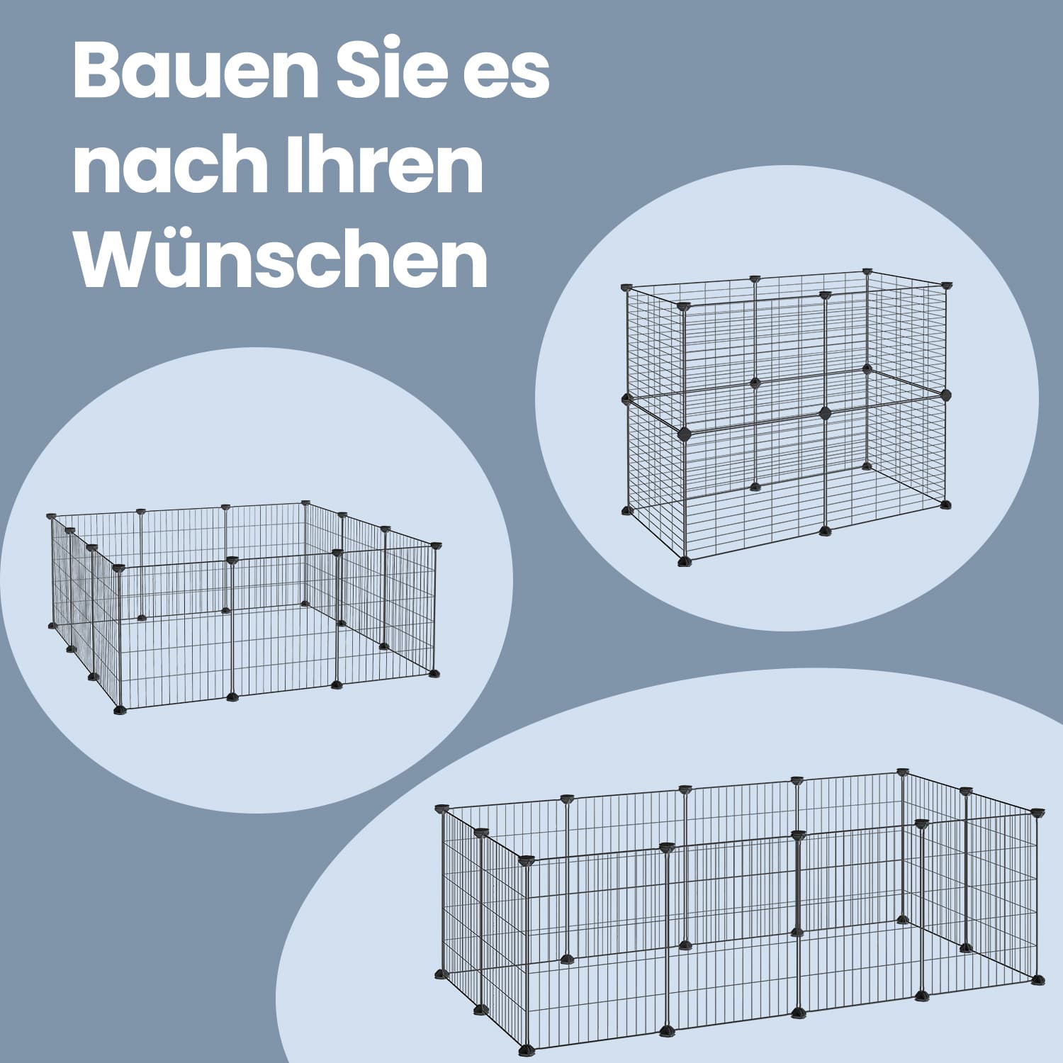 N?r dine k?ledyr har det godt, vil de over?se dig med k?rlighed. Brug derfor denne udend?rs indhegning fra SONGMICS til at give dit k?ledyr en ?ben, rummelig og alligevel godt beskyttet legeplads. S? vil din lille pelsbold f?le sig elsket og kan boltre sig frit. K?ledyr er familiemedlemmer med behov: Den udend?rs indhegning, vi har designet, kan tilpasses dit k?ledyrs behov. Du kan sammens?tte de 12 gitterplader og 24 ABS-plastikkoblinger til forskellige former. Placer leget?j, en k?ledyrs seng og en sk?l med vand i indhegningen og skab et kongerige for dit k?ledyr.En sikkerhedszone for din elskede: De h?jkvalitative ABS-samlinger giver gitterburet en h?j grad af stabilitet. For at ?ge stabiliteten yderligere medf?lger der 40 kabelbindere, som forhindrer, at hegnet kollapser under brug.G?r din firbenede ven glad med denne k?ledyrspark fra SONGMICS og giv ham det hjem, han altid har dr?mt om! Produktdetaljer: Farve: Sort Materiale: Gitterelementer af metal, plastforbindelsesstykker Samlet st?rrelse: 143 x 73 x 46 cm (L x B x H)St?rrelse pr. gitterelement: 35 x 45 cm (L x H)V?gt: 3,9 kgLeveringsomfang:12 x metalgitterplader24 x plastforbindelsesstykker1 x gummihammer12 x skridsikre puder40 x kabelbindere1 x vejledning (DE, EN, FR, ES, IT)SONGMICS Bem?rkninger:L?g venligst en m?tte eller lignende p? gitterpladerne, der fungerer som l?beflade, for at sk?ne dine k?ledyrs poter. Undg? at sl? h?rdt p? produktet, n?r du bruger hammeren. Undg? at bringe produktet i kontakt med skarpe eller spidse genstande, s?t dig ikke p? l?beg?rden og hold den v?k fra varmekilder.Stil ikke produktet permanent udend?rs. S?rg for, at alle gitterelementer er skubbet helt ind i plastforbindelsesstykkerne under monteringen. Vi anbefaler, at du bruger skridsikre puder for at sikre en h?jere stabilitet af buret.