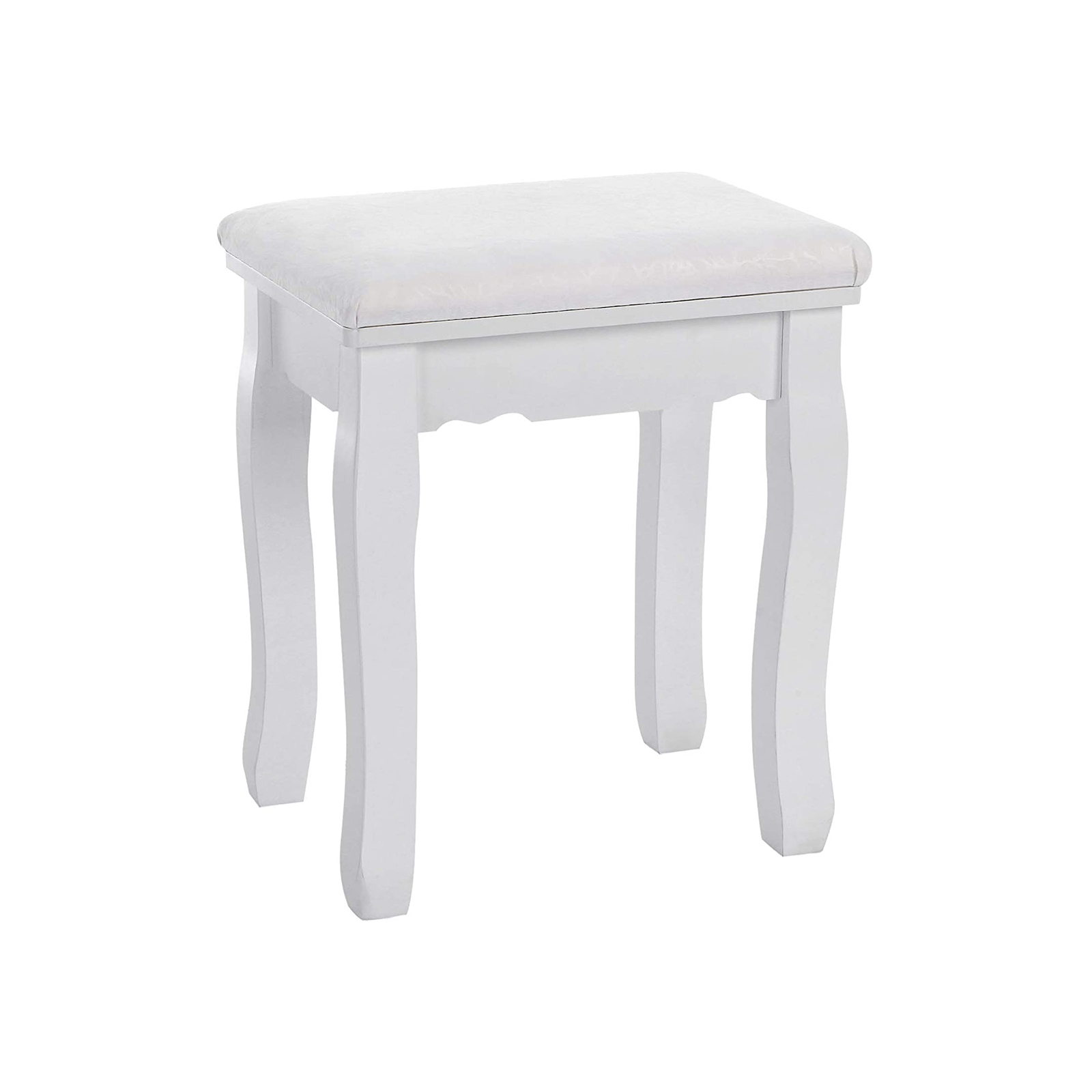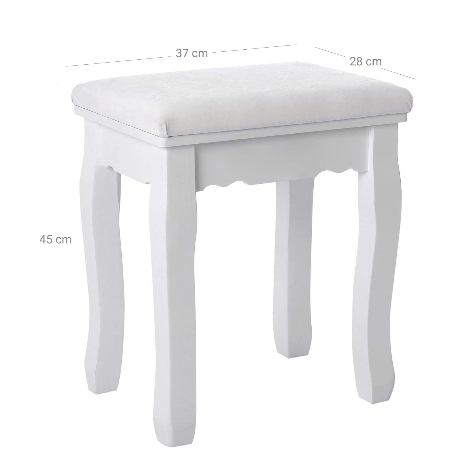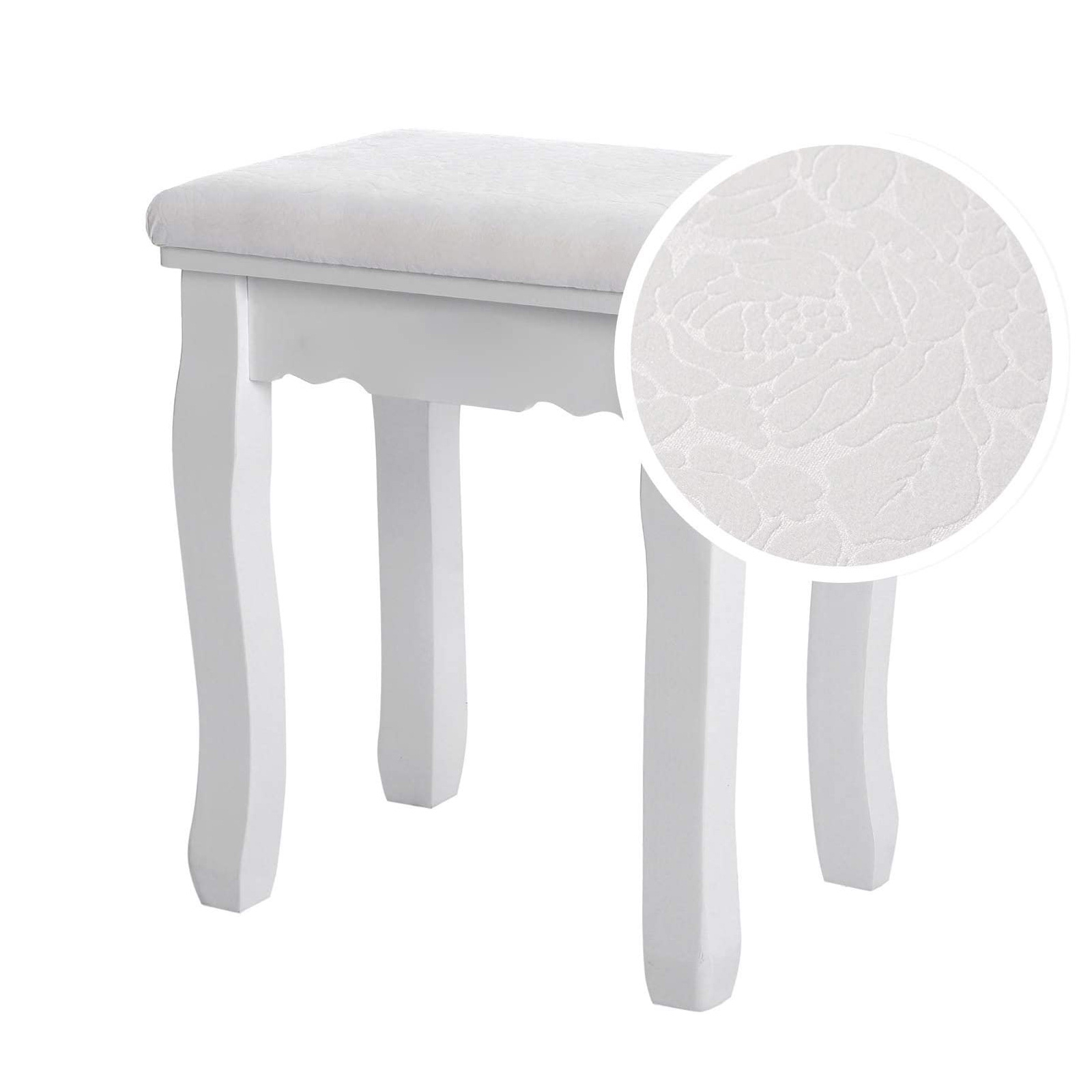 G?r dit sk?nhedsomr?de perfekt. G?r dit sk?nhedsomr?de ?re og udskift den ustabile campingstol, der har st?et foran dit toiletbord alt for l?nge, med denne charmerende polstret skammel. Dens elegant buede ben og det smukke rosenm?nster er det l?nge s?gte supplement til dit romantiske toiletbord. Lille, men st?rk! Denne makeupskammel ser m?ske lille og enkel ud. Men den har masser af power: Takket v?re de 4 ben i massivt tr? og den stabile MDF-s?deflade kan skamlen b?re op til 130 kg. Den tykke skumpolstring sikrer desuden h?j siddekomfort.Produktdetaljer: Farve: Hvid Materiale: Massivt tr? + MDF (medium densitet tr?fiberplade) klasse E1 St?rrelse: 45 x 37 x 28 cm Tykkelsen p? taburetbenene: 3,9 cm Maks. statisk belastning: 130 kg Leveringsomfang: 1x polstret taburet 1x monteringsvejledning (DE, FR, GB, ES, IT)