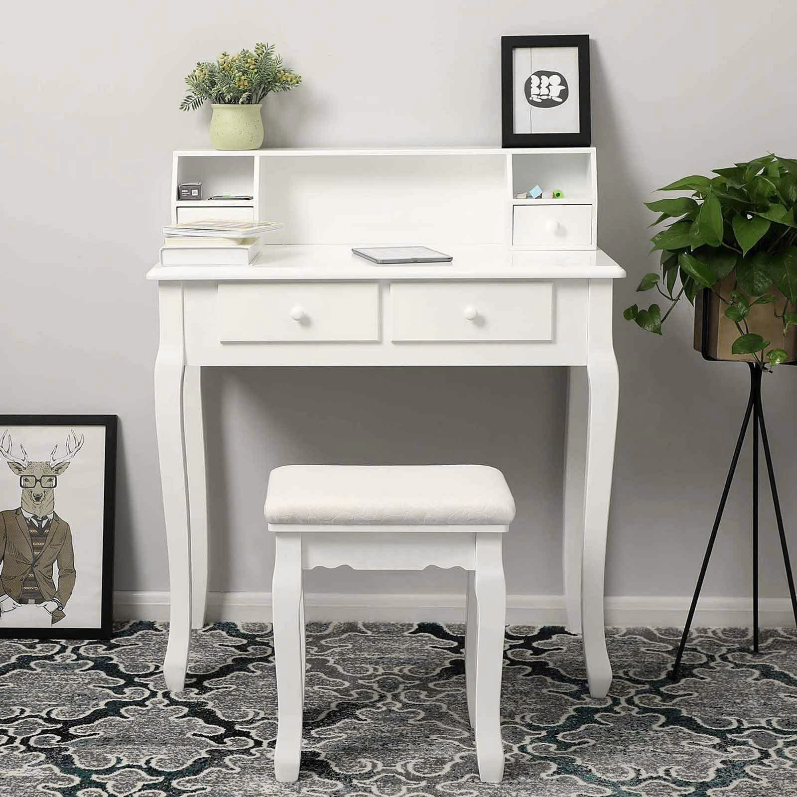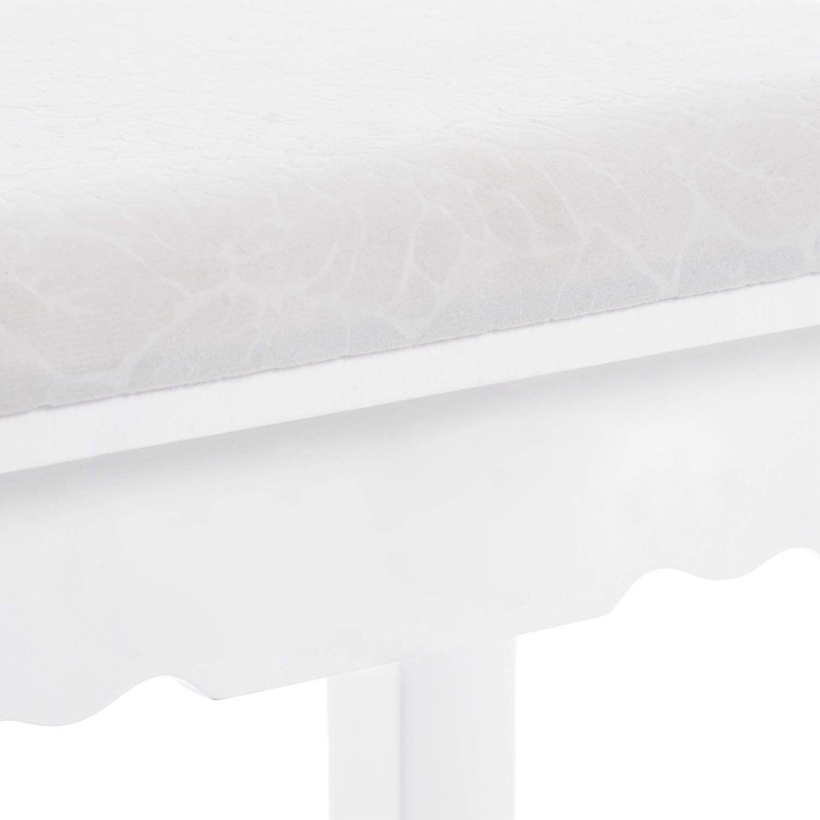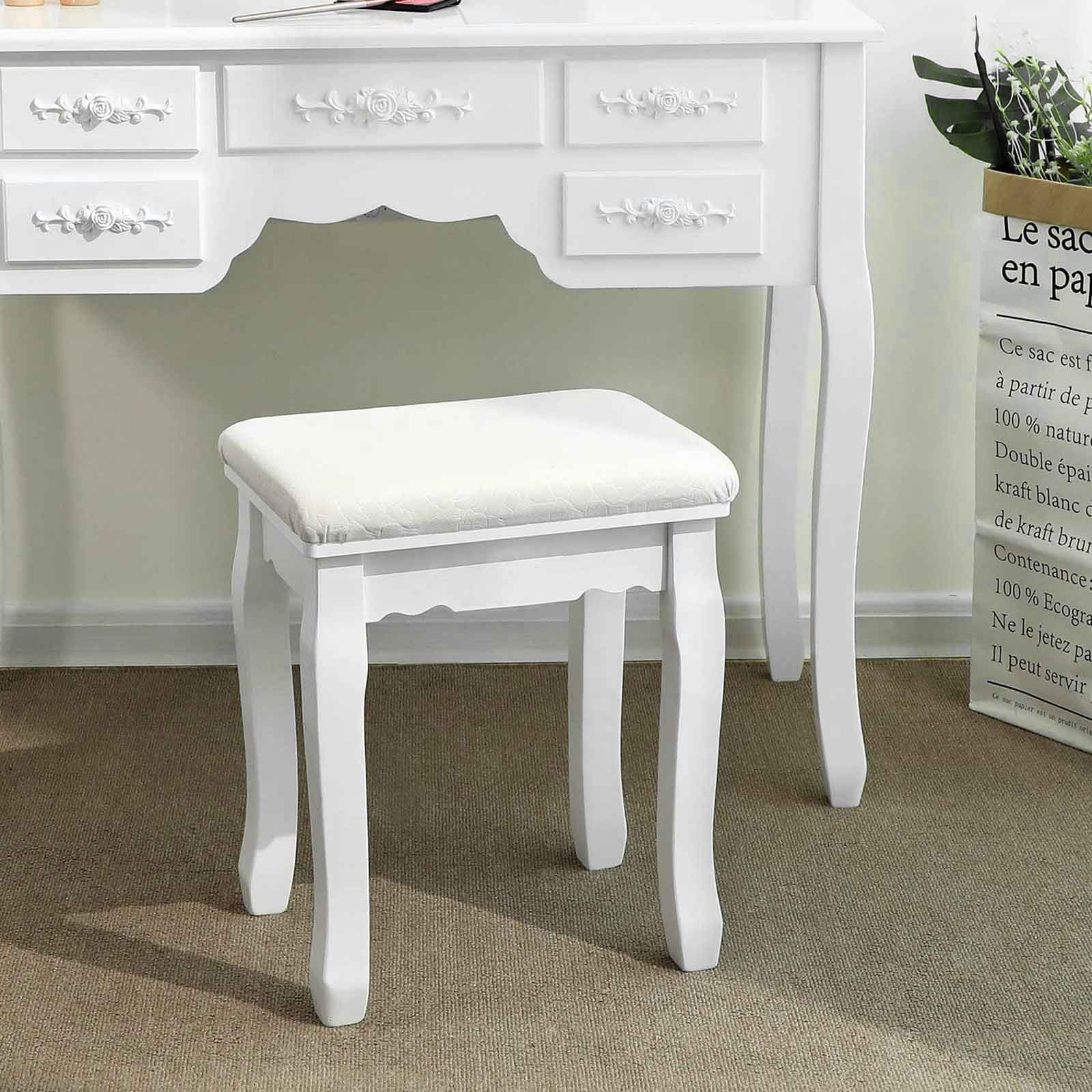 G?r dit sk?nhedsomr?de perfekt. G?r dit sk?nhedsomr?de ?re og udskift den ustabile campingstol, der har st?et foran dit toiletbord alt for l?nge, med denne charmerende polstret skammel. Dens elegant buede ben og det smukke rosenm?nster er det l?nge s?gte supplement til dit romantiske toiletbord. Lille, men st?rk! Denne makeupskammel ser m?ske lille og enkel ud. Men den har masser af power: Takket v?re de 4 ben i massivt tr? og den stabile MDF-s?deflade kan skamlen b?re op til 130 kg. Den tykke skumpolstring sikrer desuden h?j siddekomfort.Produktdetaljer: Farve: Hvid Materiale: Massivt tr? + MDF (medium densitet tr?fiberplade) klasse E1 St?rrelse: 45 x 37 x 28 cm Tykkelsen p? taburetbenene: 3,9 cm Maks. statisk belastning: 130 kg Leveringsomfang: 1x polstret taburet 1x monteringsvejledning (DE, FR, GB, ES, IT)