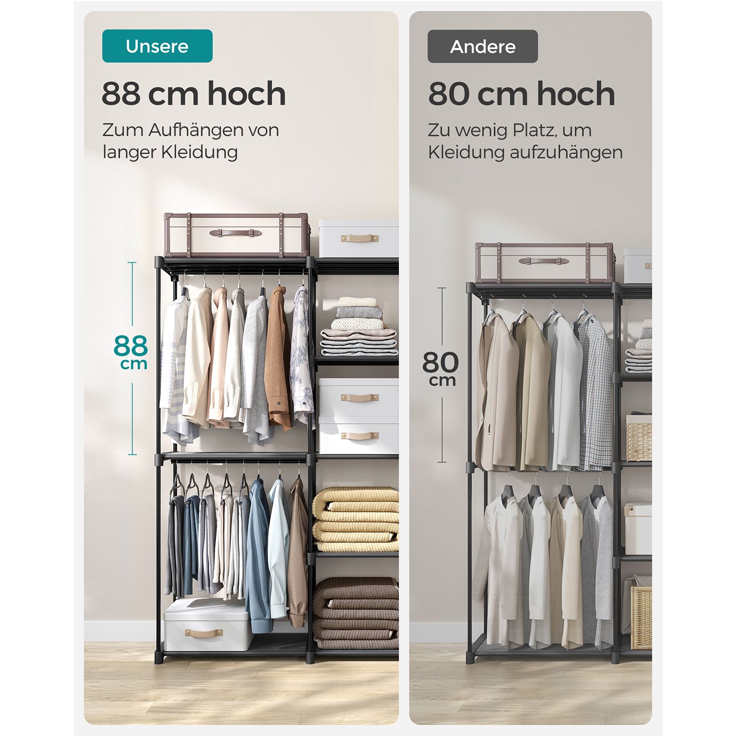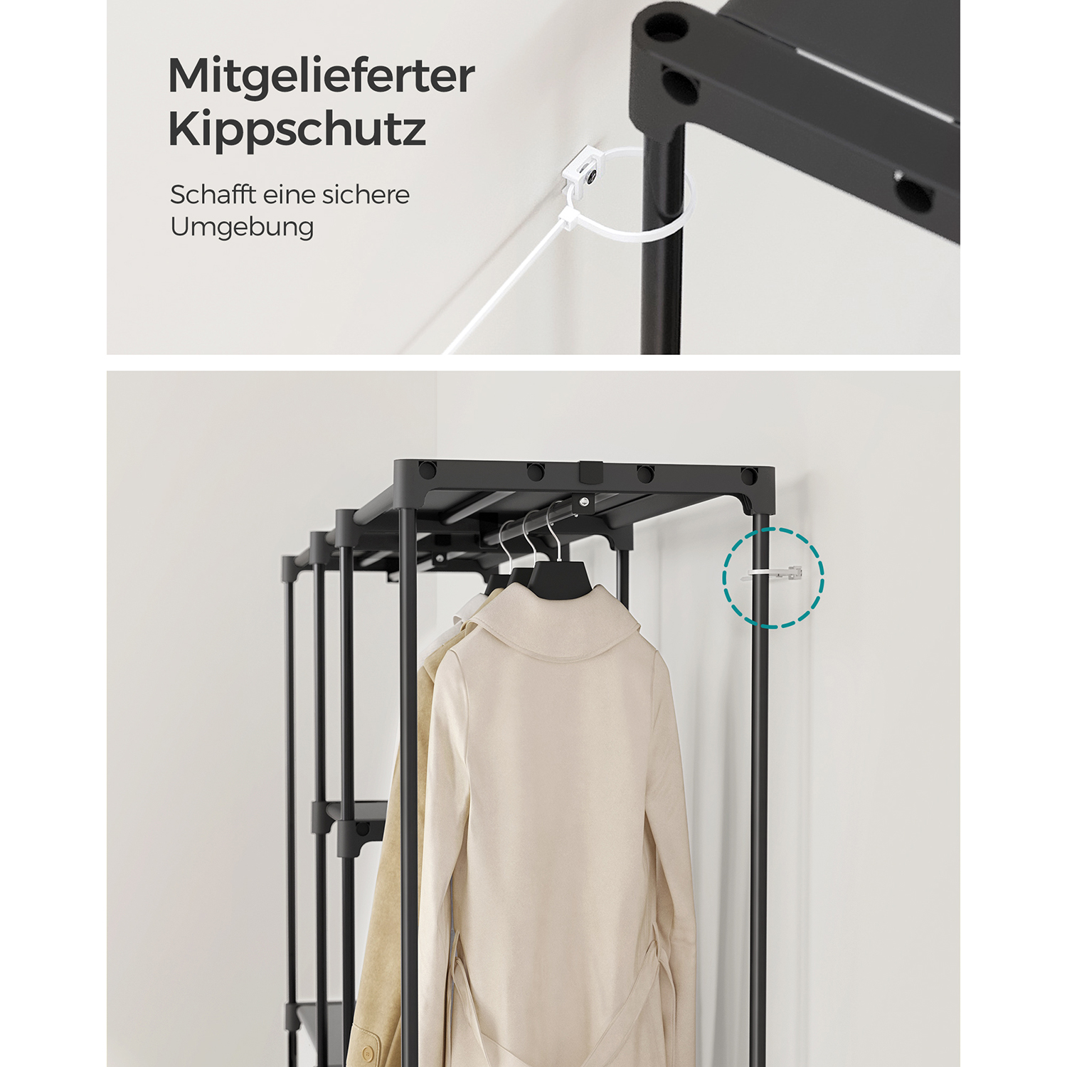 SONGMICS kl?deskab, t?jstativ, fritst?ende garderobe, med t?jst?nger, garderobestativ, stofhylder, metalramme, 43 x 182 x 182 cm, sort RYG037B02