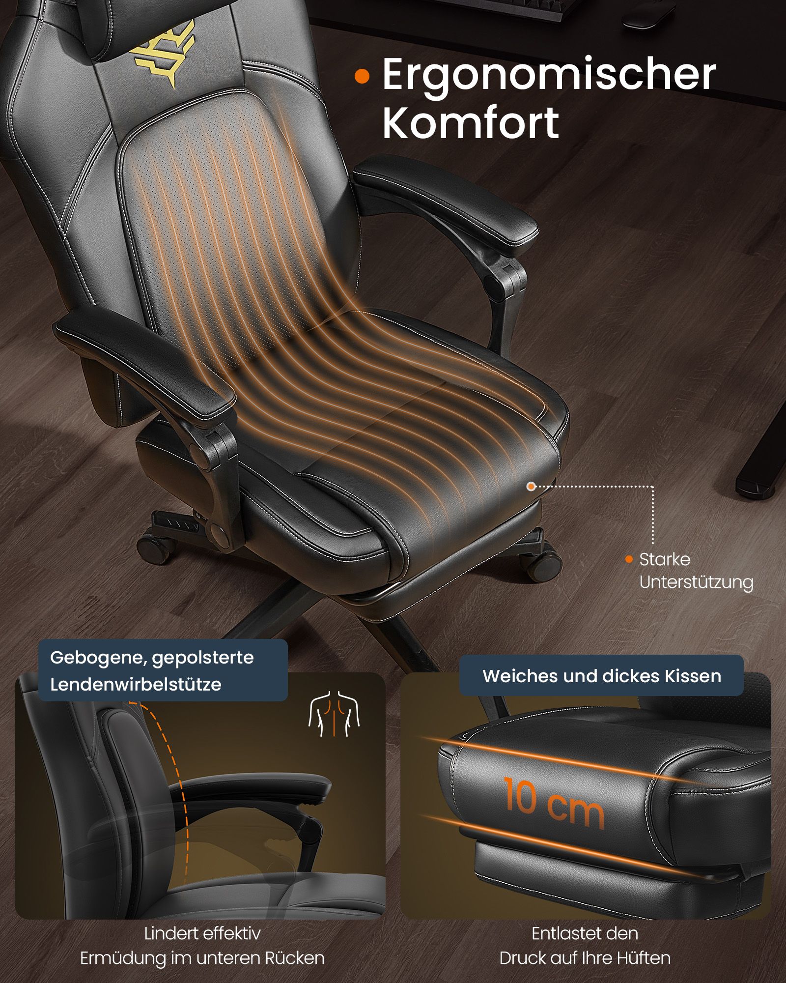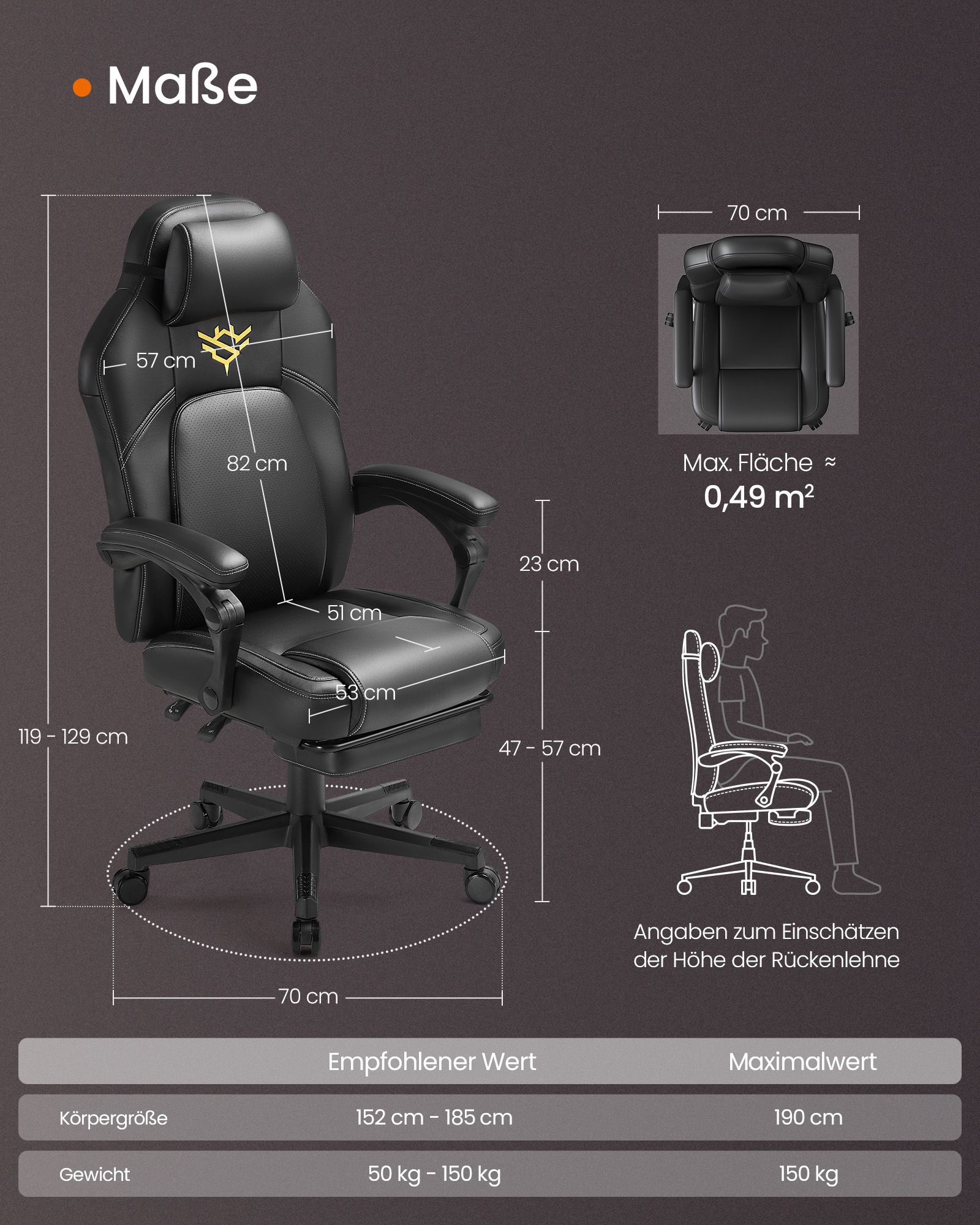SONGMICS HOME Gaming-stol, ergonomisk computerstol med fodst?tte, kontorstol, drejestol med hovedpude, PU, h?jdejusterbar, bl?ksort OBG072B01