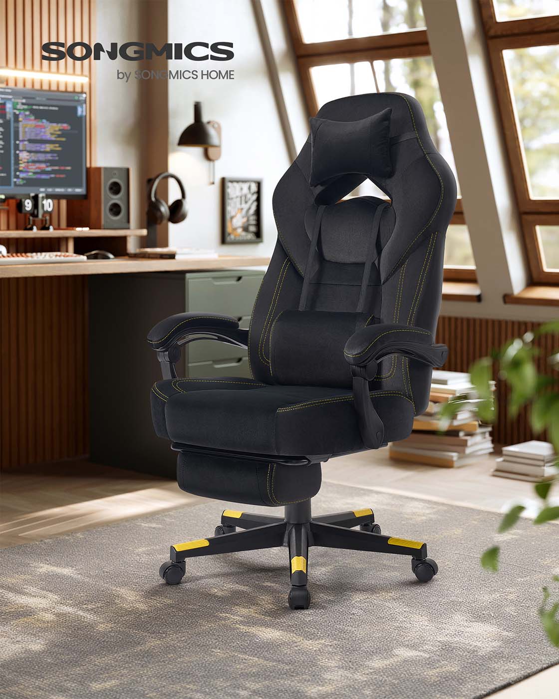 SONGMICS Gaming-stol, kontorstol med fodst?tte, skrivebordsstol, ergonomisk design, justerbar nakkest?tte, l?ndest?tte, belastbar op til 150 kg, sort-r?d OBG77BR