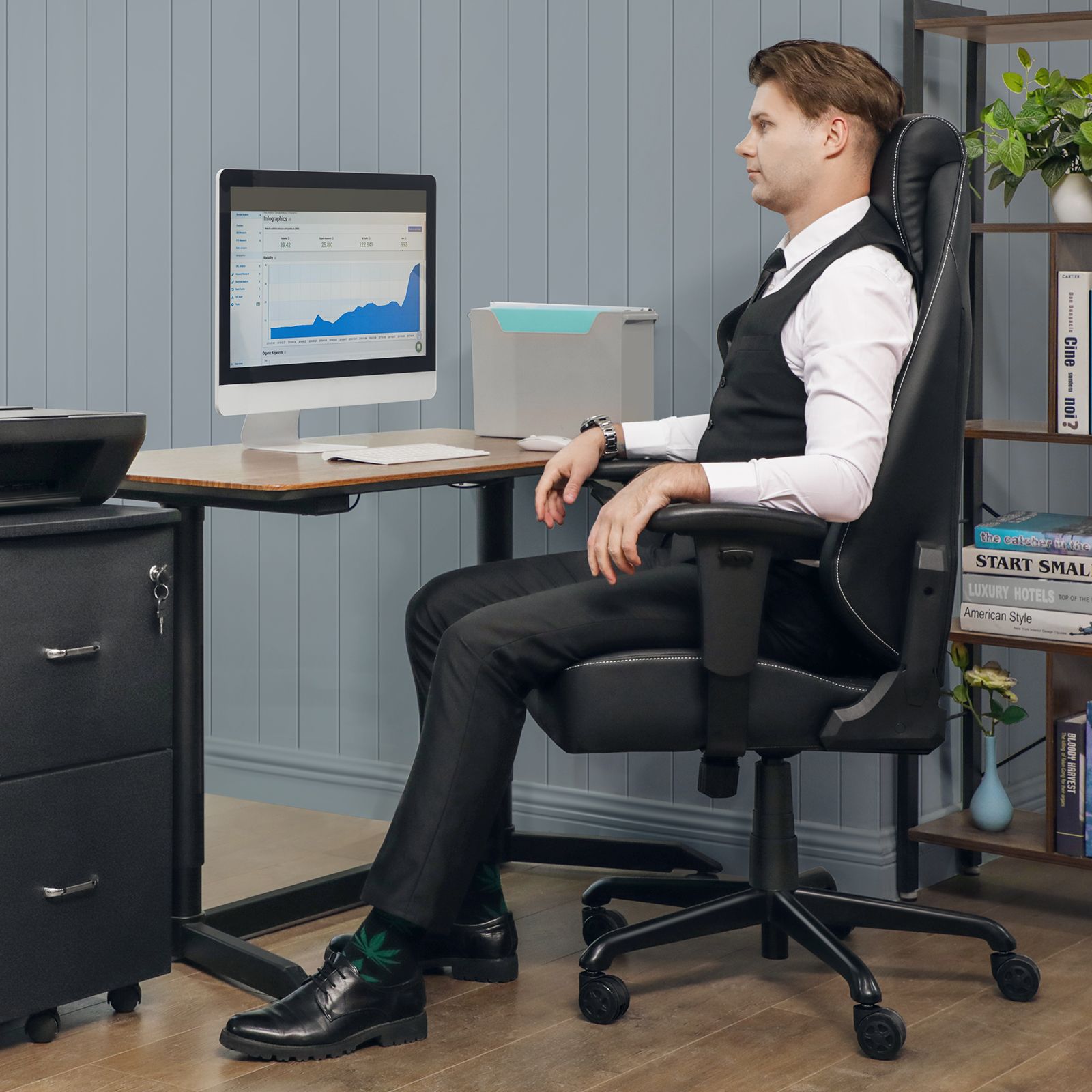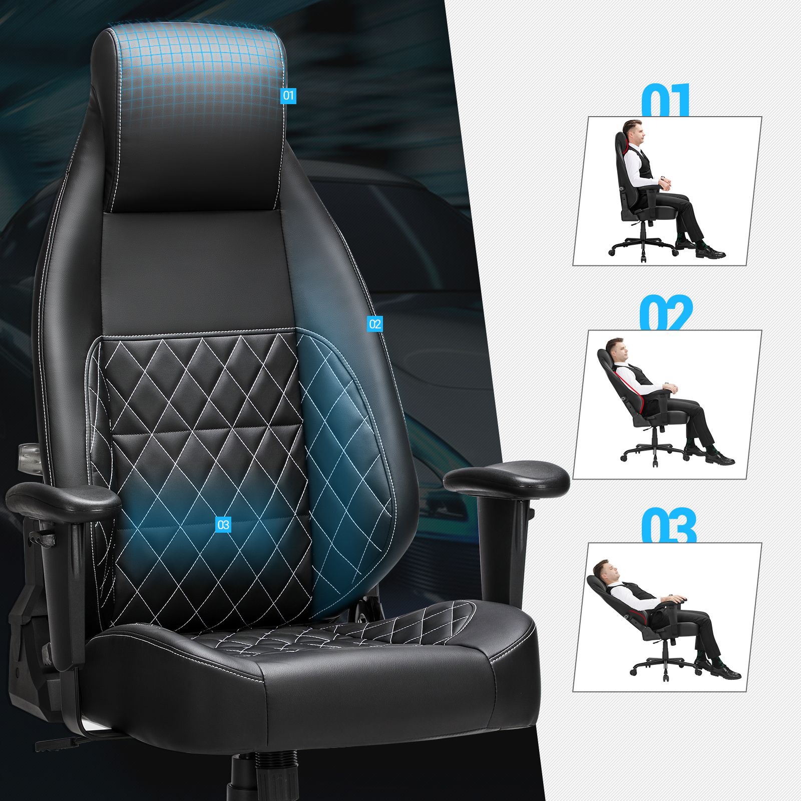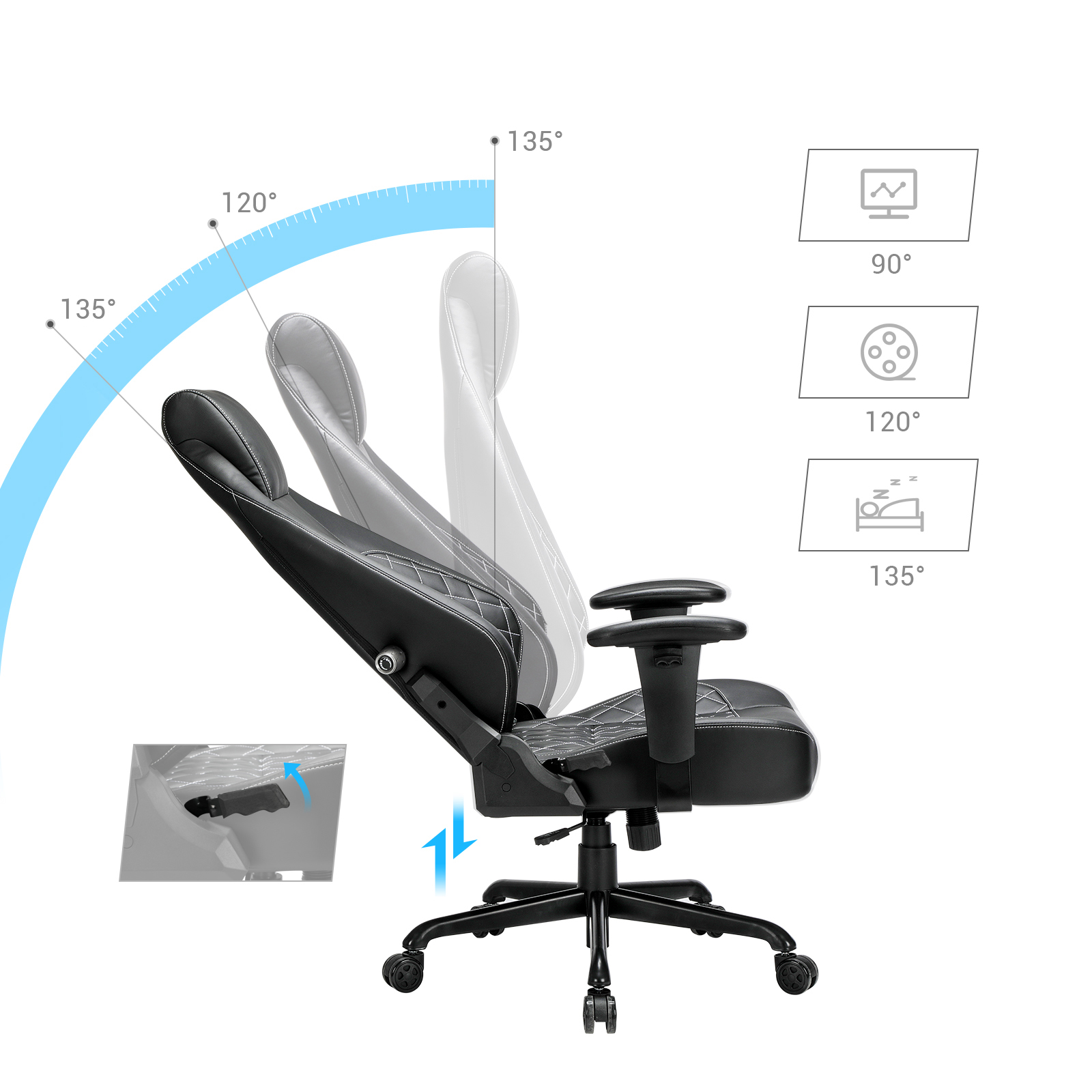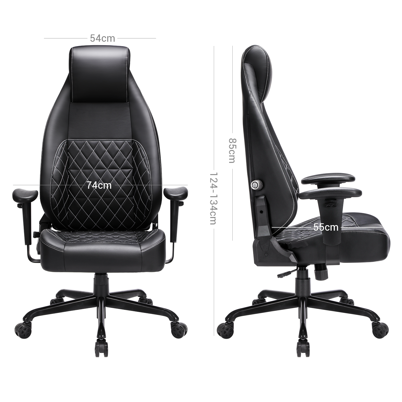 SONGMICS Gaming-stol, kontorstol med justerbar l?ndest?tte, kunstl?der, bl?d nakkest?tte, tyk polstring, st?lfodkryds, sort RCG35BK