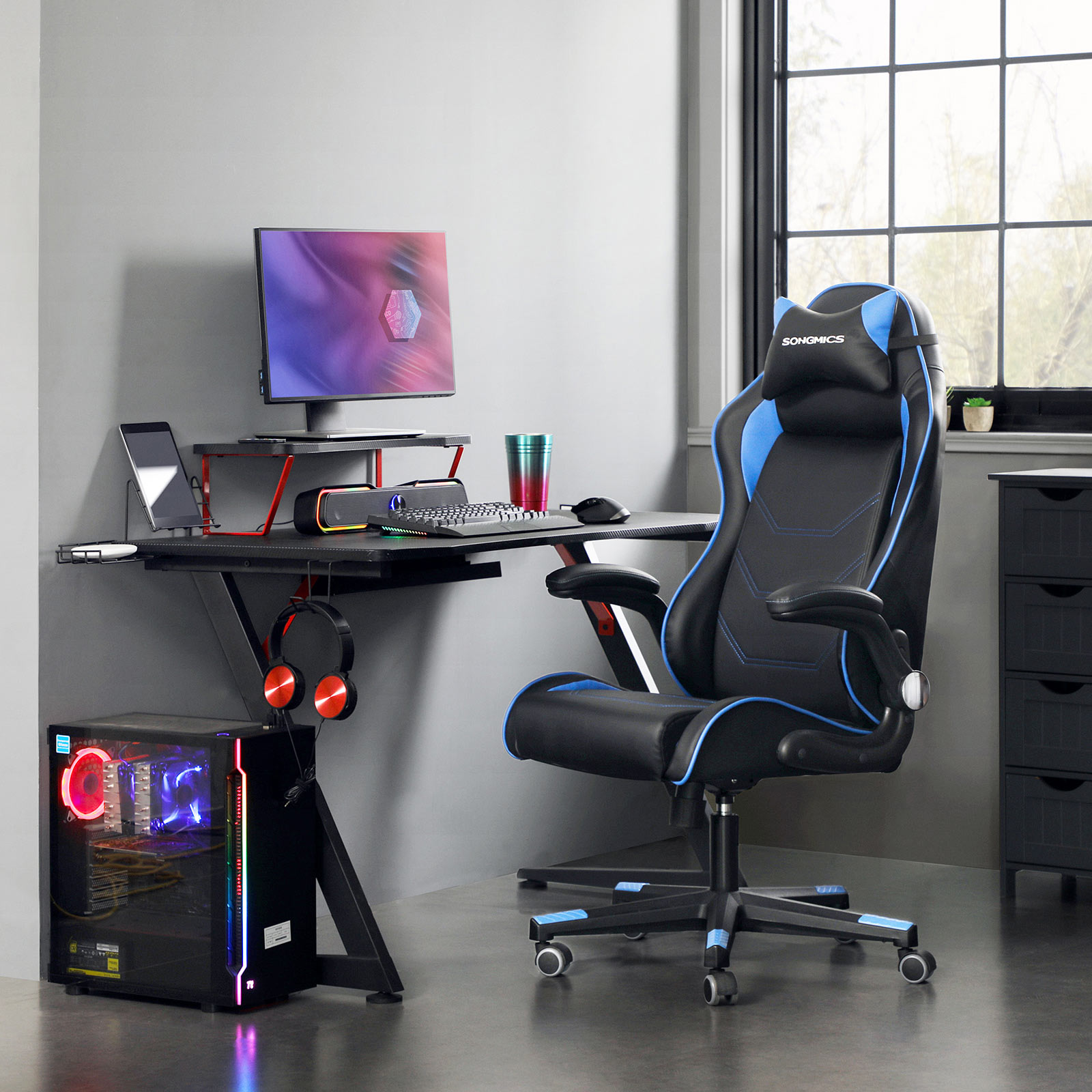 V?r en vinder: Hvis du vil v?re en ?gte gamingmester, har du ud over en hurtig computer, en mus og et tastatur ogs? brug for en racingstol i h?j kvalitet! Denne ergonomiske gamingstol har en h?j rygl?n, en stor s?deflade og en bl?d nakkest?tte, s? du kan game hele natten. Enkel montering: Er du bekymret for, at det vil v?re for sv?rt at samle denne kontorstol? Ingen panik! Takket v?re den forst?elige vejledning og det medf?lgende monteringsv?rkt?j kan stolen samles p? 15-20 minutter. Reservedele medf?lger. Produktdetaljer: Farve: Sort-bl? Materiale: H?jdensitets skum, st?l, PU-kunstl?der, PU-hjul St?rrelse: 65 x 79 x (120-130) cm (L x B x H) Rygl?nsh?jde: 83 cm Siddedybde: 48 cm Siddedybde: 42 cm Arml?nsh?jde fra s?defladen: 21,5 cm S?deh?jde fra gulvet: 48-58 cm Diameter p? fodkryds: 70 cm V?gt: 17,4 kg Maks. statisk belastning: 150 kg Leveringsomfang: 1 x gamingstol 1 x tilbeh?rspose 1 x vejledning (DE, EN, FR, ES, IT) SONGMICS Bem?rkninger: Denne stol har udelukkende en vippemekanisme. Her bev?ger s?det og rygl?net sig samtidigt bagud. Rygl?net kan ikke justeres separat bagud.