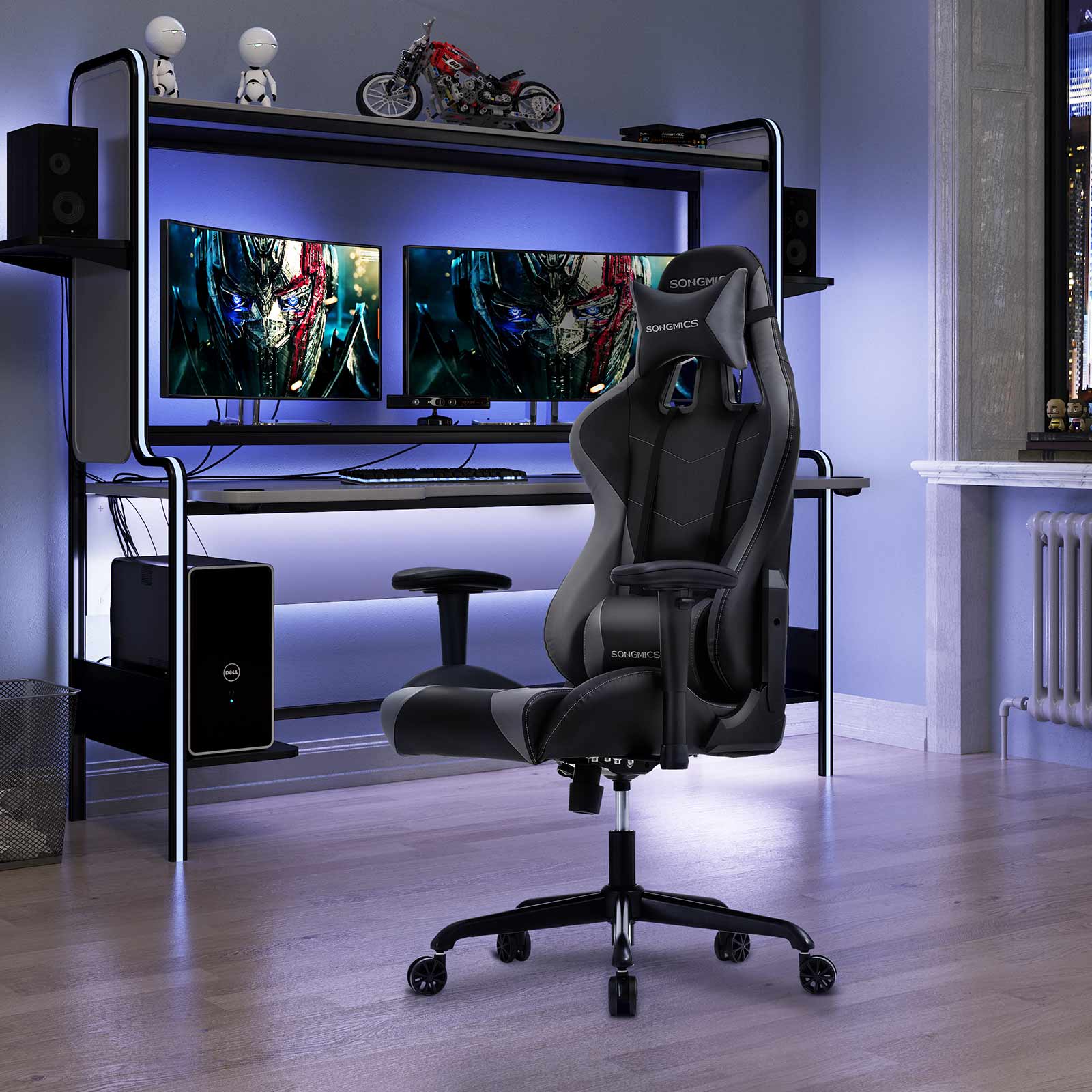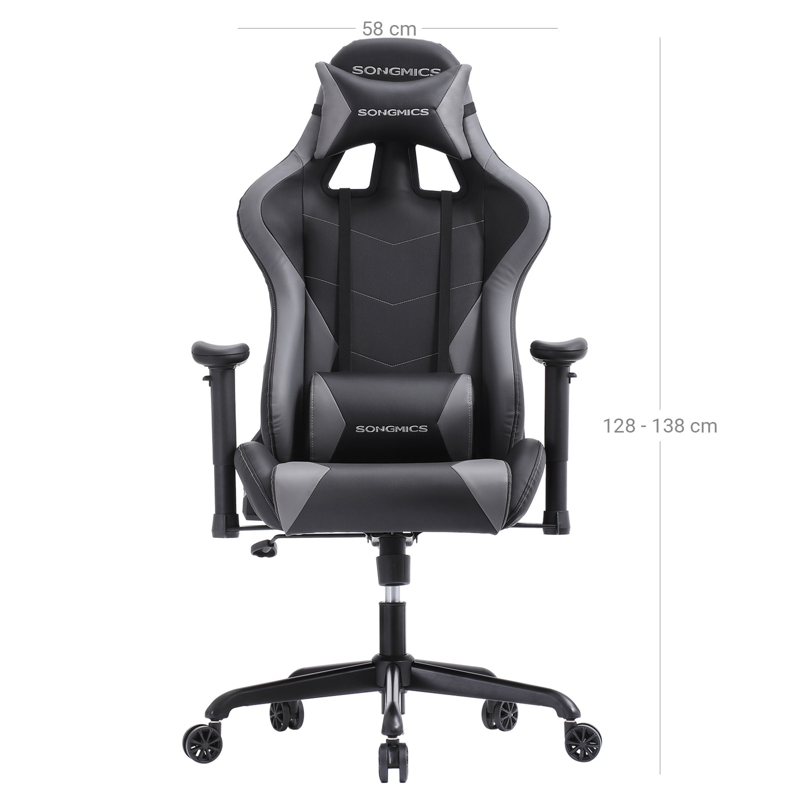 Produktbeskrivelse: Rollespil, first-person shooters, tower defense eller online poker ? hvilket computerspilgenre foretr?kker du? Uanset om du som magiker forhekser dine modstandere eller ivrigt venter p? en royal flush, hj?lper vores gamingstol dig p? vej mod sejren. H?j kvalitet, komfortabel, multifunktionel Takket v?re det ergonomiske design og s?det med formstabil skum kan du nyde den h?jeste komfort, selv n?r din medspiller igen er AFK i l?ngere tid. Derudover har computerstolen adskillige funktioner. Arml?nene kan bev?ges fleksibelt op, ned, til venstre og til h?jre. L?ndepuden er ogs? h?jdejusterbar. Desuden kan stolen vippes op til 135 grader bagud. Der er ogs? en vippemekanisme. Med denne gamer-stol f?r du desuden et slidst?rkt produkt med et stabilt st?lstel. Fodkrydset og rullerne er blevet underkastet flere tests af SGS for at bekr?fte komponenternes stabilitet og holdbarhed (certifikat nr. AJHL1801000030FT; indehaver: producent af rullerne) (certifikat nr. AJHL1811002706FT; indehaver: producent af fodkrydset).Produktdetaljer: – Farve: Sort, gr? – Materiale: H?jdensitetsrefleksskum, st?lstel p? s?de og fodkryds, betr?k af milj?venligt PU, hjul af nylon – St?rrelse: 69 x 71 x 128-138 cm (L x B x H) – V?gt: 22 kg – Maksimal belastning: 150 kg Leveringsomfang: – 1x gamingstol – 1x unbrakon?gle – 1x tilbeh?rspose – 1x vejledning (DE, EN, ES, FR, IT) SONGMICS Bem?rkninger: – V?r opm?rksom p? pilen p? undersiden af s?det, og saml stolen i overensstemmelse hermed. – S?t dig ikke p? stolens forkant. S? undg?r du at komme til skade, hvis stolen v?lter.