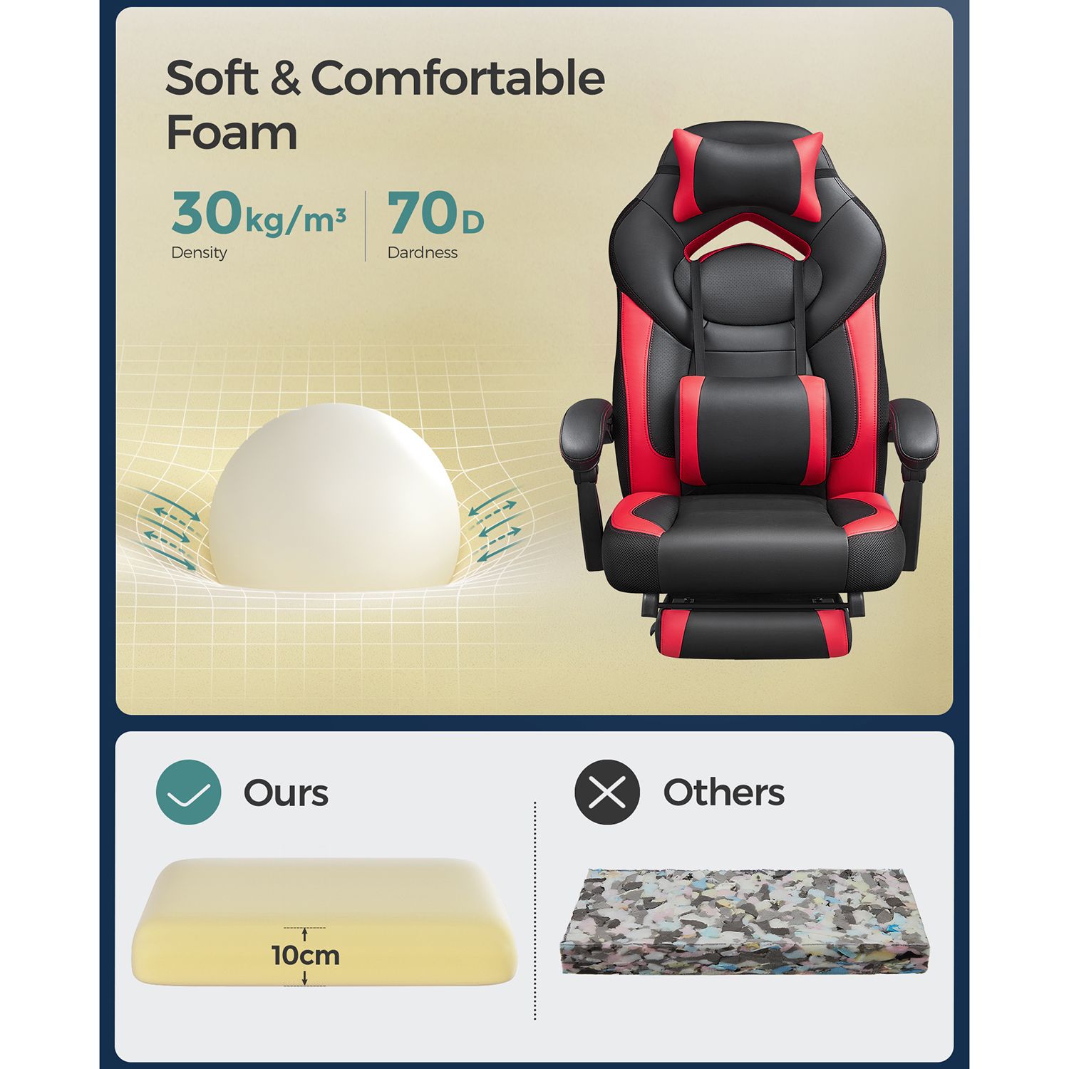 Det bedste til de bedste: Hvis du vil v?re den bedste i den virtuelle verden, har du brug for det rigtige udstyr i den virkelige verden. Et ideelt gaming-setup indeholder ikke kun en kraftig CPU eller grafikkort ? det er ogs? vigtigt at have passende tilbeh?r som en mus, et tastatur og ja, ogs? en gaming-stol. Denne racing-stol fra SONGMICS er designet til at give dig mulighed for at yde dit bedste og give dig en AAA-gaming-oplevelse til indie-priser.Overlegen komfort: Denne kontorstol tilbyder et samlet pakke best?ende af en l?ndepude, en S-formet rygl?n og en justerbar og aftagelig nakkest?tte. Alle disse elementer arbejder sammen for at sikre perfekt siddekomfort p? denne gaming-stol, der kan b?re op til 150 kg, mens dit adrenalin stiger, n?r du gamer.L?n dig tilbage: Hvis du ikke vil spille, men bare l?ne dig tilbage og se en film, kan du justere rygl?net mellem 90? og 135? og tr?kke fodst?tten ud ? slap af i den mest komfortable position!Produktdetaljer:Farve: Sort-r?dMateriale: Kunstl?der, skum, nylonSt?rrelse: 70 x 64 x (120-128) cm (L x B x H)V?gt: 20,5 kgMaks. statisk belastning: 150 kgLeveringsomfang:1 x kontorstol1 x ekstra rulle1 x tilbeh?rspose1 x vejledningSONGMICS Bem?rkninger:Undg? at uds?tte produktet for intens sollys i l?ngere tid.Hold produktet v?k fra skarpe og spidse genstande.
