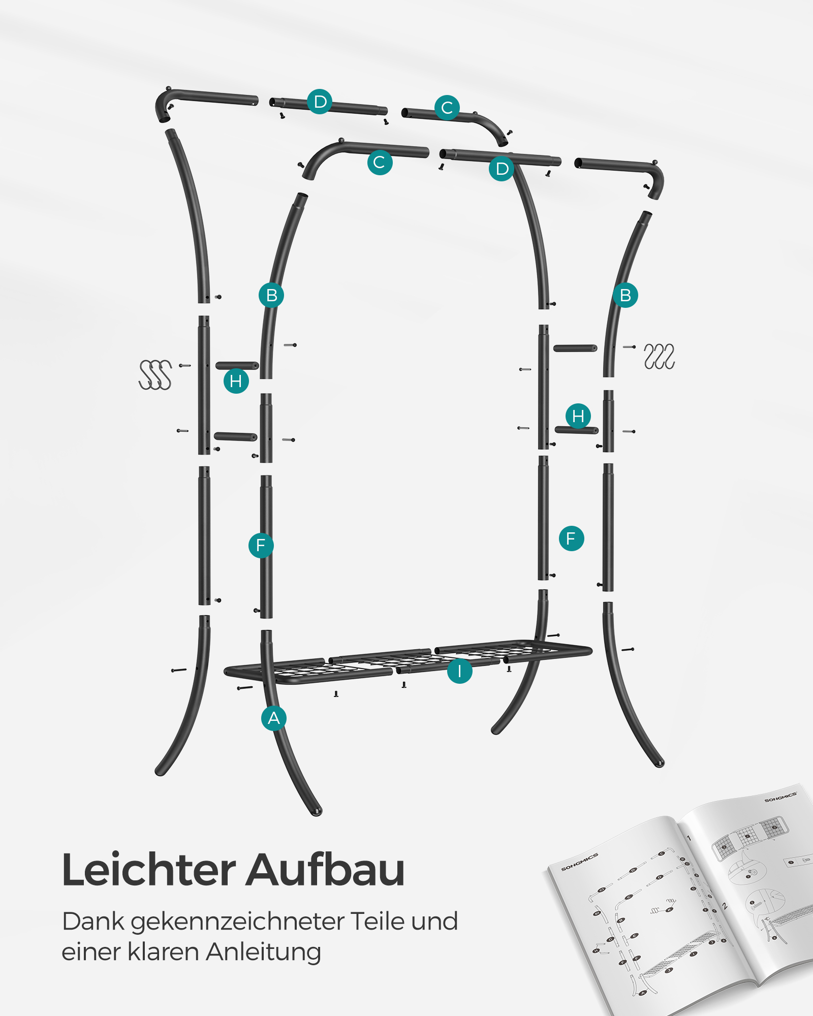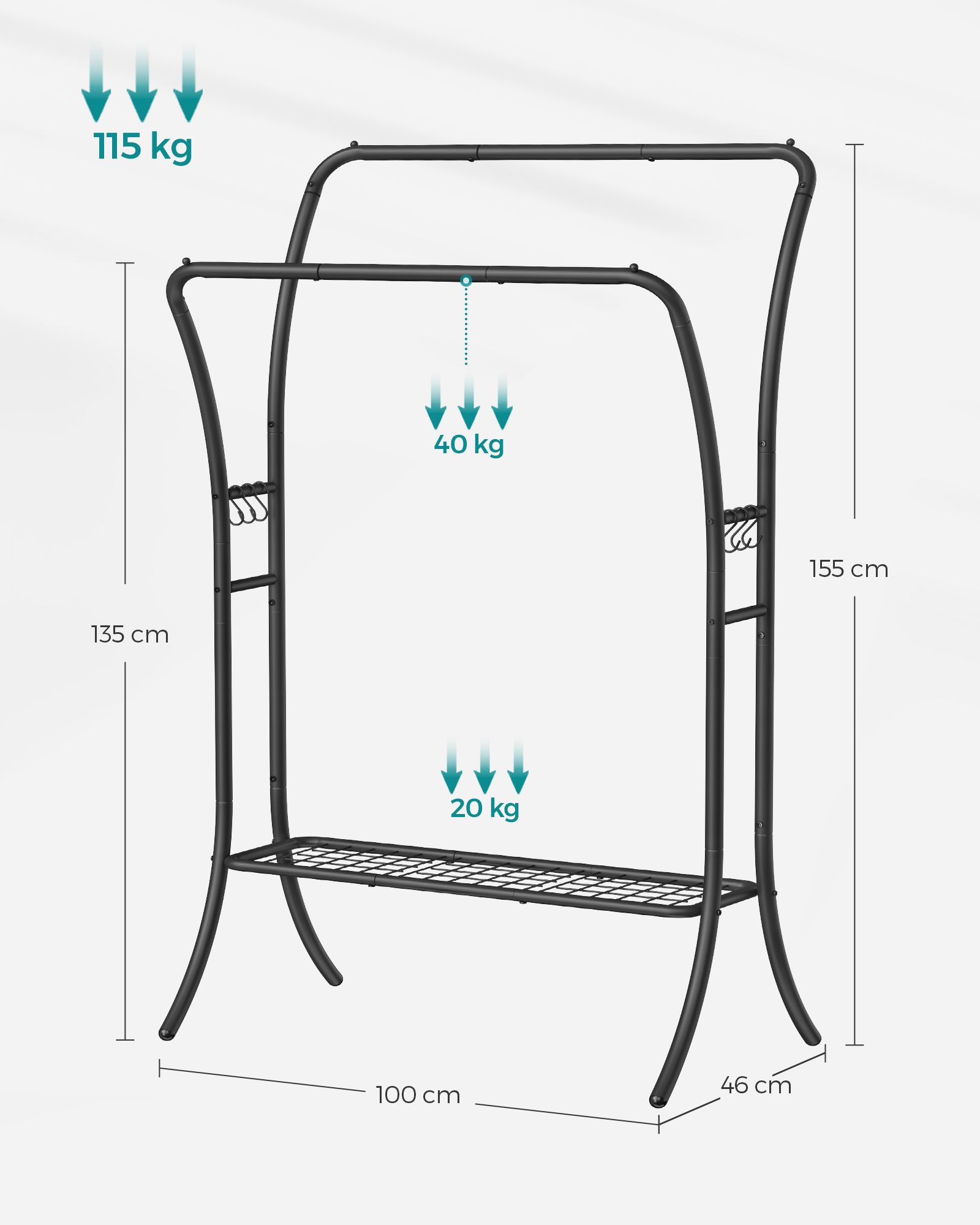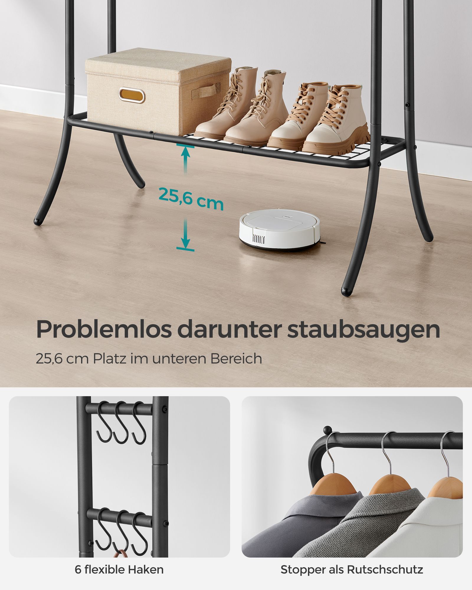 SONGMICS t?jstativ, t?jstang, 2 garderobest?nger, garderobestativ, garderobe af metal, 6 kroge, hylde, t?jopbevaring til sovev?relse, stue
