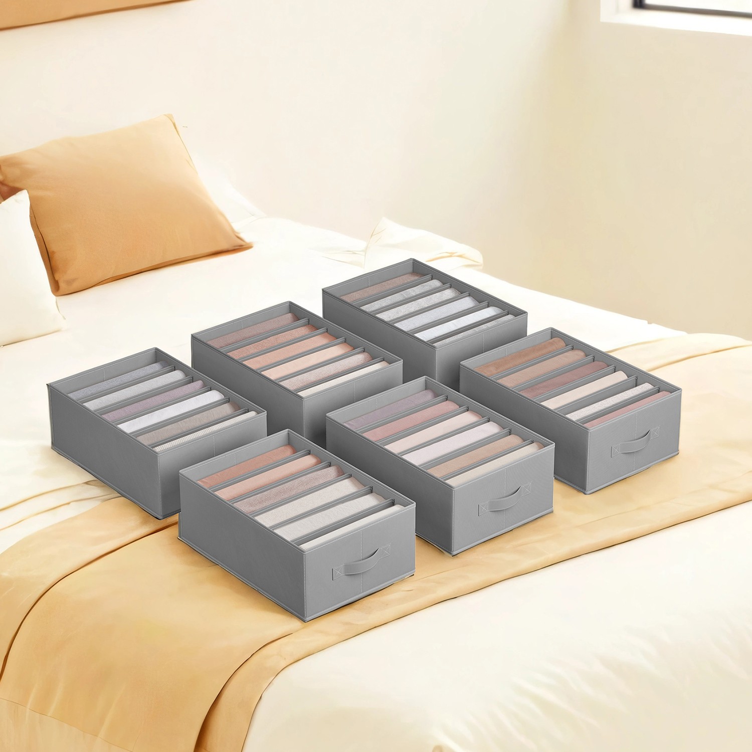 SONGMICS garderobe-organizer 4-delt s?t, opbevaringsboks med 6 rum, skuffeopbevaringssystem, foldbare opbevaringsbokse, 42 x 30 x 17 cm, til bukser, t?j, duvegr? RUS009G04