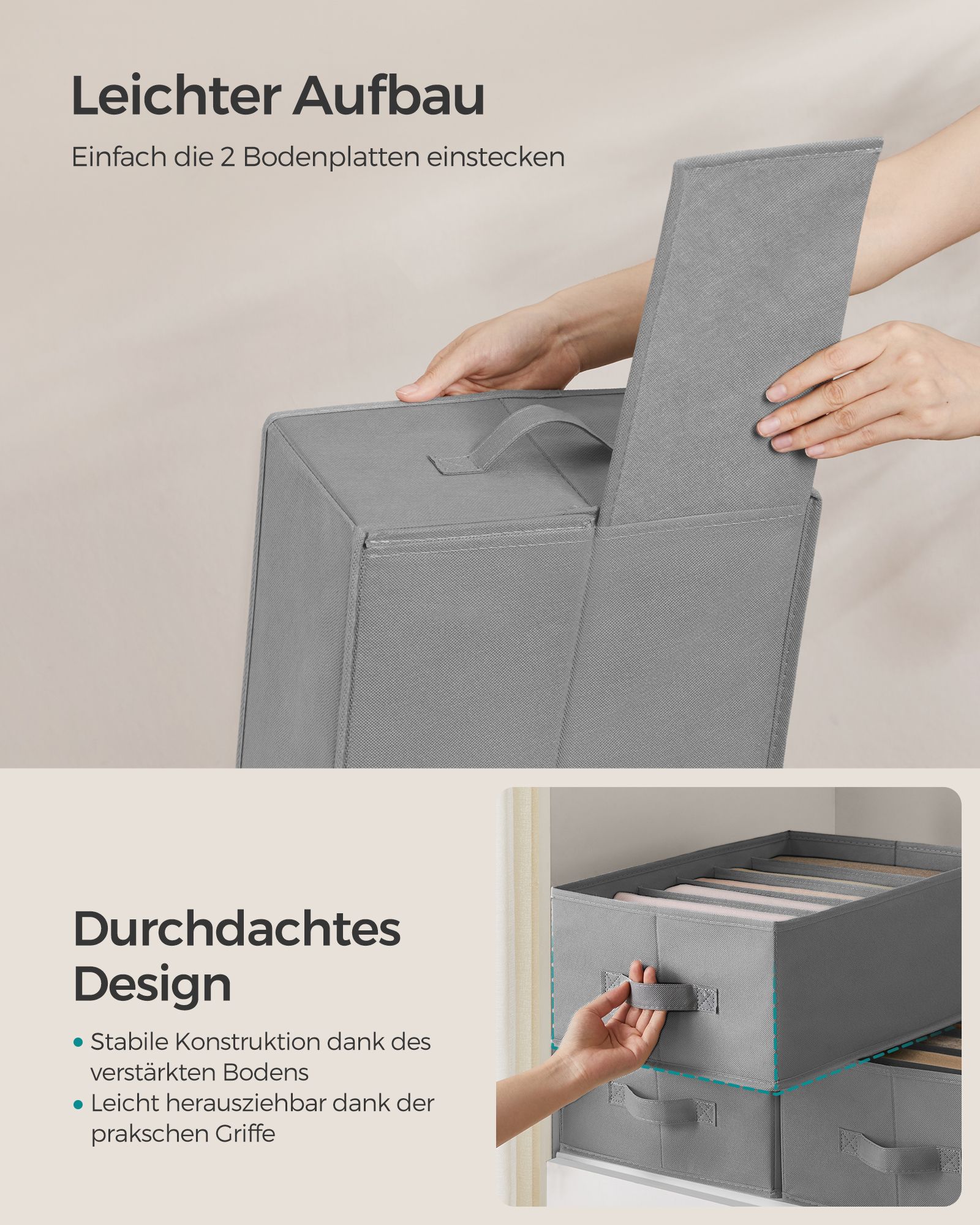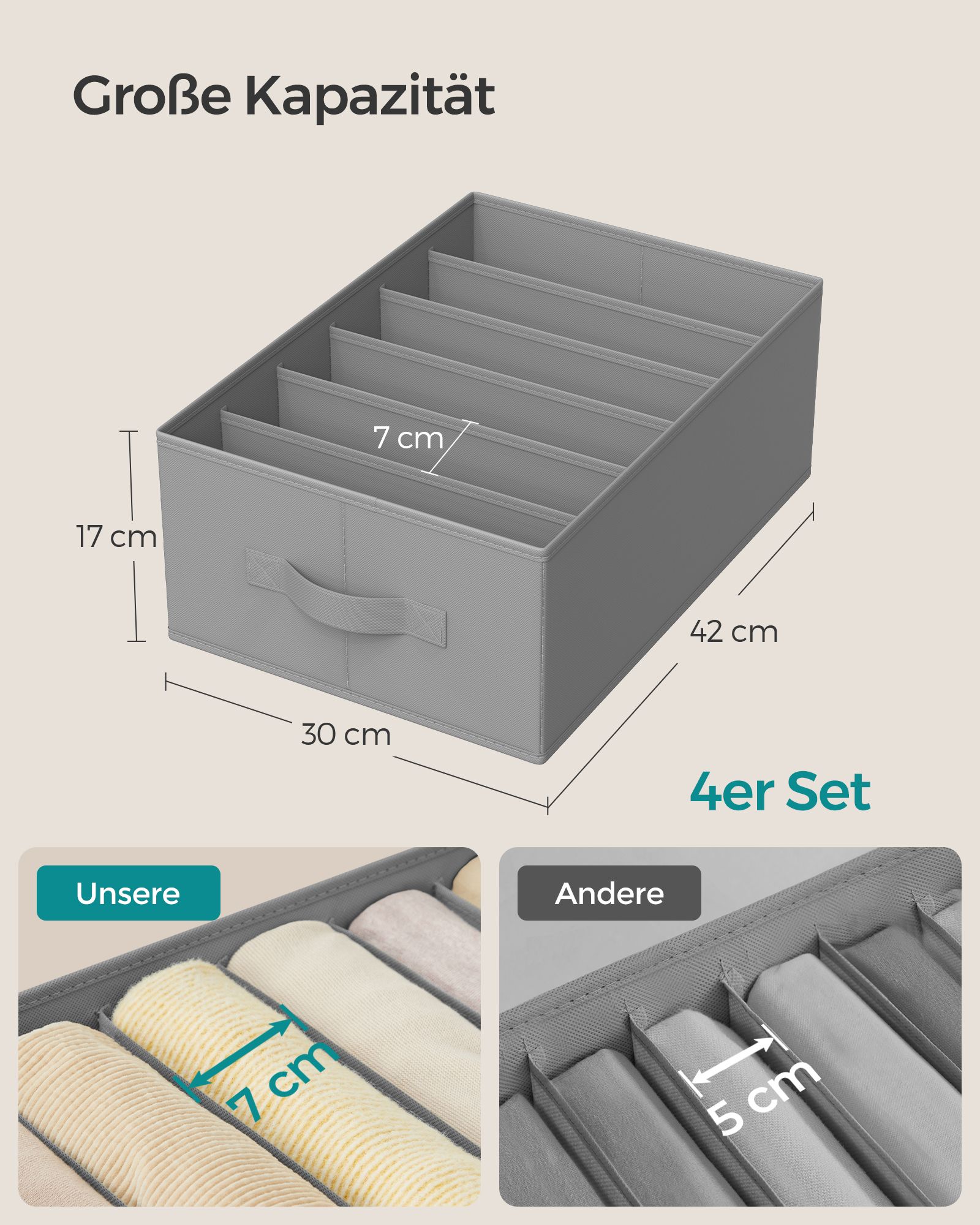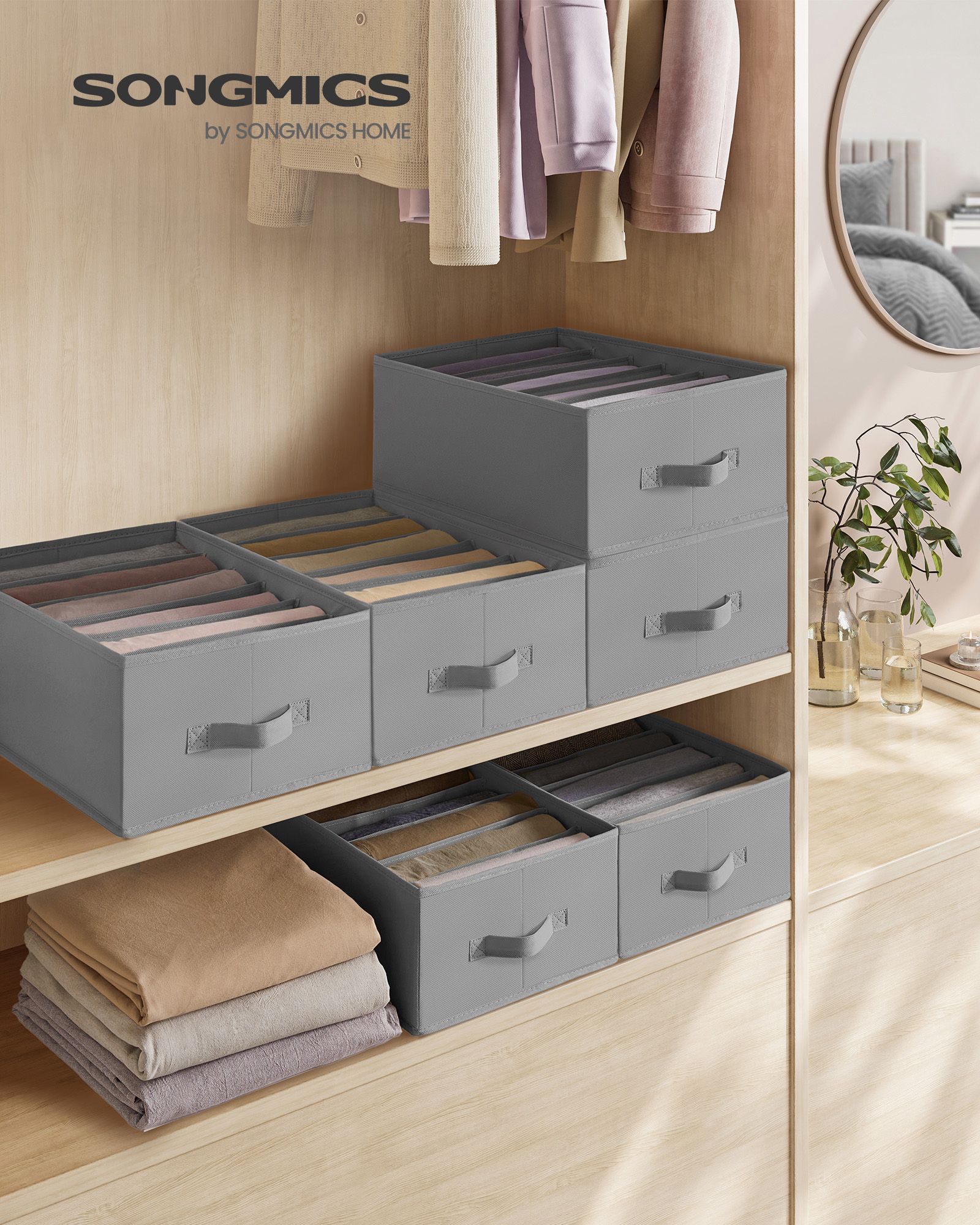 SONGMICS garderobe-organizer 4-delt s?t, opbevaringsboks med 6 rum, skuffeopbevaringssystem, foldbare opbevaringsbokse, 42 x 30 x 17 cm, til bukser, t?j, duvegr? RUS009G04