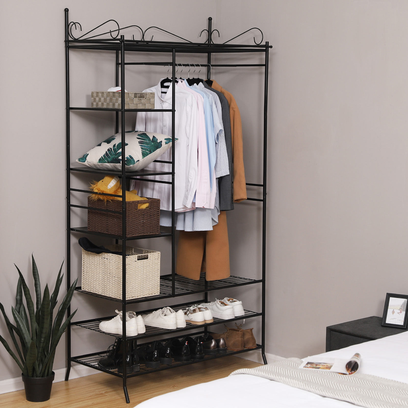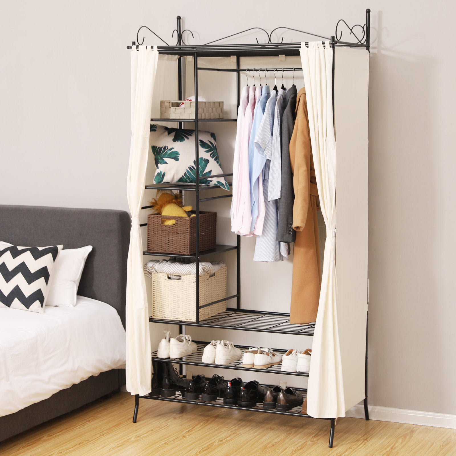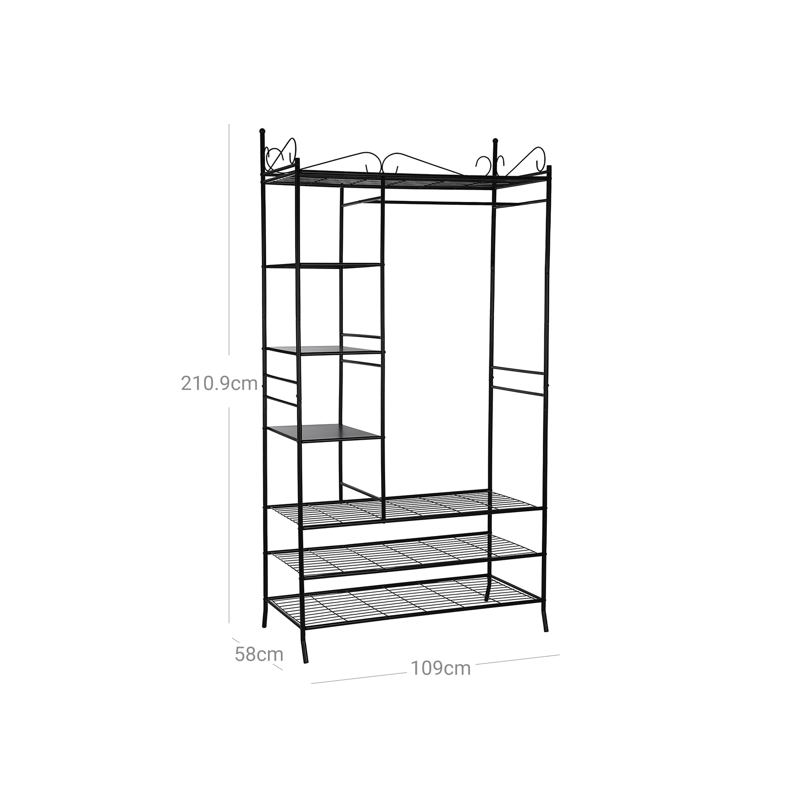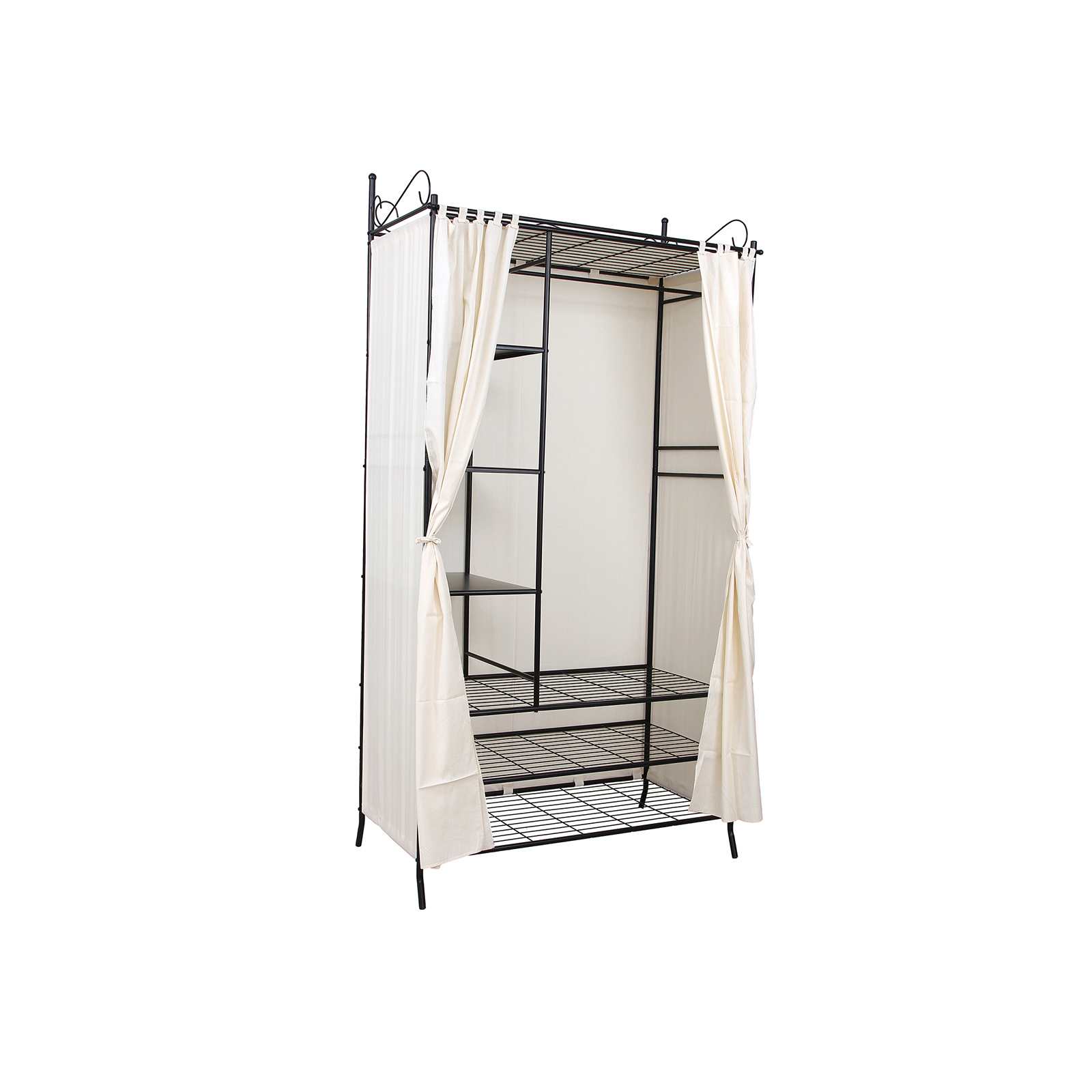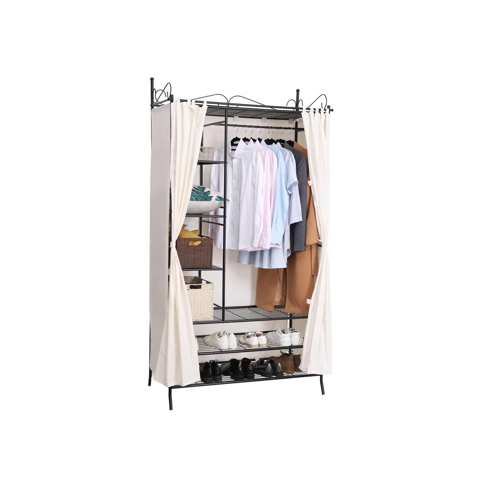 Garderobeskabet er robust og stabilt og passer perfekt ind i enhver bolig! Det stabile stel best?r af metalr?r, hvis overflade er behandlet med en smagfuld br?ndelakering, der er rustbestandig og nem at vedligeholde. Garderobeskabet er udstyret med 1 t?jstang, 1 nethylde i bunden og 3 hylder i siderne og har dermed plads nok til kjoler, bluser, tasker, hatte og meget mere. Alle sider er d?kket med gardiner, s? dit t?j er beskyttet mod st?v og snavs. Uanset om det er i garderoben, k?lderen, gangen, sovev?relset eller p? loftet, er dine ting opbevaret p?nt og let tilg?ngeligt. Let at samle og skille ad, i stabil udf?relse. Med det praktiske kl?deskab f?r du en funktionel og fleksibel hj?lper til dine behov. Bem?rk: Gardinerne er lavet af bomuld og m? ikke vaskes med vand, men skal reng?res i henhold til tekstilens m?rke, ellers krymper stoffet ved vask. Produktdetaljer:- Materiale i stel: St?lr?r – Materiale i stof: 70 % bomuld + 30 % polyester – M?l: 108 x 210 x 58 cm (B x H x D) – Farve: Sort – Emballagem?l: 137 x 60 x 15 cm – Nettov?gt: 16,2 kg – Bruttov?gt: 17,8 kg Leveringsomfang: – 1 x kl?deskab – 1 x vejledning (DE, FR, EN, IT, ES)