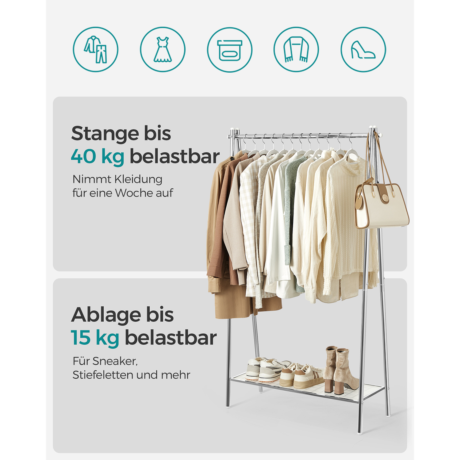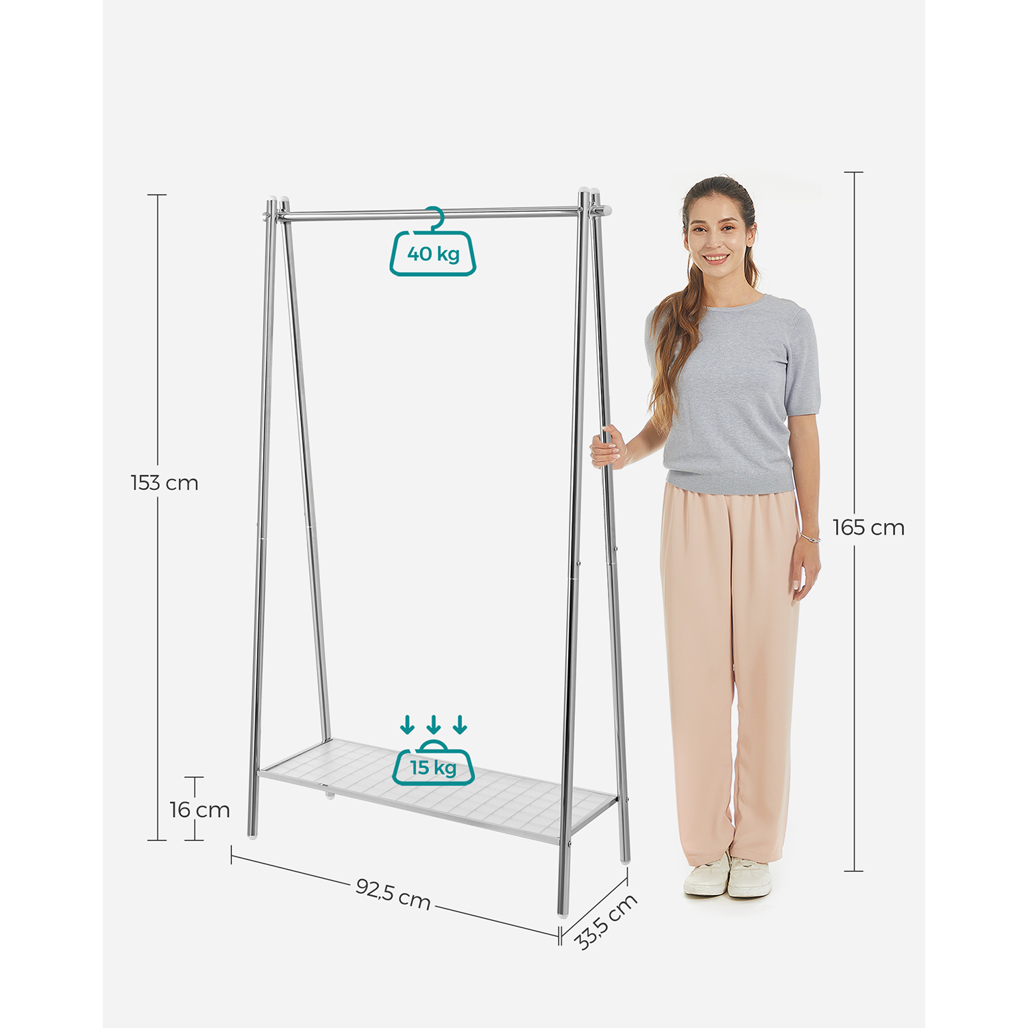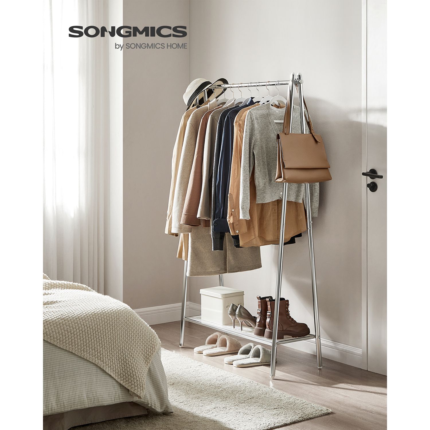 SONGMICS t?jstativ i st?l, garderobestativ med t?jstang, hylde i den nederste del, enkelt, sovev?relse, entre, loft, k?lder, 92,5 x 33,5 x 153 cm, mat sort HSR23BK
