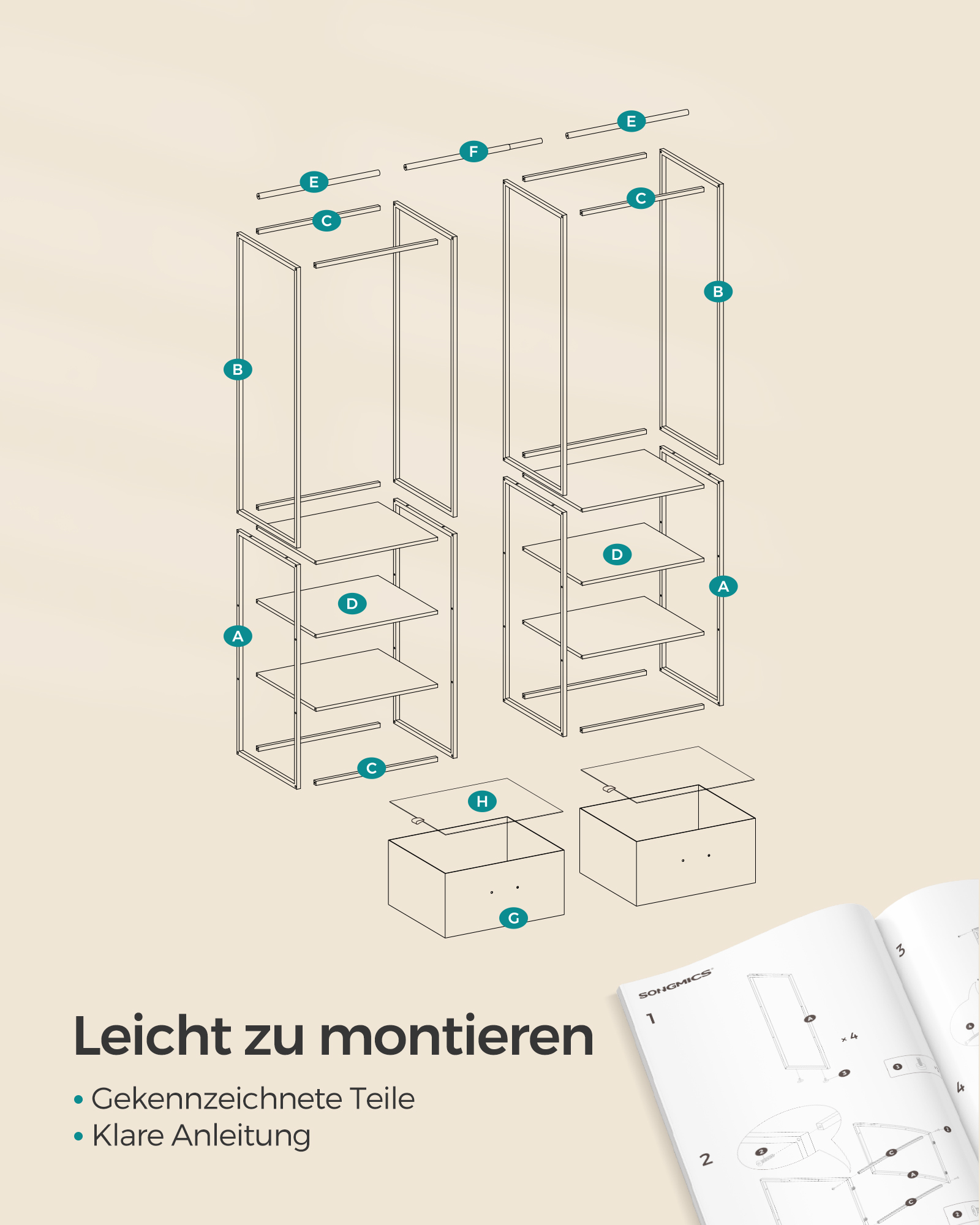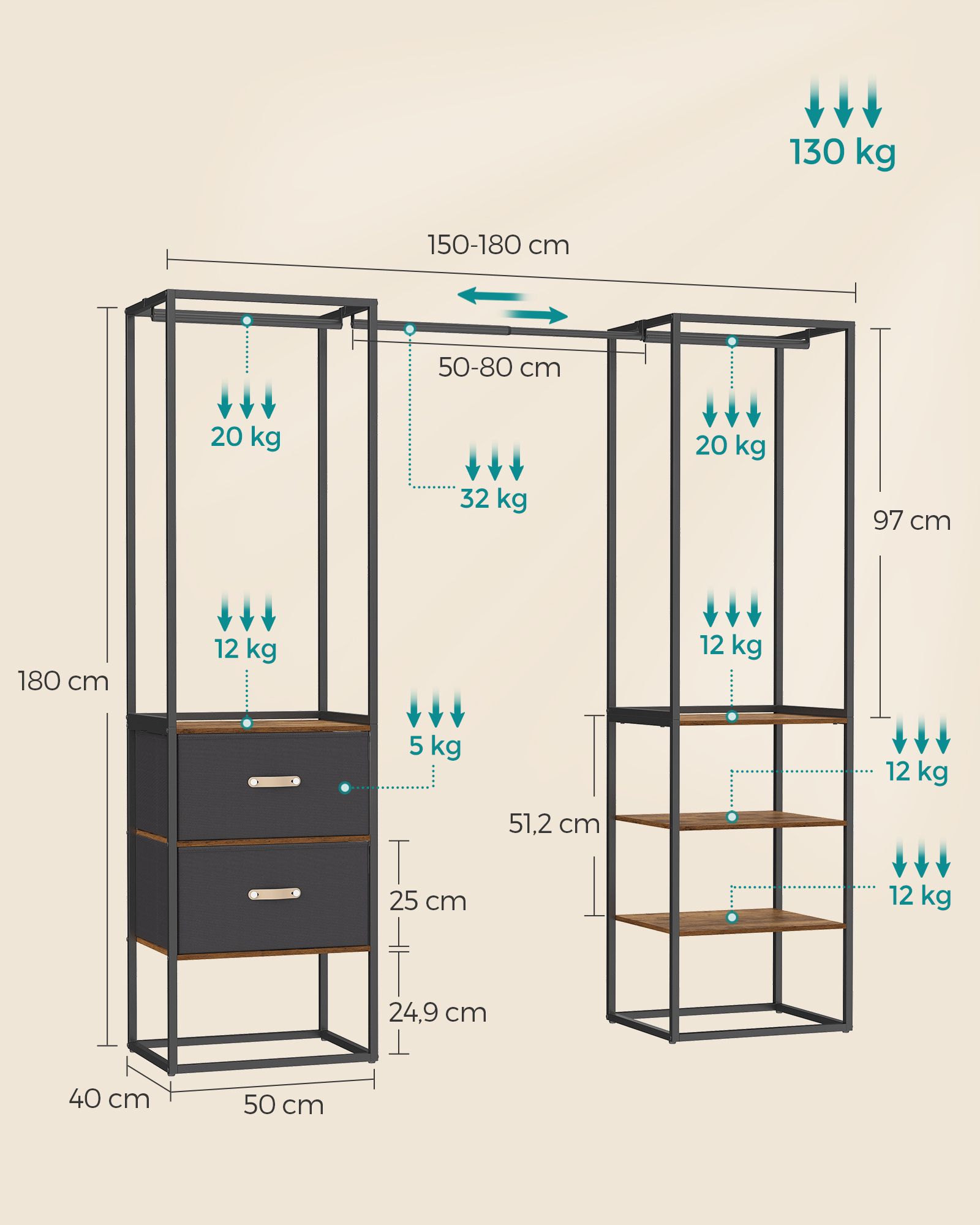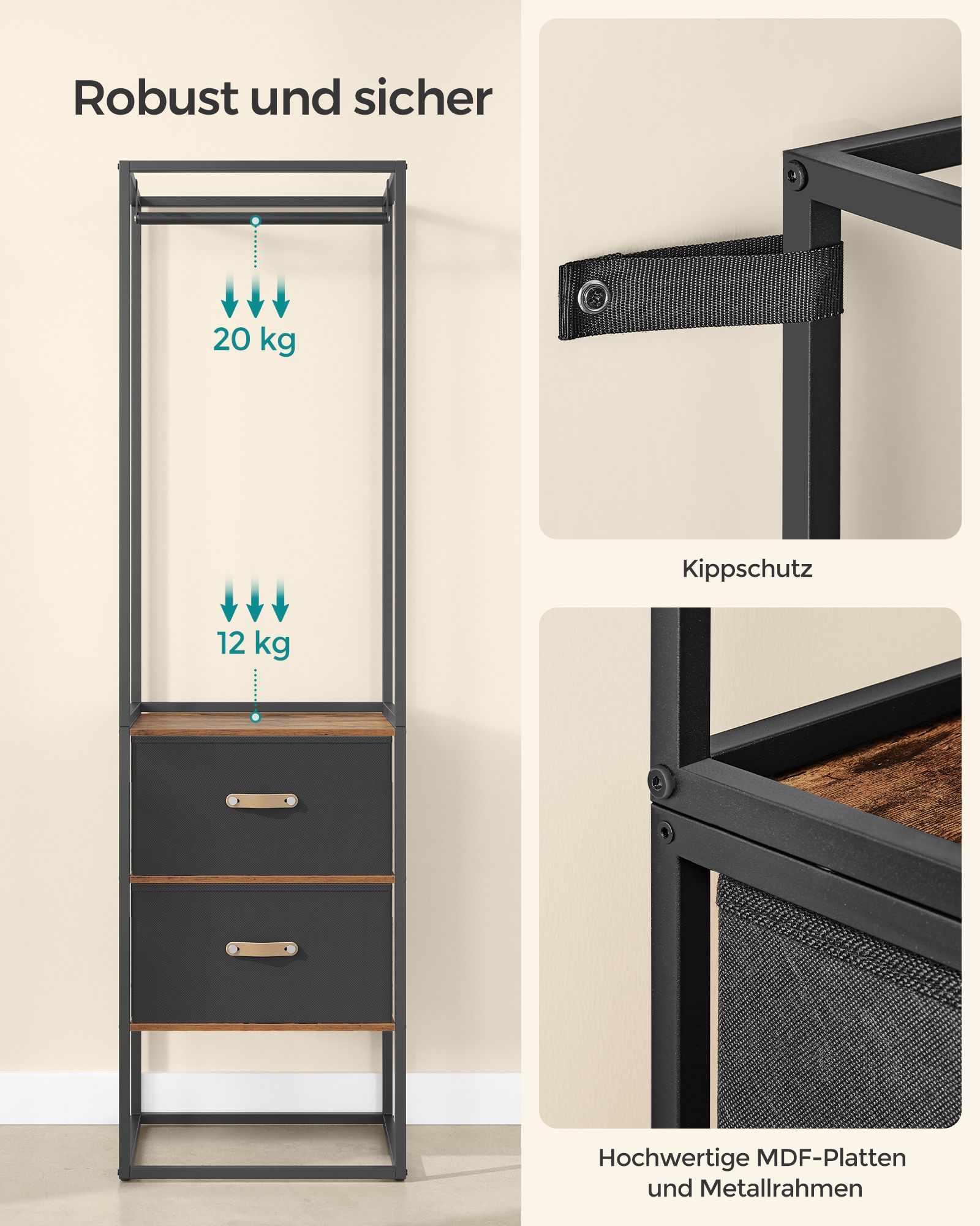 SONGMICS garderobestativ, ?ben garderobe, garderobestativ med h?j belastbarhed, 1 udtr?kkelig stang, 2 skuffer, 4 hylder, til sovev?relset, pladsbesparende