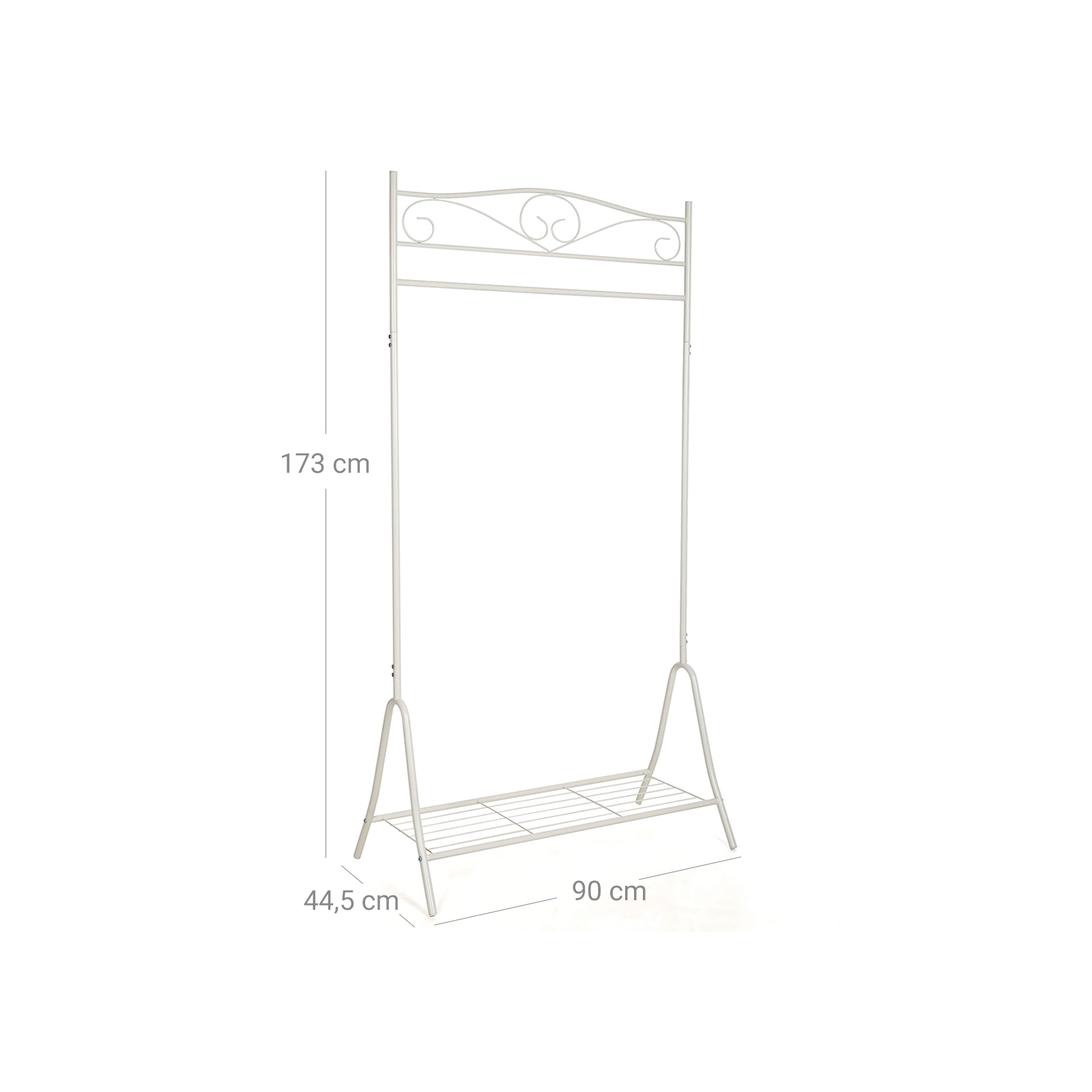 T?jstativet er robust og stabilt og passer perfekt ind i enhver bolig! Det stabile stativ er fremstillet af metalr?r. Overfladen er smagfuldt br?ndelakeret, rustbestandig og nem at vedligeholde. T?jstativet er udstyret med 1 t?jstang og 1 nethylde og har plads til t?j, bluser, tasker, hatte og meget mere.Dine ting kan opbevares p?nt og let tilg?ngeligt p? den. Garderobestativet kan nemt skilles ad og kan derfor opbevares eller transporteres pladsbesparende.Med den praktiske garderobestativ f?r du en funktionel og fleksibel hj?lper til dine behov! Produktdetaljer: – M?l: 90 x 173 x 44,5 cm (B x H x D) – Materiale: Jernr?r – Farve: Cremehvid (HSR01W) – Emballagem?l: 93 x 45,5 x 6,3 cm – Nettov?gt: 3,15 kg – Bruttov?gt: 3,72 kg – Maks. belastbarhed af stangen: 20 kg Leveringsomfang: – 1 x garderobestativ – 1 x monteringsvejledning (DE, FR, IT, EN, ES)
