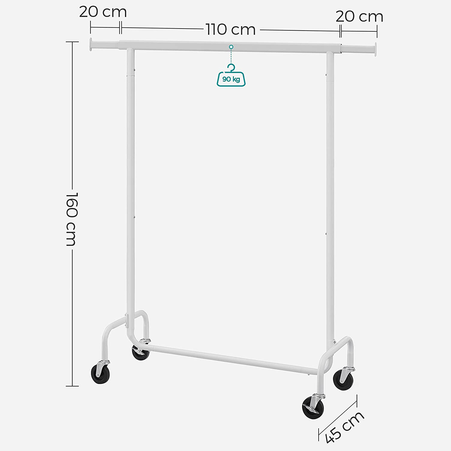Produktdetaljer: – Farve: Mat hvid – Materiale: St?l, PP-hjul – St?rrelse: 45 x (110-150) x 160 cm (D x B x H) – V?gt: 7 kg – Maks. statisk belastning: 130 kg Leveringsomfang: – 1 x garderobestativ – 1 x vejledning