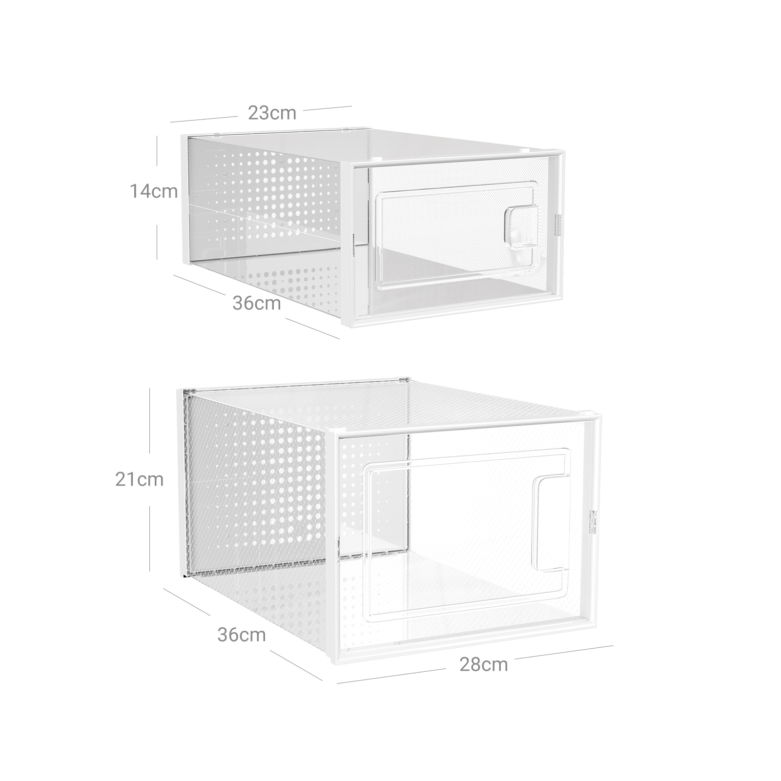 Sko i orden Smider du dine sko i skabet hver gang, s? der efter et stykke tid dannes en kaotisk bunke sko? Du b?r komme af med denne d?rlige vane! K?b disse 10 skokasser og opbevar alle dine sko efter type p? en p?n og ordentlig m?de. Et hjem til alle dine sko Sko af forskellige typer og st?rrelser passer i disse kasser og kan opbevares st?vfrit. Uanset om det er herresko, damesko, sandaler eller l?besko, kan dette s?t med 10 skokasser (4 sm? og 6 store) rumme dem alle. Men det bedste er, at flere af disse kasser kan stables oven p? hinanden for at spare plads, s? de passer perfekt i din entr?, garderobe eller p? et opbevaringsreol. Produktdetaljer: – Farve: Transparent – Materiale: Krop af PP (polypropylen), d?r af PS (polystyren) – M?l pr. lille kasse: 23 x 36 x 14 cm (L x B x H) – M?l pr. stor kasse: 28 x 36 x 21 cm (L x B x H) – Indvendige m?l pr. lille kasse: 22,5 x 32,5 x 13,5 cm (L x B x H) – Indvendige m?l pr. stor kasse: 27,5 x 32,5 x 20 cm (L x B x H) – Samlet v?gt: 3,8 kg Leveringsomfang:- 6 x lille skokasse – 4 x stor skokasse – 1 x vejledning (DE, EN, FR, ES, IT) SONGMICS Bem?rkninger: – F?lg monteringsvejledningen i vejledningen og videoen for at samle produktet. Undlad at skille det ad med magt. – M?l dine sko inden k?b og kontroller, at de passer i disse skokasser.