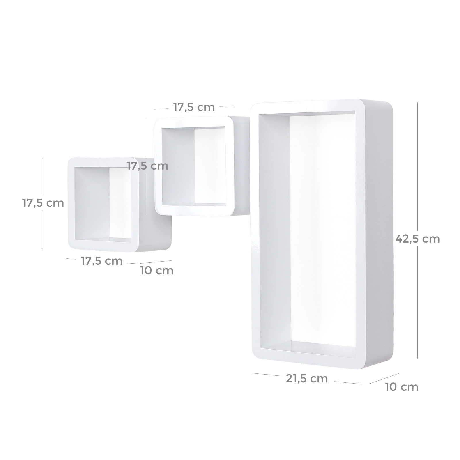 Disse smukke v?ghylder i elegant retrostil er praktiske og dekorative genstande i enhver bolig! Songmics hyldes?t best?r af MDF-plader, der er fremstillet i overensstemmelse med emissionsklasse E1. Det er fugtbestandigt, vrider sig ikke let og har en h?j belastbarhed. Efter forarbejde med omhyggelig slibning/spartling er lakken omhyggeligt p?f?rt flere gange i h?nden, og farven er holdbar, j?vn og blank. Reolerne kan samles p? et ?jeblik og kan monteres b?de vandret og lodret. Med sit nye design og moderne stil er reols?ttet den ideelle opbevaringsplads til b?ger, cd’er og andre sm?ting. Som v?ghylde eller blot som fritst?ende dekoration ? det 3-i-1-kubes?t er et absolut blikfang! Produktdetaljer:- Materiale: MDF-plader (klasse E1) med en pladetykkelse p? 1,8 cm Udvendige m?l: – stort reol: 42,5 x 21,5 x 10 cm (B x H x D) – lille reol: 17,5 x 17,5 x 10 cm (B x H x D) (2 x ) Indvendige m?l: — stort hylde: 39 x 18 x 10 cm (B x H x D)- lille hylde: 13,4 x 13,4 x 10 cm (B x H x D) (2 x )Leveringsomfang:- 1 x v?ghylde (1 stor hylde, 2 sm? hylder)- 1 s?t skruer og dyvler til montering- 1 x vejledning (DE, FR, EN, IT, ES)SONGMICS Bem?rk:- Til montering er det n?dvendigt at bruge en akku-skruemaskine, et vaterpas og en hammer. – Fastg?r produktet til en betonv?g, letbetonv?g eller murstensv?g. Hvis du ?nsker at fastg?re produktet til en gipsplade, skal du f?rst anskaffe passende skruer i en specialforretning.