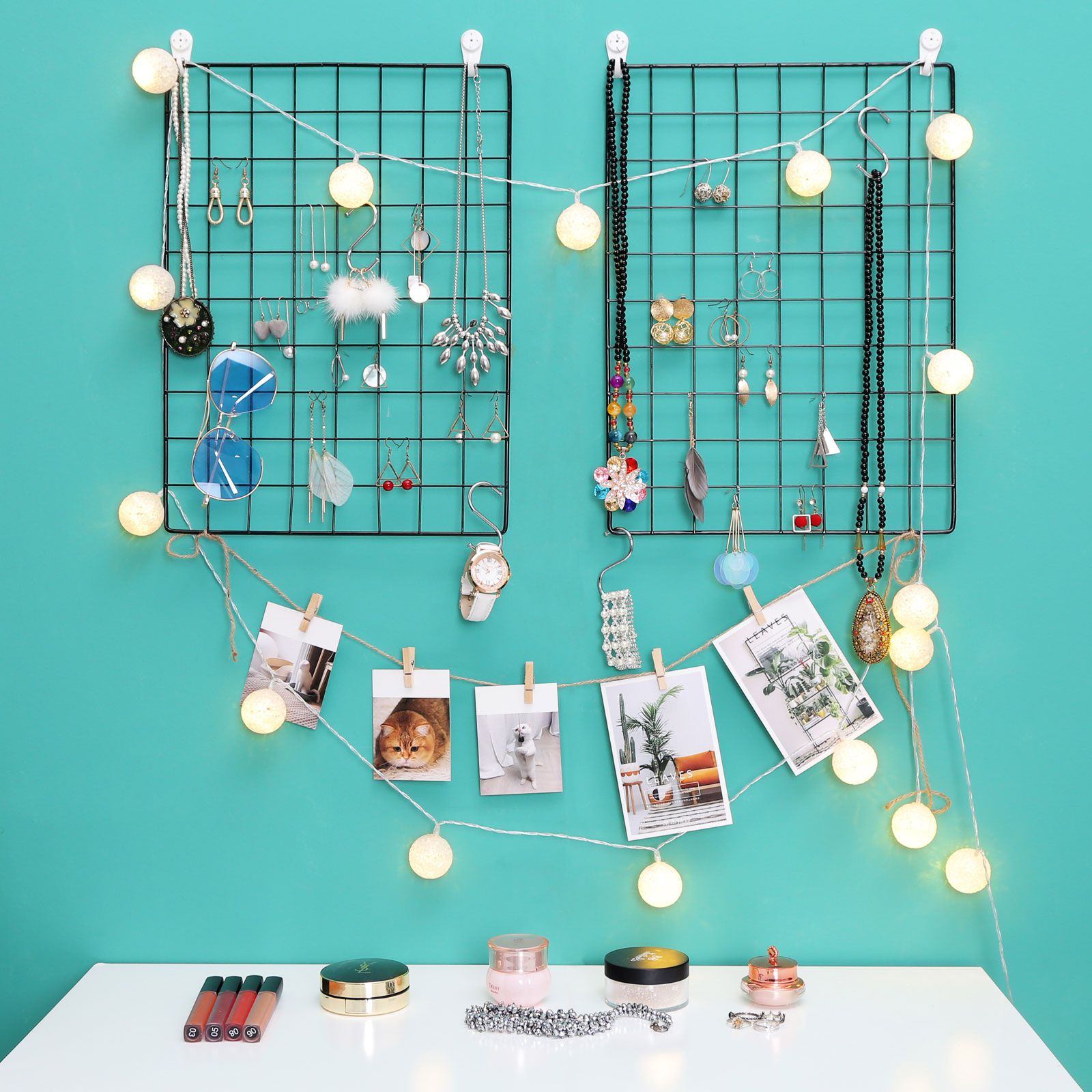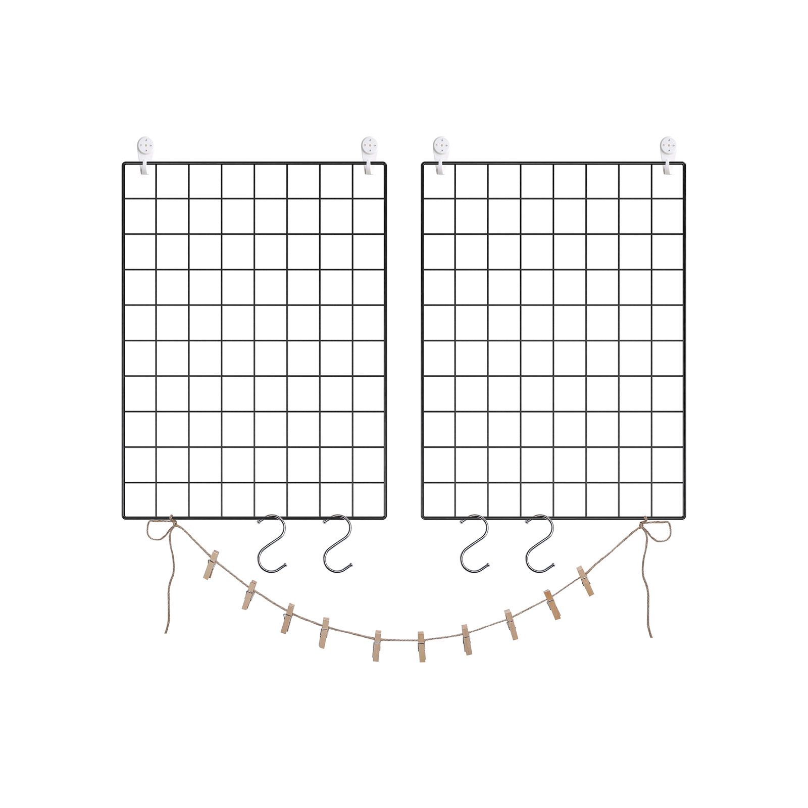 Hvordan bliver man kunstner? Det er helt enkelt! – V?r kreativ! For de fleste mennesker virker gitterplader ikke s?rlig smukke og virker som et objekt uden noget form?l. Men for en kunstner gemmer der sig bag gitterst?ngerne en fantastisk mulighed for at blive kreativ og forvandle dem til et unikt kunstv?rk ved hj?lp af billeder, dekorationer, lysk?der eller postkort.Find din indre kunstner med SONGMICS og design disse fantastiske gitterv?gge efter dine egne ideer! Metalgitterplader synes umiddelbart ikke at have noget med v?gdekoration eller fotorammer at g?re. Men med hj?lp fra sm? t?jklemmer, en hampesnor og S-kroge bliver de til l?rreder, hvor alt er muligt. Selv tilsyneladende enkle ting kan blive til fascinerende kunstv?rker. Og hvad med dig? Hvordan vil dine “l?rreder” se ud i fremtiden? Produktdetaljer: – Farve: Sort – Materiale: Jern – St?rrelse p? en plade: 42 x 31 cm – L?ngde p? hampesnor: 1 m – V?gt: 0,62 kg – Maks. statisk belastning pr. gitterv?g: 4 kg Leveringsomfang:- 2 x gitterplade – 4 x S-kroge – 1 x hampesnor – 10 x klemmer – 4 x sporl?se v?gkroge – 1 x hammer (19 cm) – 1 x vejledning (DE, EN, FR, ES, IT) SONGMICS Bem?rkninger: – Opbevar produktet utilg?ngeligt for b?rn og k?ledyr.- H?ng ikke genstande p? fotov?ggen, hvis v?gt overstiger den maksimale belastning.