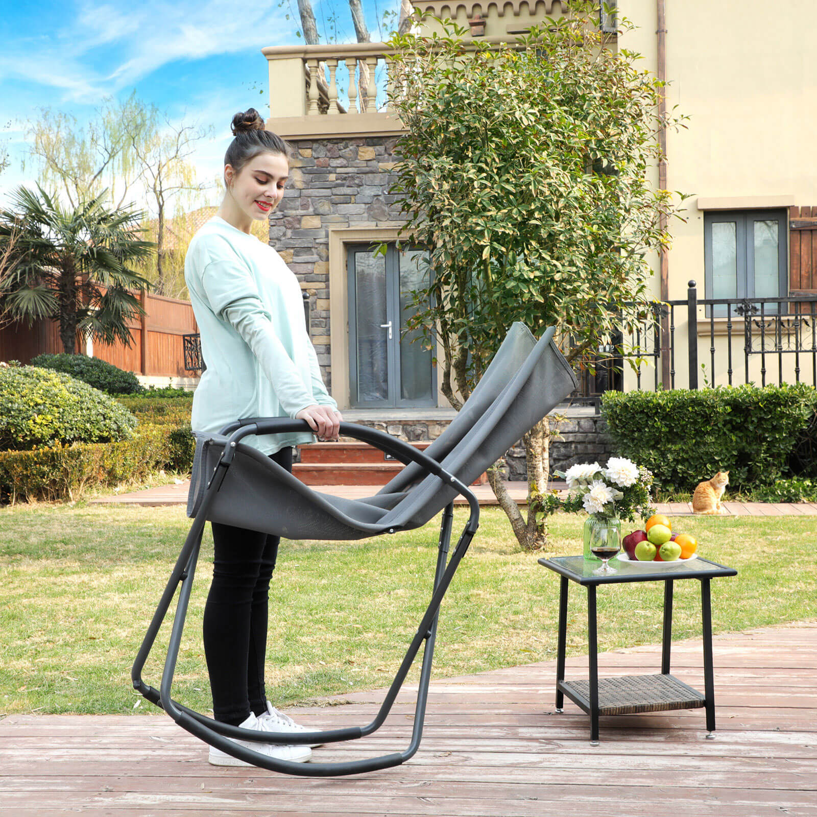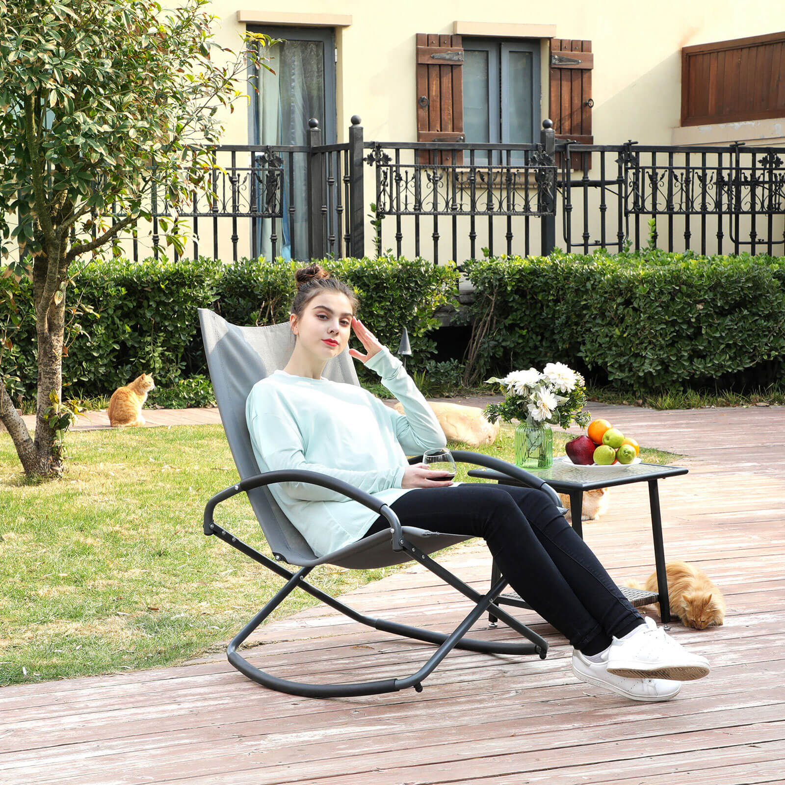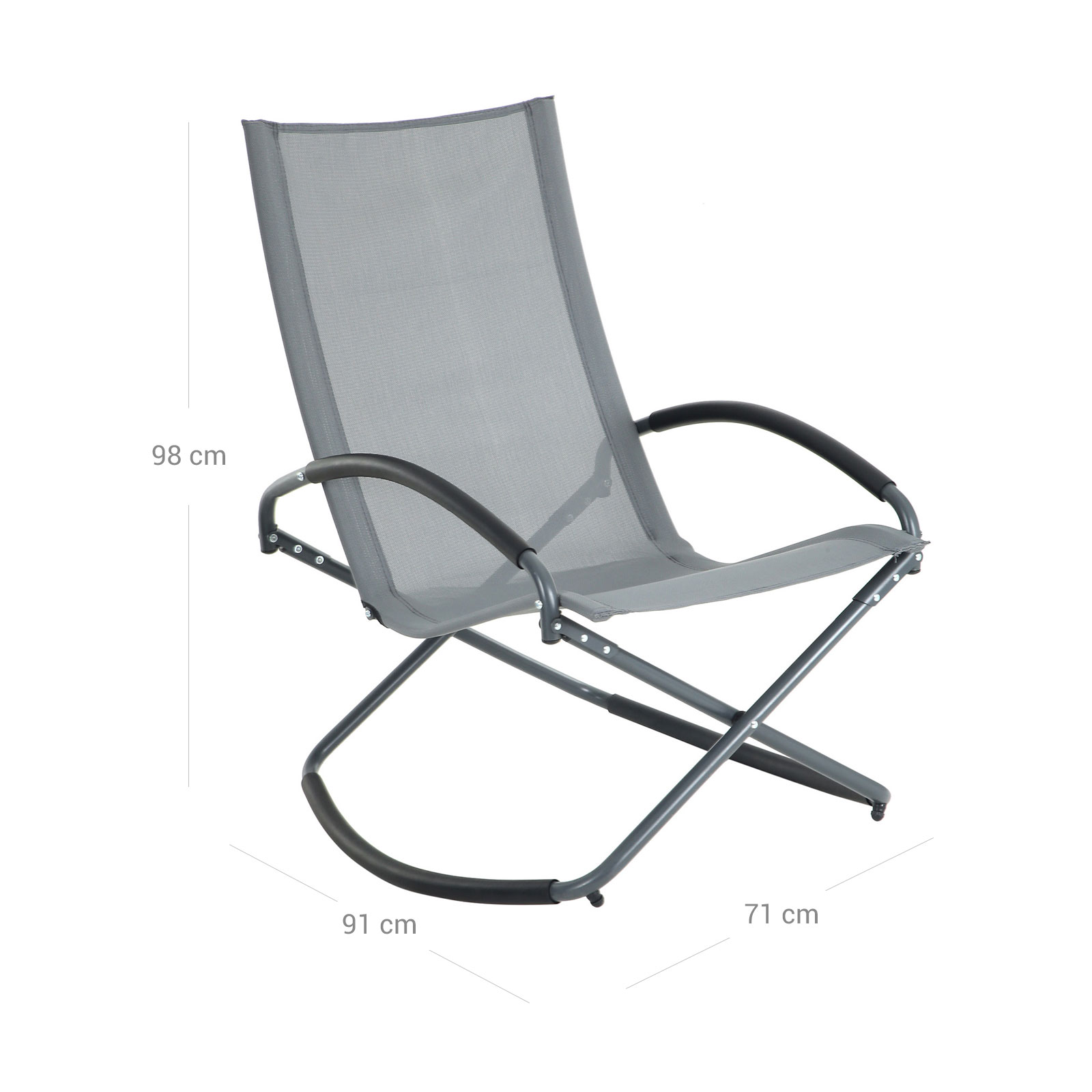 Leder du efter udend?rsstole til at slappe af p? terrassen eller solbade i haven? Denne gyngestol fra SONGMICS kommer dig til unds?tning! Ah! Hvilken forn?jelse! S?t dig i denne gyngestol, l?n dig tilbage og gyng afslappet frem og tilbage. Liggefladen af h?jkvalitets kunstfiber er ?ndbar og f?les behagelig, og det eksklusive jernstel sikrer desuden en lang levetid. Du kan klappe denne stol sammen, s? den bliver kompakt, og nemt transportere den fra et sted til et andet for at se solnedgangen fra forskellige positioner! Desuden s?rger de praktiske arml?n for mere siddekomfort. S?t denne gyngestol i din have nu og g?r dig det behageligt! Produktdetaljer: Farve: Gr? Materiale: Jernstel, kunstfiberstof St?rrelse: 71 x 91 x 98 cm (L x B x H) Emballagest?rrelse: 94 x 77 x 8 cmV?gt: 6,5 kgMaks. statisk belastning: 150 kgLeveringsomfang:1 x gyngestol1 x vejledning (DE, EN, FR, ES, IT)SONGMICS Bem?rkninger:Gyngestolens maksimale belastning er 150 kg. Denne maksimale v?gt m? ikke overskrides. S?rg for at folde gyngestolen helt ud, inden den tages i brug. Beskyt produktet mod regn, og uds?t ikke gyngestolen for st?rk solindstr?ling i l?ngere tid.