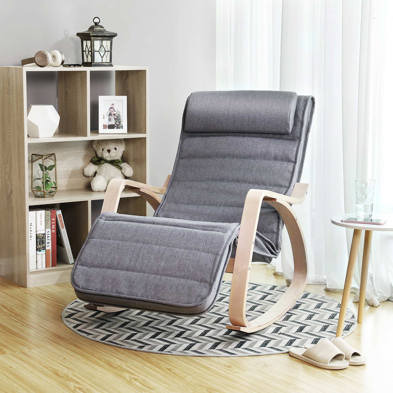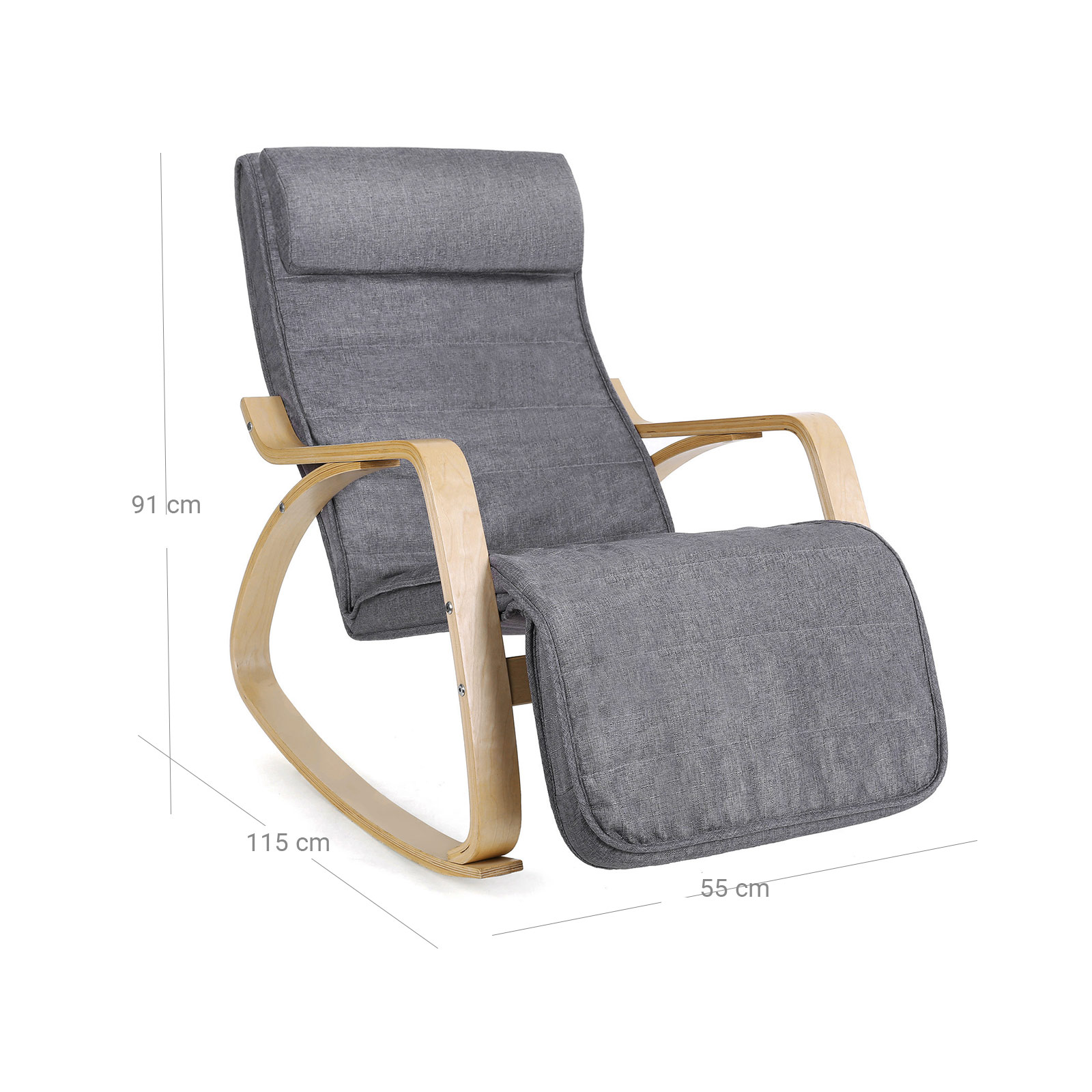 Med Songmics gyngestol kan du nyde din fritid i en afslappet tilstand. Kombinationen af trendy design og h?j siddekomfort g?r denne gyngestol til et popul?rt produkt. Den stabile gyngestol i lyst birketr? giver en “rundom behagelig” fornemmelse takket v?re sin ergonomiske form og det behagelige s?de med betr?k i imiteret h?r og t?t skumfyldning. Uanset om gyngestolen bruges p? altanen, i stuen, i sovev?relset eller som l?nestol i haven eller p? terrassen, er gyngestolen med sit smukke udseende og enkle farvevalg et absolut blikfang og passer perfekt ind i enhver moderne og klassisk indretning. Takket v?re sin stabile tr?konstruktion svinger stolen let og giver dig en meget behagelig siddeoplevelse. Produktdetaljer: – Materiale: Birk + skum + imiteret l?rred – Farve: gr? – M?l: 67 x 115 x 91 cm – H?jde p? rygl?n: 73 cm – Dybde p? s?de: 48 cm – Bredde p? s?de: 55 cm – L?ngde p? fodst?tte: 33 cm – Maks. belastbarhed: 150 kg Plejevejledning: Aftageligt betr?k? – Vaskes separat. – Maskinvaskbar op til 30 grader! – M? ikke bleges, m? ikke stryges! – Ikke egnet til t?rretumbler! – M? ikke renses! Stel: – Aft?rres med en fugtig klud (evt. med et mildt reng?ringsmiddel). – T?r efter med en t?r klud. Leveringsomfang: – 1 x gyngestol – 1 x vejledning (DE, EN, FR, IT, ES)