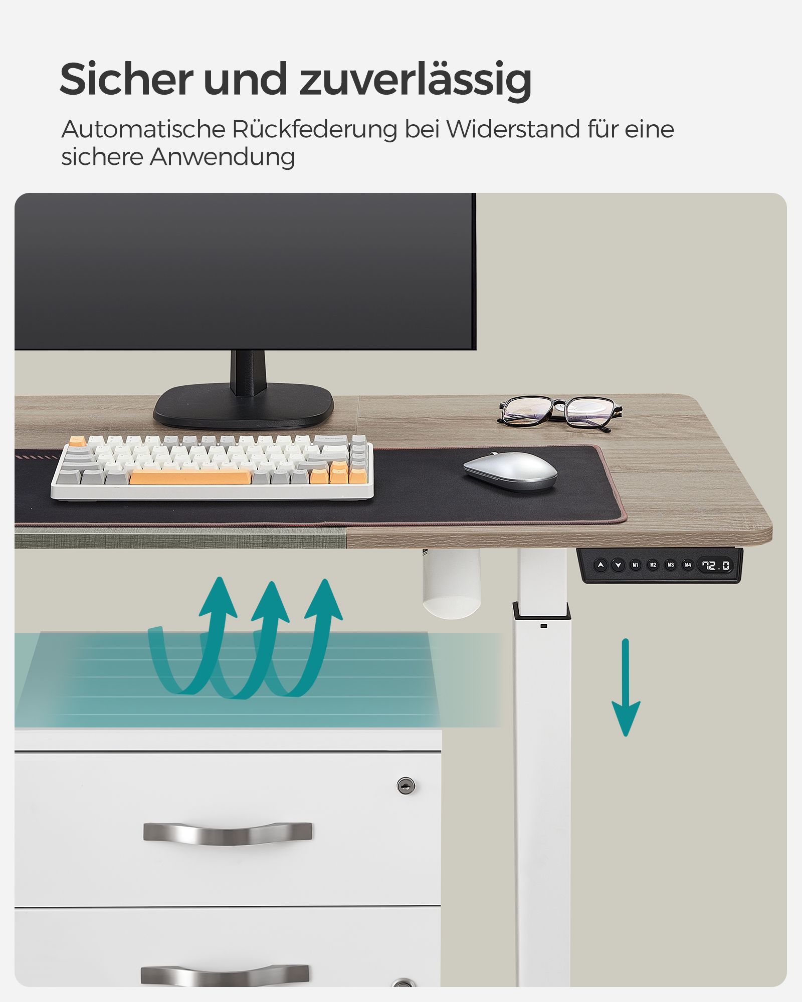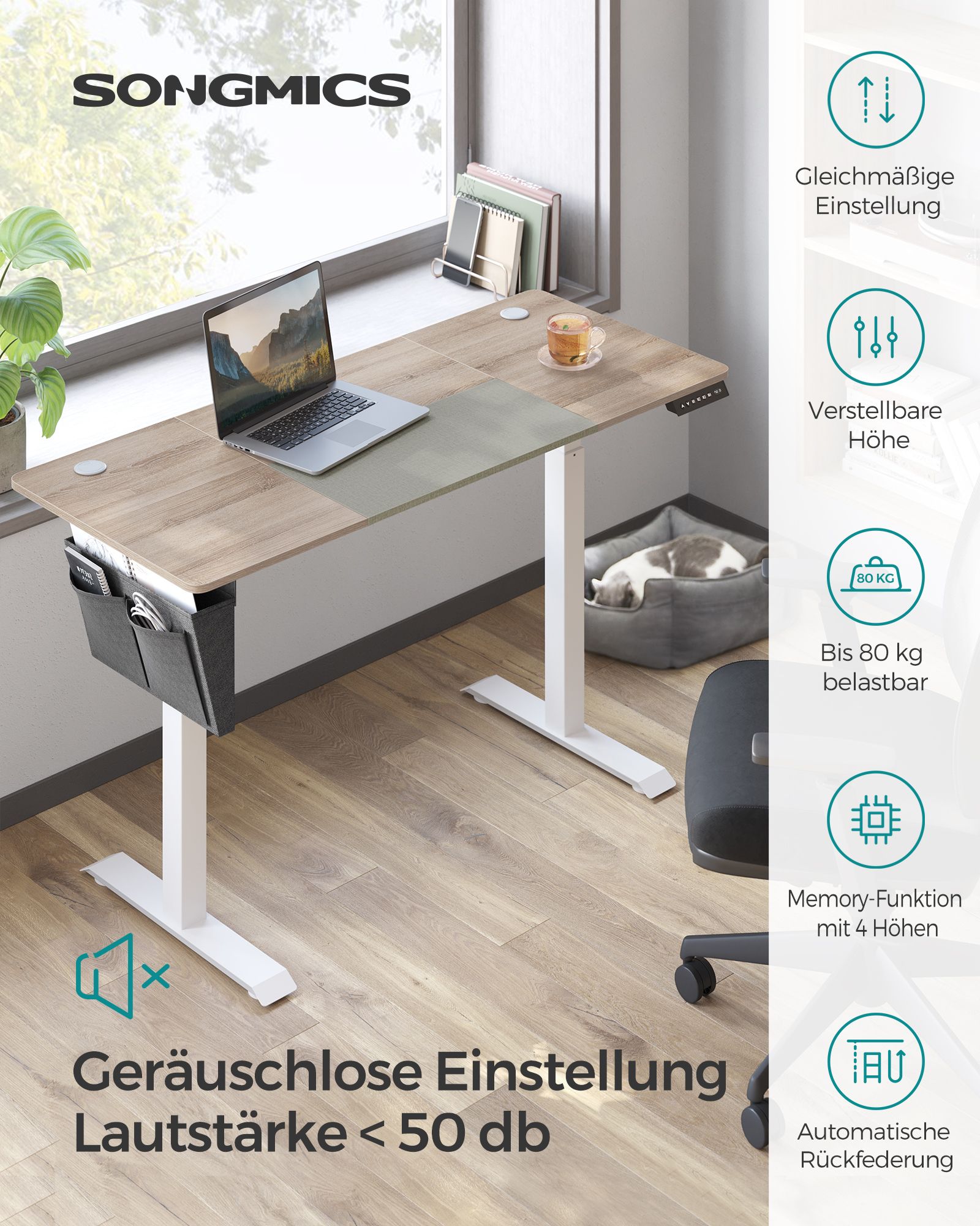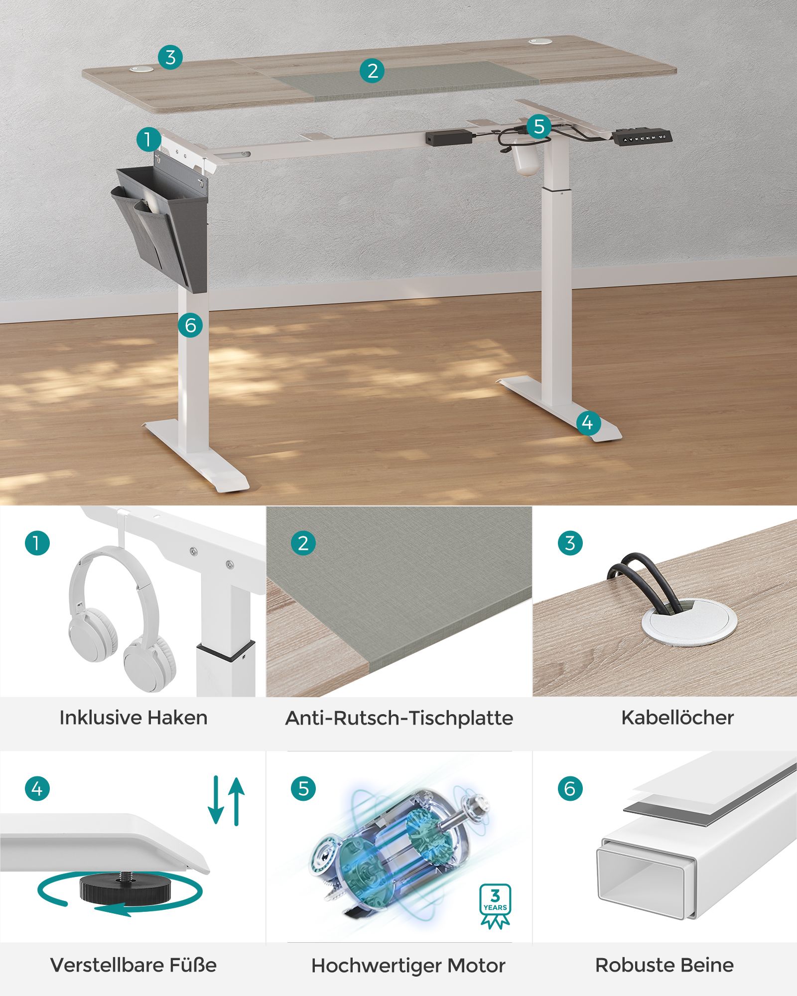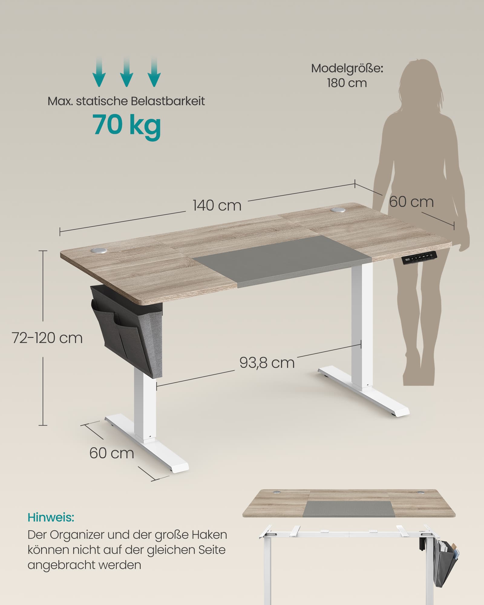 Produktdetaljer: Farve: Hvid-greige Materiale: Sp?nplade, st?l, ikke-v?vet stof St?rrelse: 60 x 140 x (72-120) cm (D x B x H) Bordpladens tykkelse: 1,5 cm V?gt: 28 kg Maks. statisk belastning: 70 kg Leveringsomfang: 1 x elektrisk skrivebord 1 x adapter 1 x controller 1 x opbevaringstaske 2 x kroge 1 x tilbeh?rspakke 1 x vejledning SONGICs bem?rkninger: Placer ikke bordet direkte op ad en v?g under l?fte- og s?nkeprocessen for at undg? ridser. Produktet er udelukkende beregnet til indend?rs brug. Hold alle elektriske komponenter v?k fra v?sker. Hvis bordet h?ves eller s?nkes i 2 minutter, aktiveres overophedningsbeskyttelsen automatisk, og du skal vente 18 minutter, f?r du kan bruge h?jdejusteringen igen.For at beskytte bordpladen mod st?d og ridser skal du indstille den indbyggede sensor til en h?jere v?rdi for at registrere faste genstande ved h?jdejusteringen. Demonter ikke de enkelte dele af dette produkt uden faglig r?dgivning. Placer ikke tunge genstande, der overstiger den maksimale belastning p? 80 kg, p? produktet. Brug ikke stikkontakter eller adaptere med for h?j sp?nding.