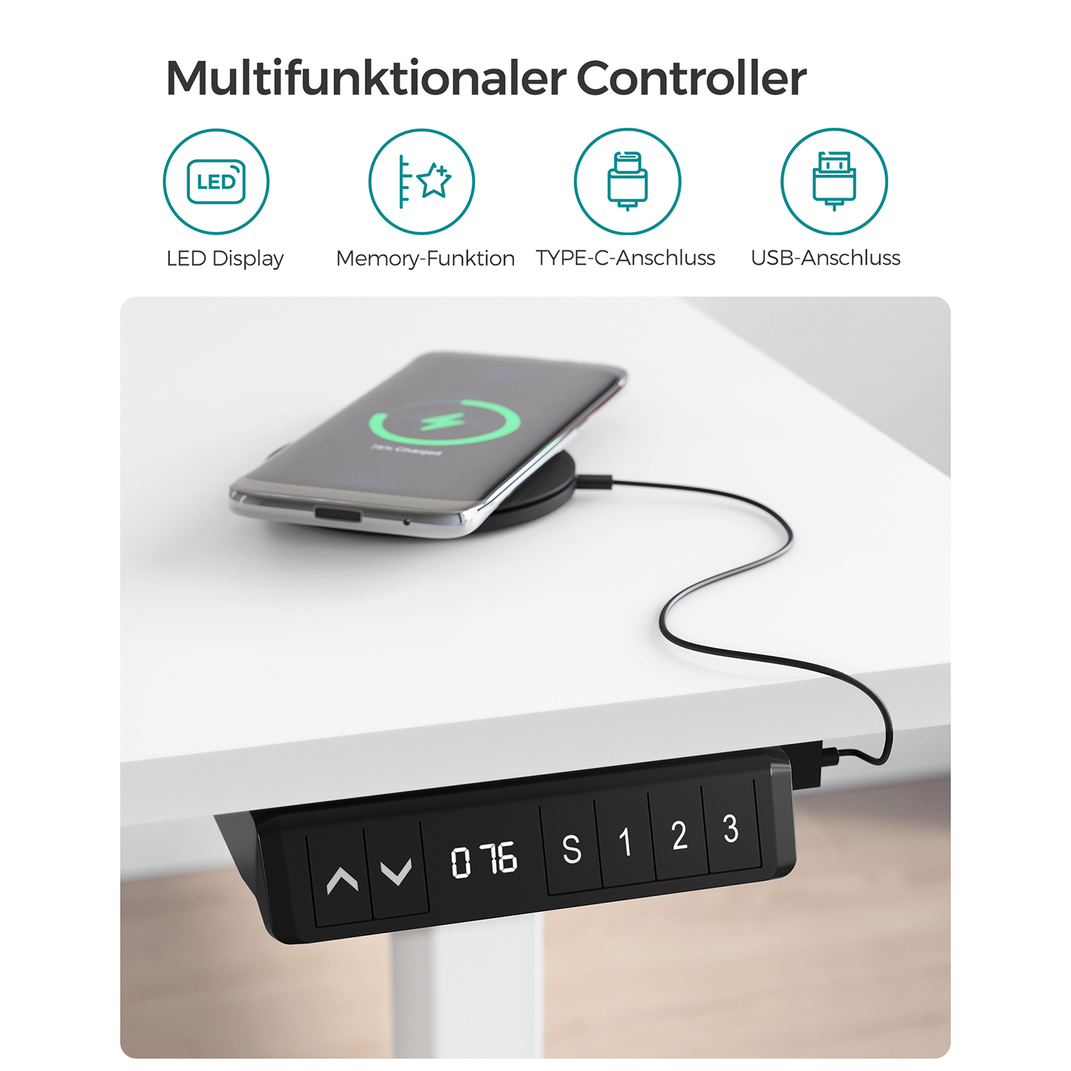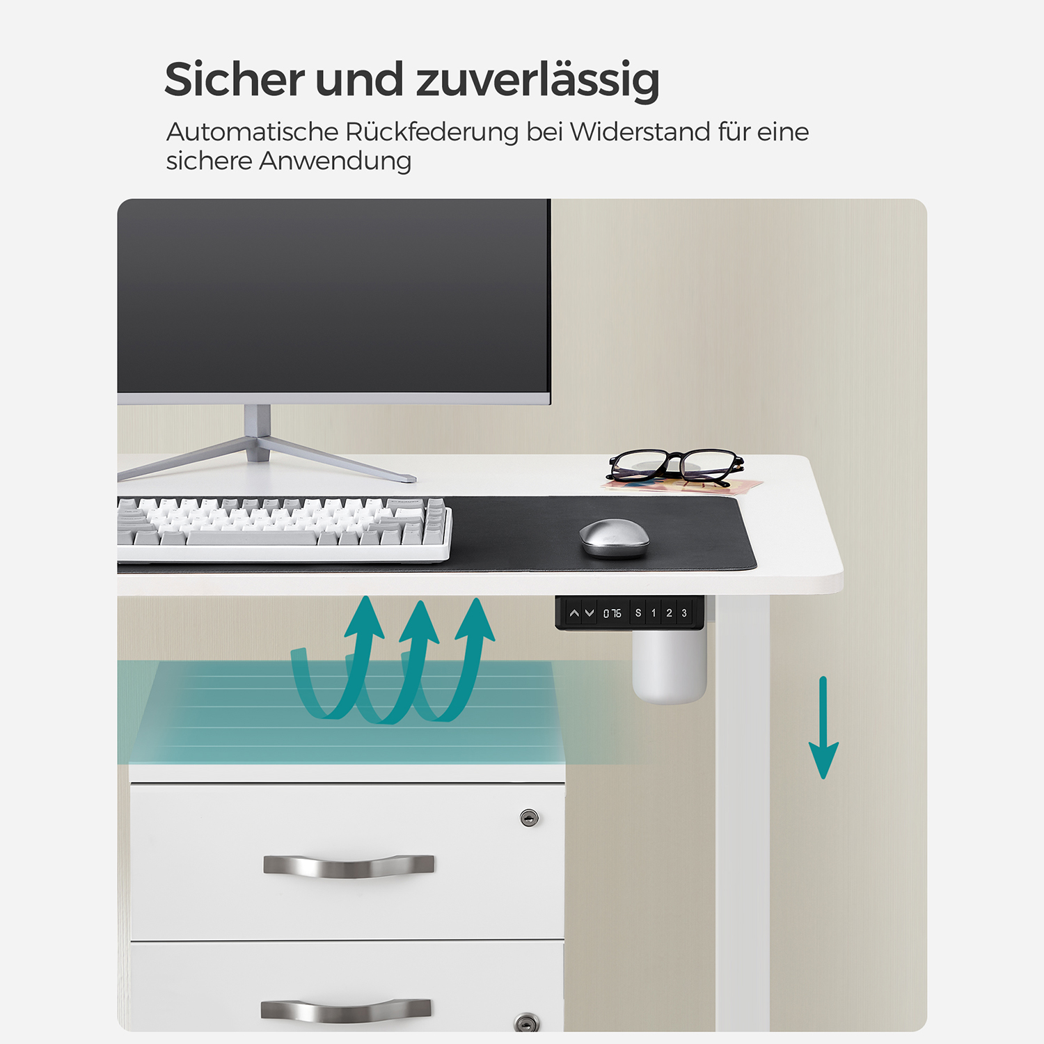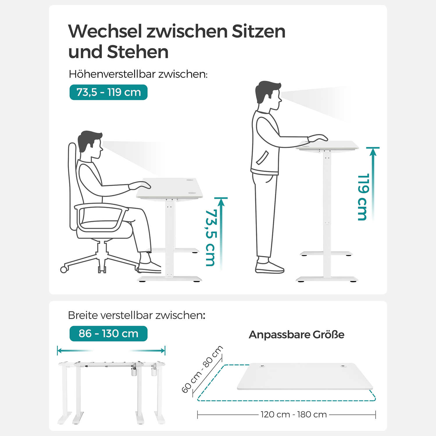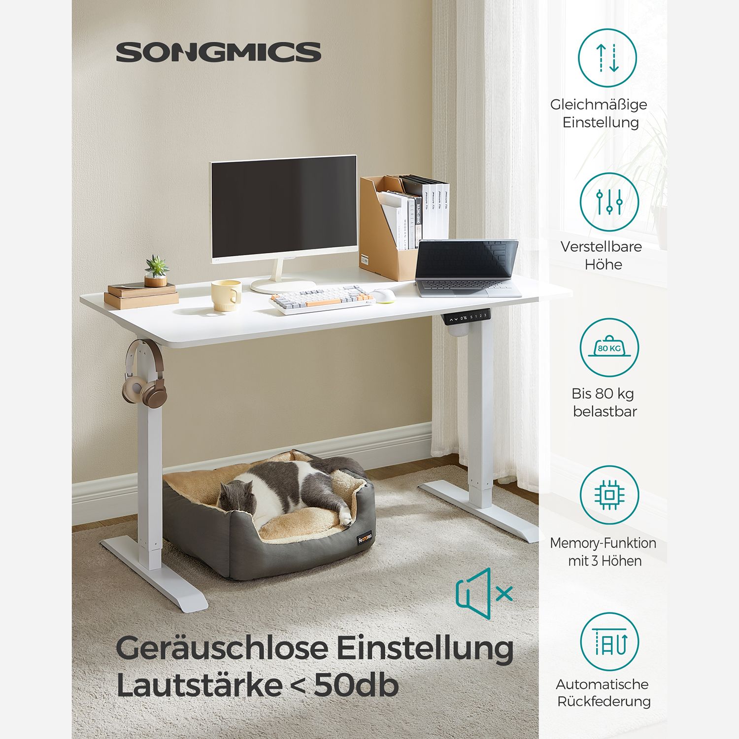 Fordele ved det elektriske skrivebord: – H?jdejusterbart fra 73,5 til 119 cm for skiftende kropsholdninger – Hurtig justeringshastighed 25 mm/s med lav st?j < 50 dB - Kvalitetsmotor for j?vn justering Produktdetaljer: - Farve: Hvid - Materiale: Sp?nplade, st?l - St?rrelse: 70 x 140 x (73,5-119) cm (D x B x H) - H?jdejustering: 71,5-117 cm - St?jniveau: < 50 dB - Justeringshastighed: 25 mm/s - Maks. statisk belastning: 80 kg - V?gt: 31,9 kg Leveringsomfang: - 1 x elektrisk bord - 1 x adapter - 1 x controller - 2 x kroge - 4 x ruller - 1 x tilbeh?rspakke - 1 x vejledning SONGMICS Bem?rkninger:- Produktet leveres i 2 pakker. V?r t?lmodig, hvis du kun modtager den f?rste pakke. Den anden leveres kort tid efter. - S?rg for, at bordrammen ikke hindres under l?fte- og s?nkeprocessen. Placer ikke bordet direkte op ad en v?g for at undg? ridser p? v?ggen.- Produktet er udelukkende beregnet til indend?rs brug. Hold alle elektriske komponenter v?k fra v?sker. - Hvis bordet h?ves eller s?nkes i 2 minutter, aktiveres overophedningsbeskyttelsen automatisk, og du skal vente 18 minutter, f?r du kan bruge h?jdejusteringen igen.- Opk?rselssikringen beskytter k?ledyr og b?rn mod st?d og ridser. Indstil f?lsomhedsniveauet efter behov i henhold til vejledningen. - Placer ikke tunge genstande, der overstiger den maksimale belastning p? 80 kg, p? produktet. - S?rg for, at controlleren er vandret, inden du tester h?jdejusteringen. Hold den ikke i h?nden under testen.