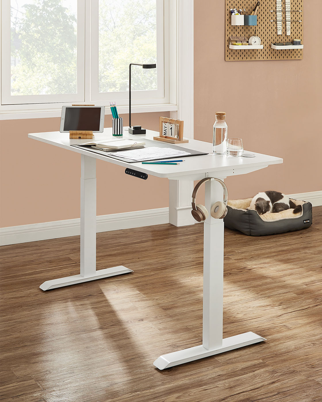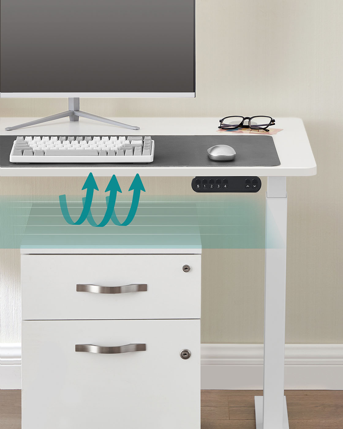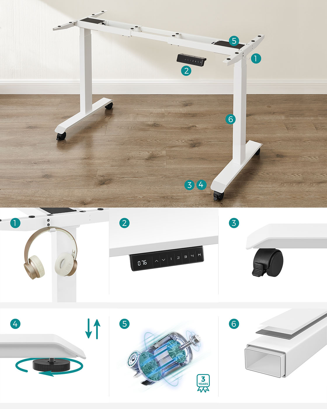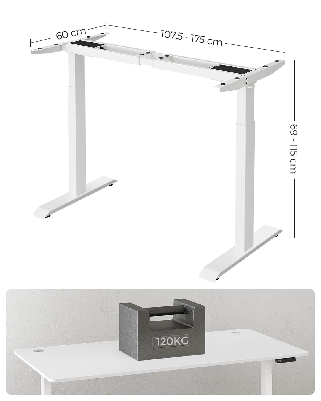 Produktdetaljer: Farve: Hvid Materiale: St?l St?rrelse: 60 x (107,5-175) x (69-115) cm (D x B x H) H?jdejustering: 69-115 cm St?jniveau: < 50 dB Justeringshastighed: 25 mm/s Maks. statisk belastning: 120 kgV?gt: 25,7 kgLeveringsomfang:1 x elektrisk skrivebordsstativ1 x adapter1 x controller2 x kroge4 x ruller1 x tilbeh?rspakke1 x vejledningSONGMICS Bem?rkninger:S?rg for, at bordrammen ikke hindres under l?fte- og s?nkeprocessen. Placer ikke bordet direkte op ad en v?g.Dette produkt er udelukkende beregnet til indend?rs brug. Hold alle elektriske komponenter v?k fra v?sker. Brug kun produktet i maksimalt 2 minutter ad gangen. Efter denne periode b?r bordrammen ikke bev?ges i 18 minutter for at undg? beskadigelse af motoren. Placer ikke genstande med en h?jde p? over 50 cm under bordet for at undg? beskadigelse under s?nkningen.