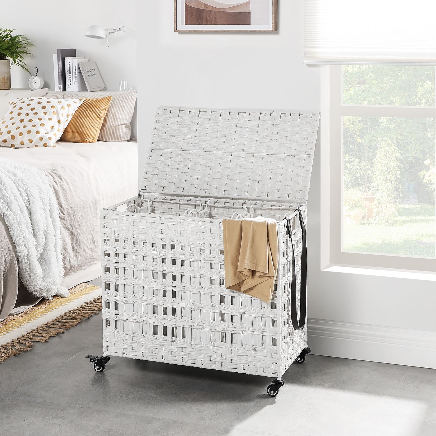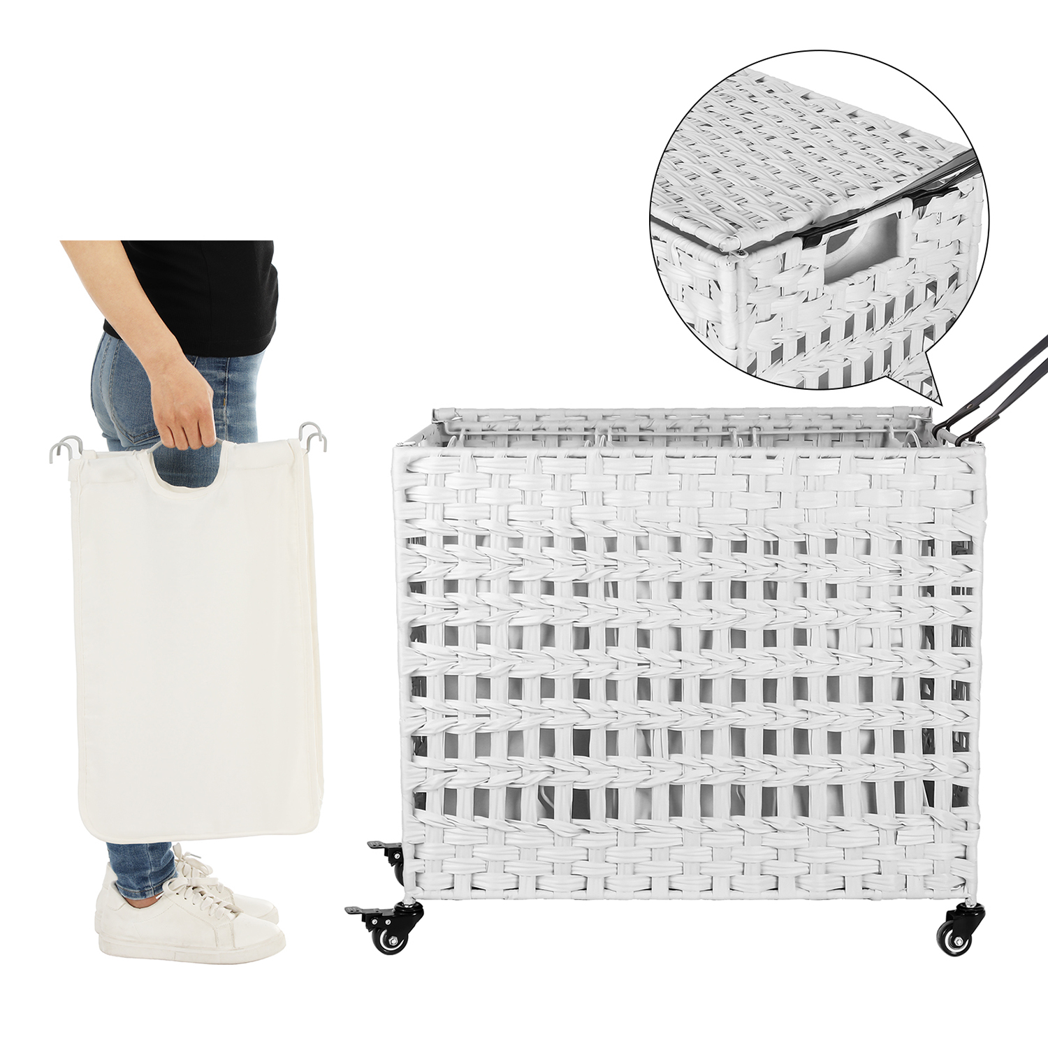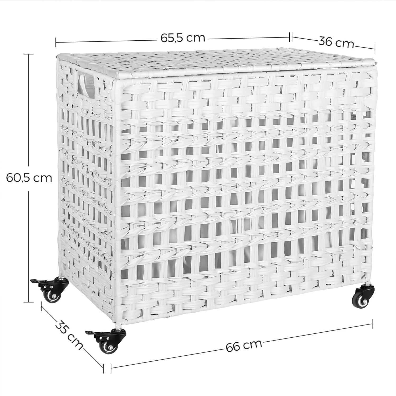 Et ryddeligt hjem er et lykkeligt hjem: Det er selvf?lgelig meget praktisk at smide snavset t?j p? gulvet, n?r man har taget det af. Men det g?r ikke kun dit hjem mere kaotisk, du skal ogs? samle dit snavsede t?j sammen p? vaskedagen, hvilket er besv?rligt. Hvorfor pr?ver du ikke denne vasket?jskurv? Den har 3 rum og er desuden forsynet med et l?g. Hermed kan du ikke kun opbevare dit snavsede t?j sorteret, men ogs? holde det skjult. Du kan forvente f?lgende fordele: Den h?ndflettede overflade giver denne kiste et s?rligt look. St?ttet af et robust metalstel vil denne vasket?jskurv holde i mange ?r.Du kan folde kurven sammen, n?r den ikke er i brug, og opbevare den pladsbesparende. De 3 poser kan tages ud enkeltvis og er desuden udstyret med h?ndtag. Du kan vaske poserne i vaskemaskinen, efter du har fjernet h?ndtagene. Den enkle struktur af denne kasse g?r det nemt at samle den. Denne vasket?jskurv passer perfekt i vaskerummet, sovev?relset, badev?relset eller stuen. Produktdetaljer:Farve: Hvid Materiale: PP-plast (polypropylen), metalstel, bomuld St?rrelse: 66 x 35 x 60,5 cm (L x B x H) V?gt: 5,4 kg Maks. statisk belastning: 27 kg Leveringsomfang: 1 x vasket?jskurv 1 x vejledning (DE, EN, FR, ES, IT)