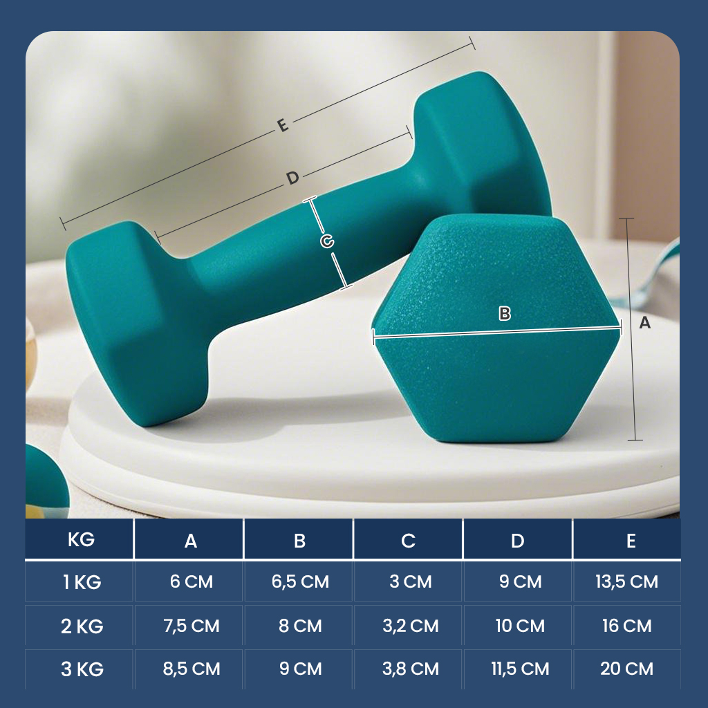 Start tr?ningen med h?ndv?gte !Begynd nu med at styrke dine muskler !Kvinder, der ?nsker at begynde med styrketr?ning eller dyrker det som en lejlighedsvis hobby, b?r ikke g? glip af dette h?ndv?gtss?t. K?b disse h?ndv?gte og integrer regelm?ssig h?ndv?gtstr?ning i din tr?ningsrutine! Praktisk kombination til tr?ning med lav v?gt! Nogle h?ndv?gte er for tunge og ikke egnet til begyndere. S? er det tid til dette lette h?ndv?gtss?t! Dette s?t, der best?r af 1 kg, 2 kg og 3 kg h?ndv?gte, er et hit for begyndere og mennesker, der ?nsker at tabe sig, opbygge styrke i arme og skuldre eller styrke musklerne i l?r og balder.Leveringsomfang 6 x h?ndv?gt 1 x h?ndv?gtstativ af PP-plast Produktdetaljer Farve: Limegr?n, akvamarin og gr? Materiale: St?bejern med neoprenbel?gning V?gt: 2 x 1 kg, 2 x 2 kg, 2 x 3 kg 1 kg: 13,5 x 6,5 x 6 cm (L x B x H); 9 cm (h?ndtagsl?ngde) 2 kg: 16 x 8 x 7,5 cm (L x B x H); 10 cm (h?ndtagsl?ngde) 3 kg: 20 x 9 x 8,5 cm (L x B x H); 11,5 cm (h?ndtagsl?ngde)