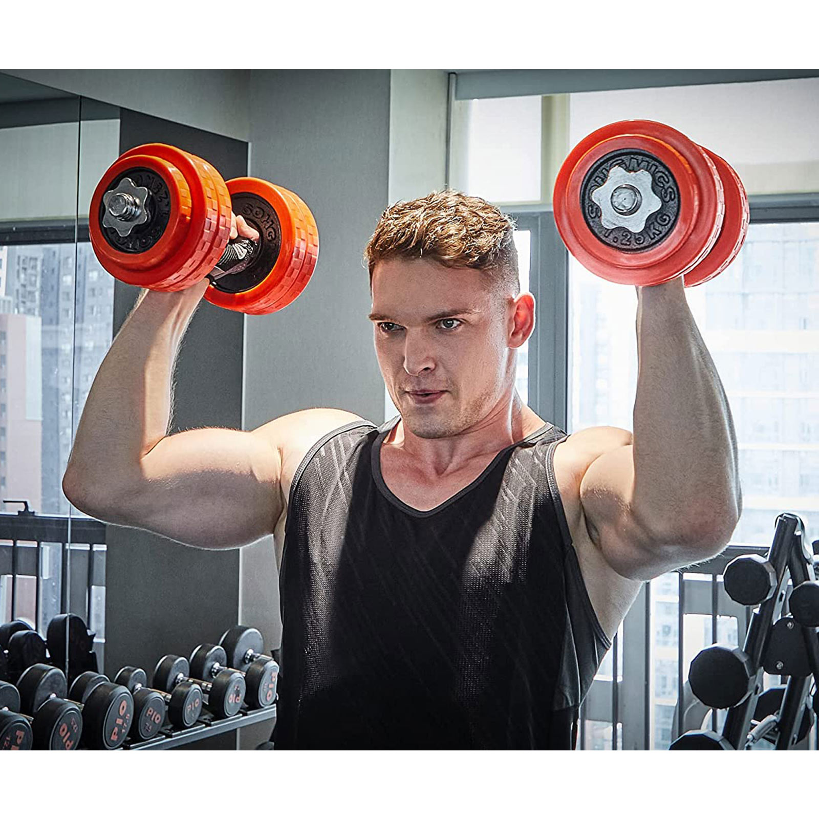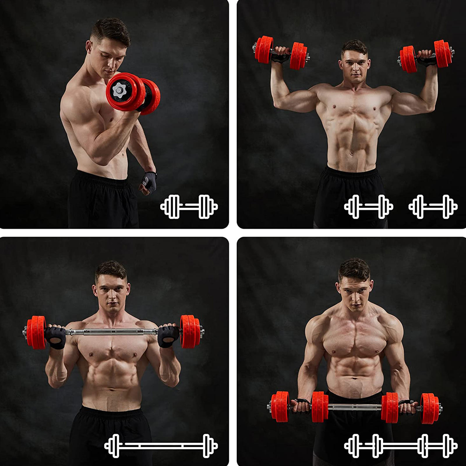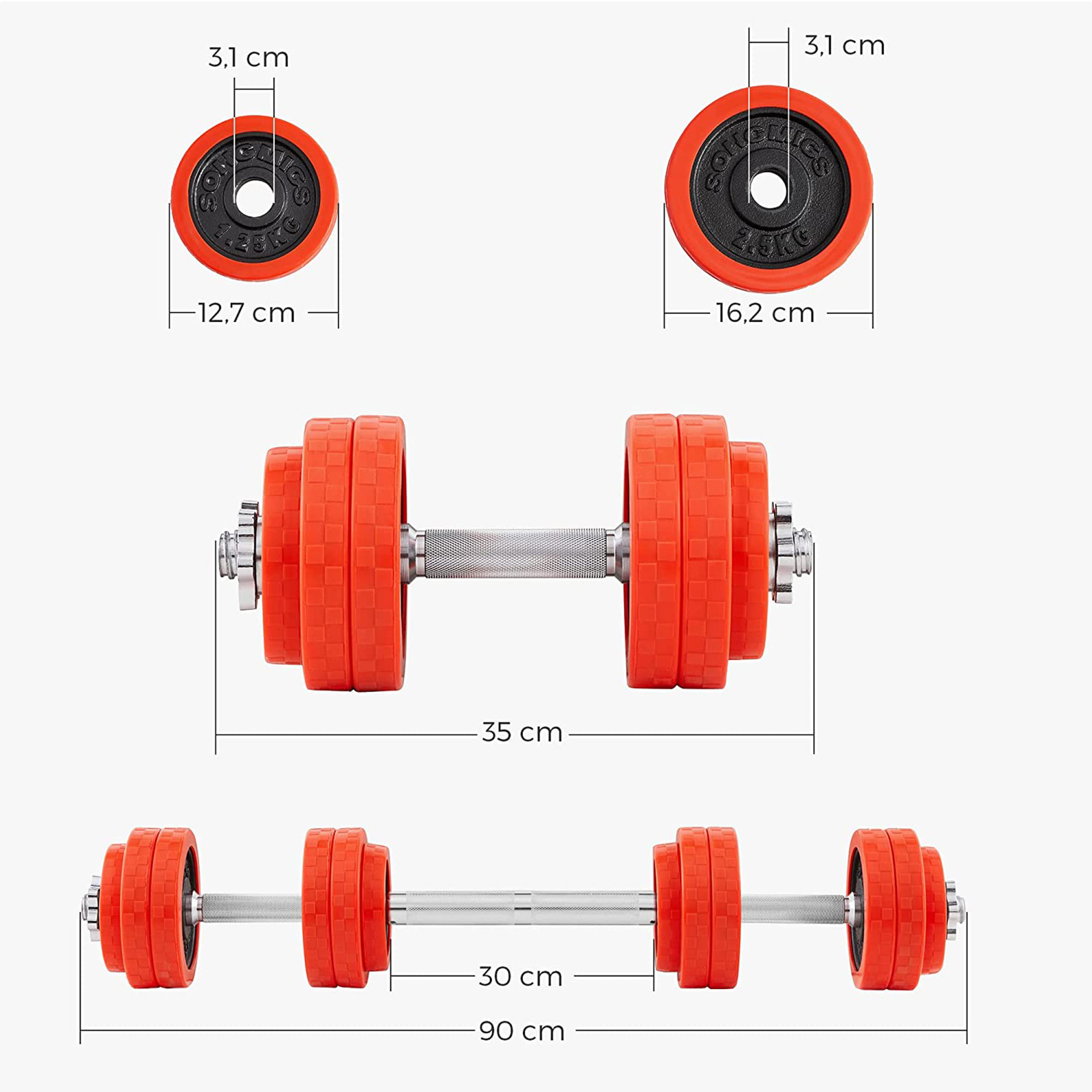 SONGMICS tilbyder fitnessudstyr af h?j kvalitet til alle, der ?nsker at opn? en ideel kropsform. Vores h?ndv?gtss?t er udviklet til at give dig en optimal tr?ningsoplevelse uden begr?nsninger i tid og plads. Det giver dig mulighed for… … at tilpasse din tr?ning: Forskellige skiver g?r det muligt at tilpasse v?gtene til din tr?ningsintensitet ved blot at kombinere dem, hvilket sparer dig penge og plads til ekstra v?gte.S?dan forvandler du dette h?ndv?gtss?t til en langv?gt: Med det specielle forbindelsesstykke, der er inkluderet i leveringen, f?r du en langv?gt p? et ?jeblik. Dette giver dig endnu flere muligheder for at opbygge musklerne i forskellige dele af kroppen og opn? bedre tr?ningsresultater.Produktdetaljer: Farve: R?d Materiale: Pulverlakerede st?bejernsskiver, galvaniserede jernst?nger, jernstjernebeslag, silikone beskyttelsesbetr?k Leveringsomfang: 4 x 2,5 kg skive 4 x 1,25 kg skive 2 x stang 4 x stjernebeslag 1 x forbindelsesr?r SONGICs bem?rkninger:F?r brug af h?ndv?gtene skal du p?f?re en rustbeskyttende olie p? overfladen. Af sikkerhedsm?ssige ?rsager m? h?ndv?gtene ikke opbevares p? h?je steder, hvorfra de kan rulle ned. B?rn m? ikke lege med h?ndv?gtene. L?g h?ndv?gtene forsigtigt fra dig efter tr?ningen for at undg? skader.
