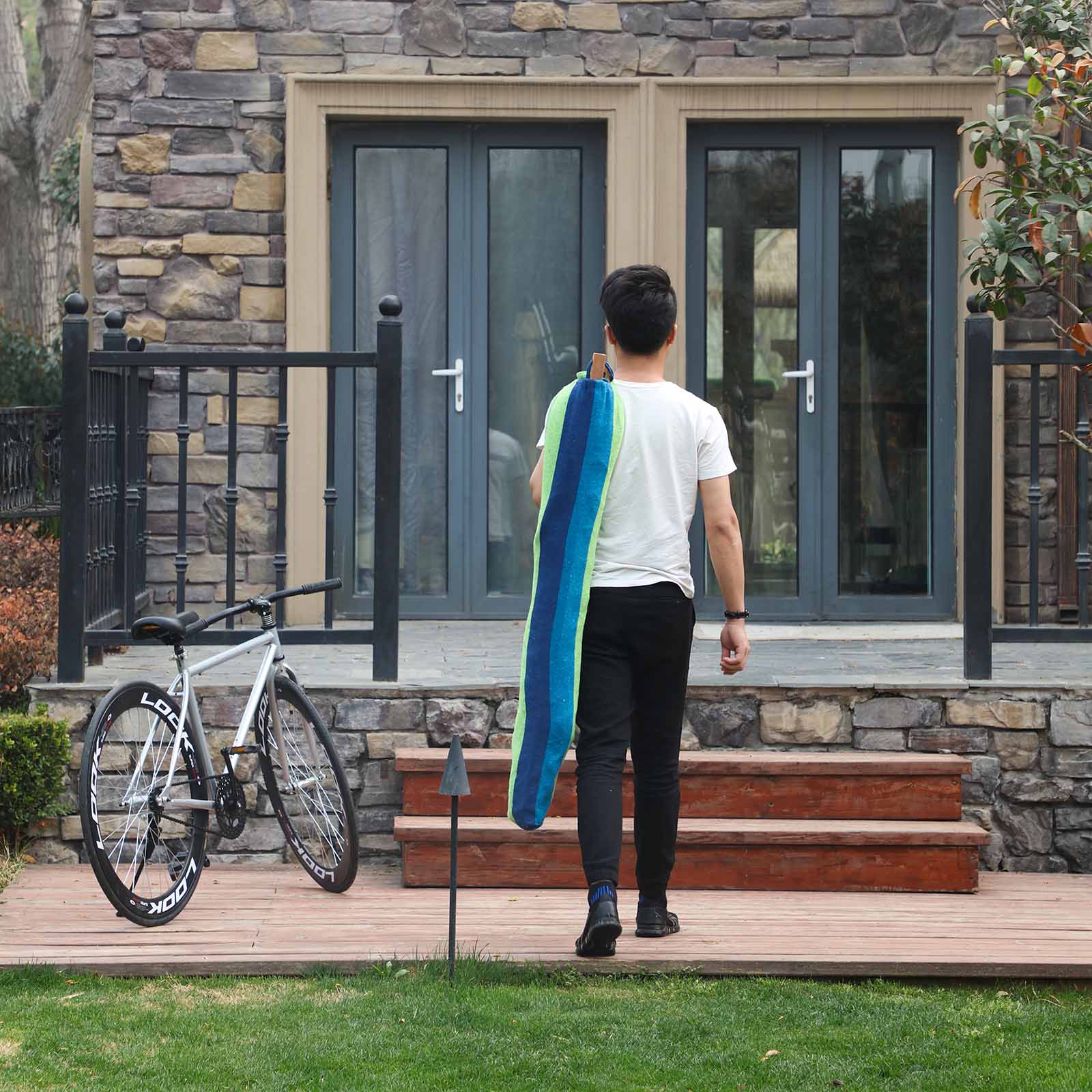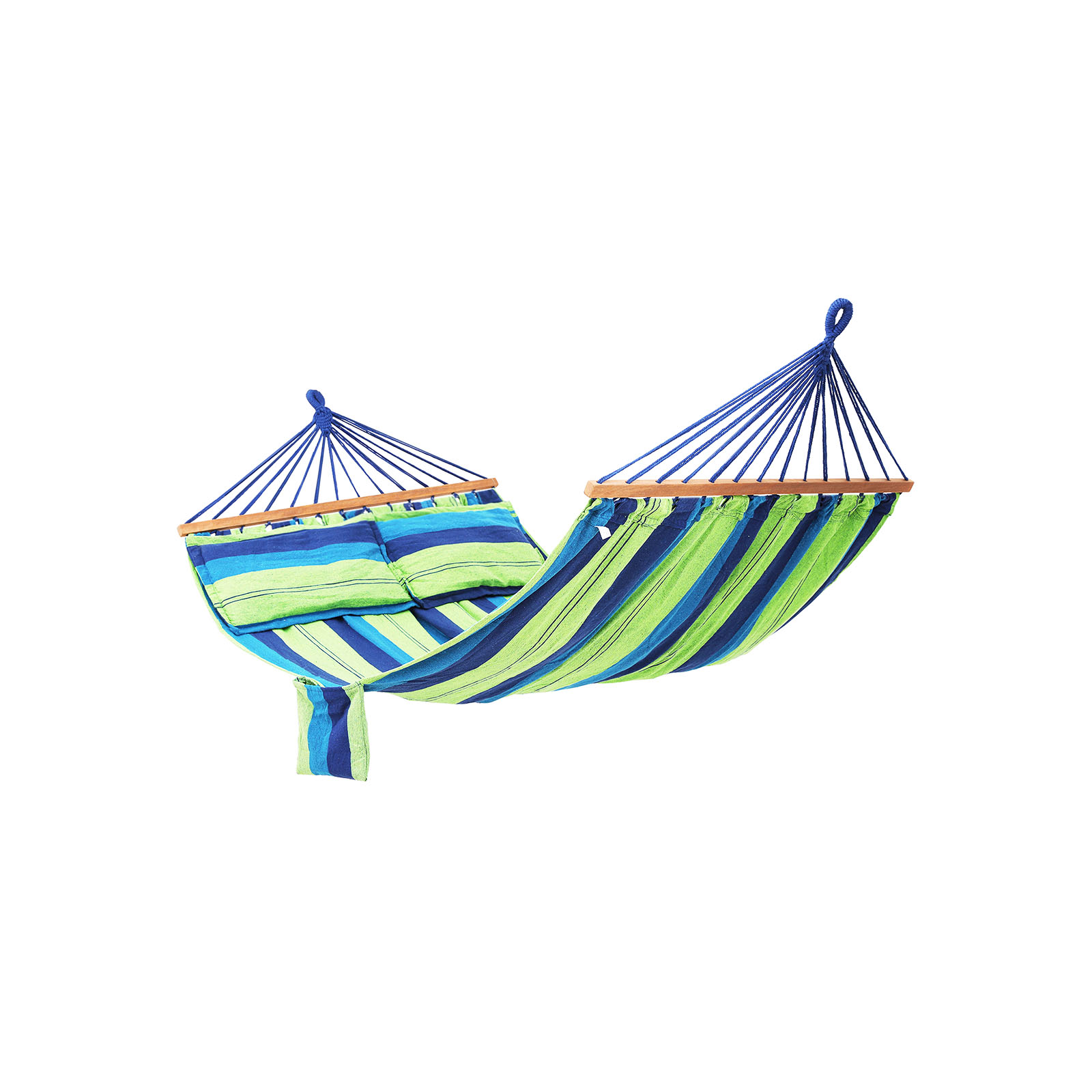 En perfekt sidde- og liggeplads til indend?rs og udend?rs brug / til store og sm?! Et absolut blikfang. Hvad er der bedre end at smide sig i Songmics h?ngek?je efter en anstrengende dag og bare lade sj?len sv?ve. Under den afslappende og beroligende gyngning opn?r du fysisk og psykisk velv?re. Friske, muntre farver og et stort stofareal g?r vores h?ngek?je til en oase af ro for dig. Uanset om det er i haven, p? altanen eller p? camping, lover det store stofareal ekstraordin?r komfort. Vores m?tte er ultralet, slidst?rk og stabil. Den kan bruges som sofa, gynge og endda som vugge til b?rn. Om n?dvendigt kan den sp?ndes fast i en h?ngek?jestativ eller blot fastg?res mellem to tr?er! Den lave v?gt og de kompakte m?l g?r h?ngek?jen til den ideelle ledsager. Bem?rk: 1. N?r du folder h?ngek?jen ud, skal du v?re opm?rksom p? r?kkef?lgen af foldetrinnene, s? du kan folde m?tten korrekt sammen igen og l?gge den i tasken. 2. Overv?g b?rnene, n?r de leger i h?ngek?jen. 3. H?ngek?jens farve kan afvige lidt fra det afbildede produktbillede ? dette skyldes lysindfaldet og sk?rmens farvevisning. 4. V?r opm?rksom p?, at en h?ngek?je udvider sig ved brug. I dette tilf?lde skal du forkorte det monterede reb. Bem?rk dog, at det laveste punkt p? den belastede h?ngek?je skal v?re 20-40 cm over gulvet. Undg? ogs? at sp?nde h?ngek?jen mere. 5. B?ndene til oph?ngning samt de n?dvendige kroge er ikke inkluderet. Men disse kan bestilles separat hos os. Produktdetaljer: – Materiale: 70 % bomuld + 30 % polyester, 320 g/m? – Liggeflade: 210 x 150 cm – Samlet l?ngde: 300 cm – Pude: 70 x 40 cm – Tv?rstang: 120 x 3,2 x 2,2 cm – Maks. belastning: 300 kg Leveringsomfang: – 1 x h?ngek?je med st?nger – 2 x puder – 1 x transporttaske