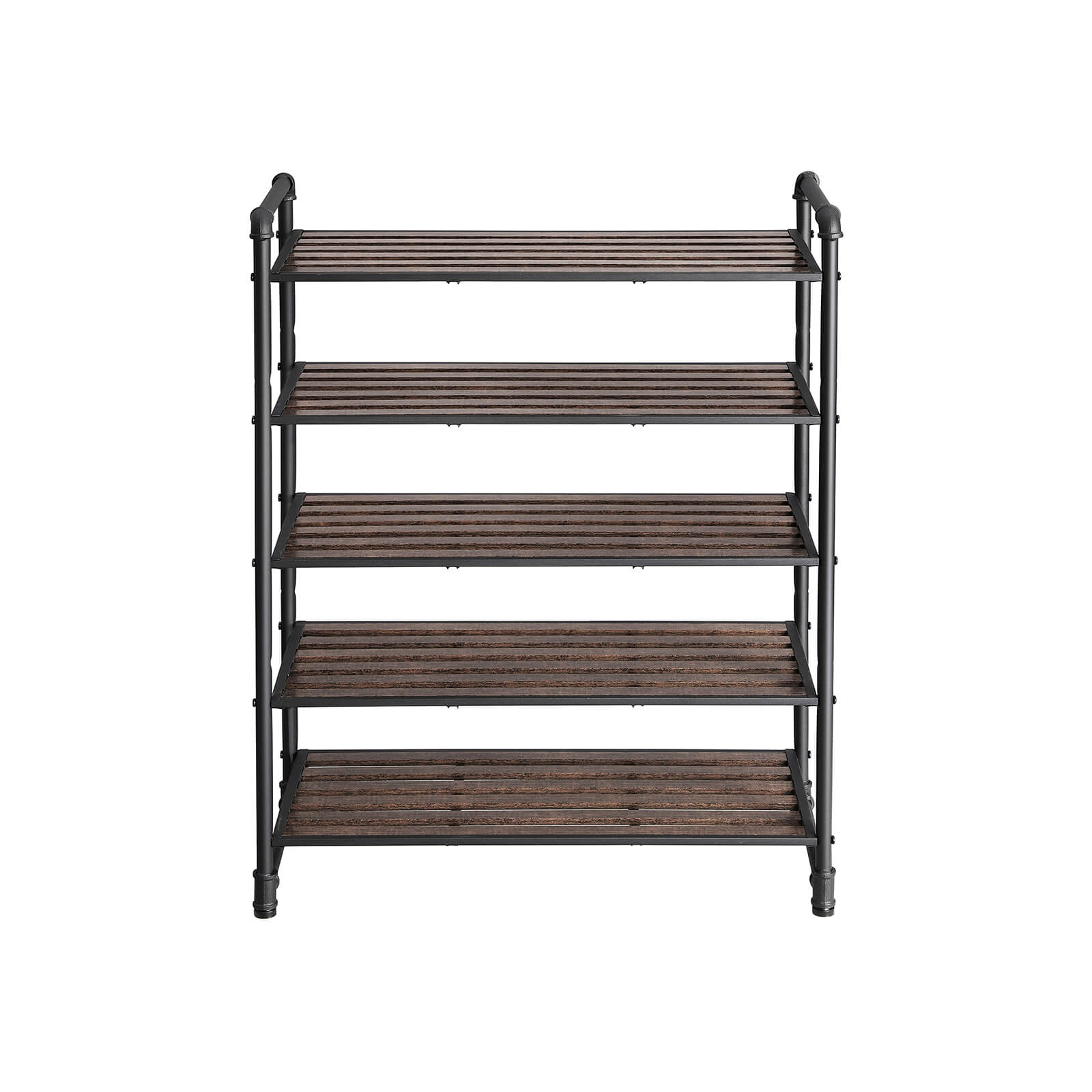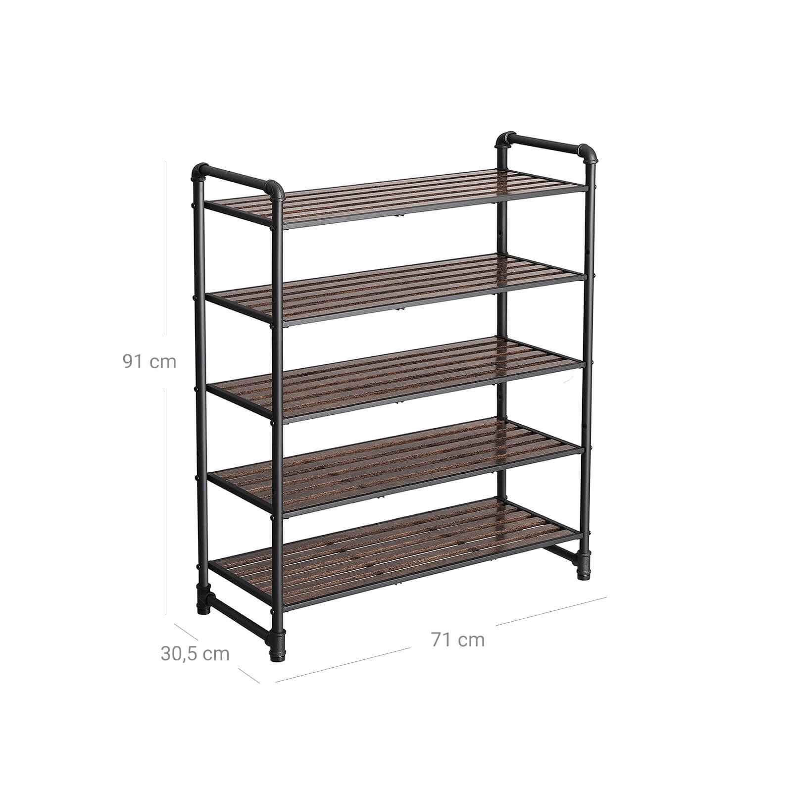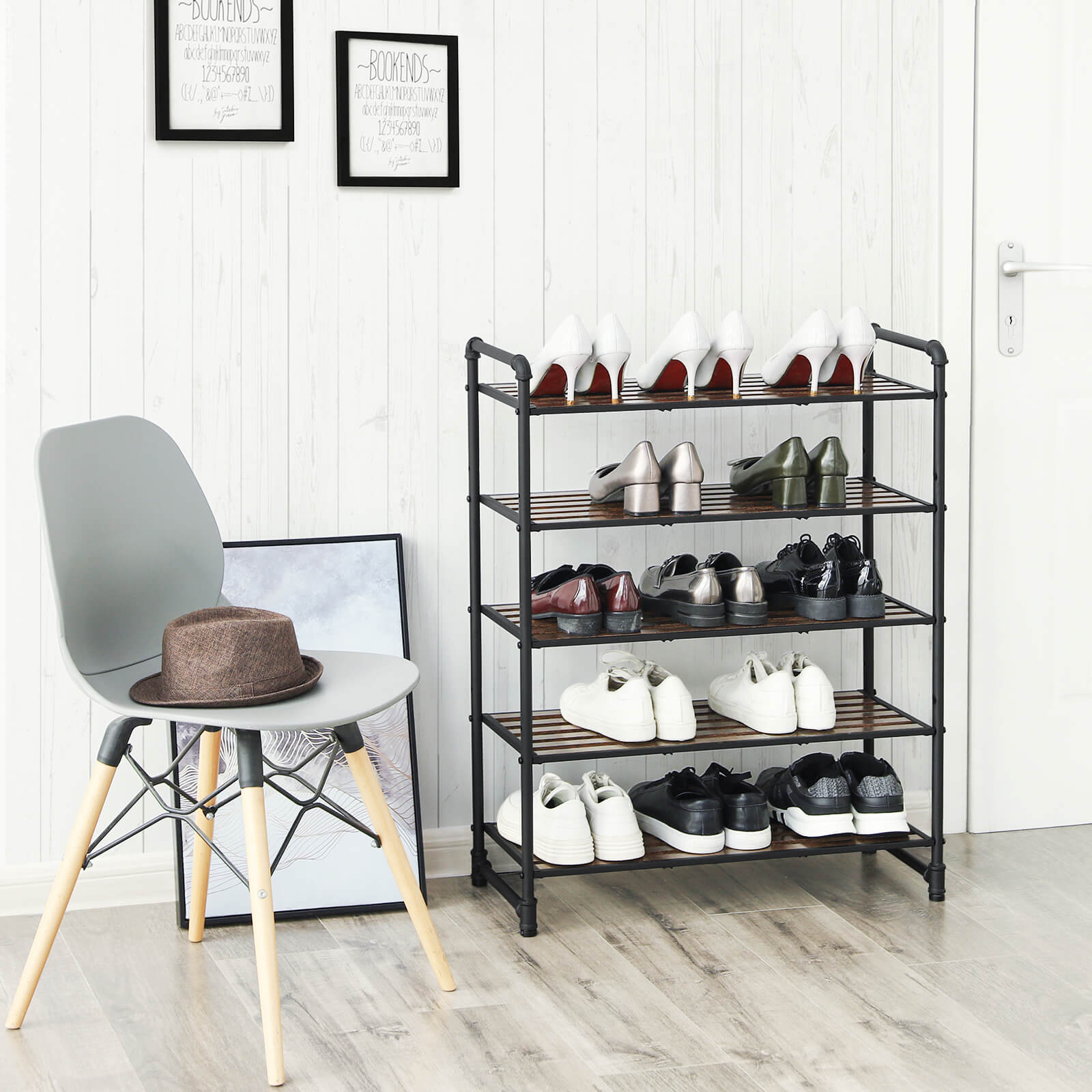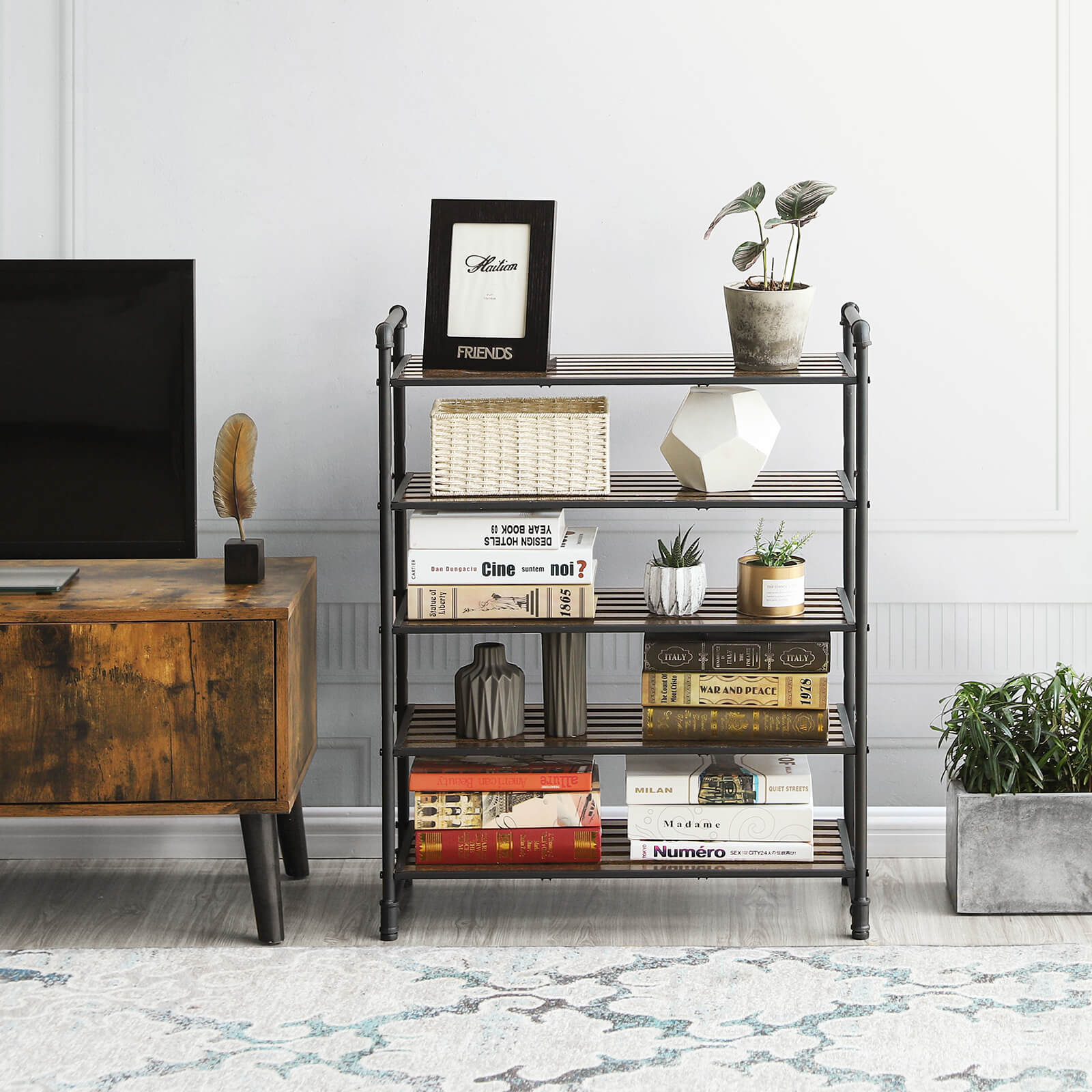 En harmonisk stil Denne 5-etagers reol fra SONGMICS med pulverlakeret metalramme og MDF-hylder kombinerer perfekt rustik charme og urbant design, hvilket kulminerer i en klassisk fremstilling af den industrielle stil. Denne mellemstore reol (71 x 30,5 x 91 cm) passer perfekt ind i ethvert moderne rum ? uanset om det er stuen, entreen eller garderoben ? men ogs? udenfor p? terrassen. Flere muligheder giver et lykkeligere hjem Med 2 h?jdejusterbare hylder (2. og 4. niveau) og muligheden for at forbinde 2 eller flere reoler med hinanden har du mange muligheder for at indrette dit rum efter dine ?nsker og stadig g?re det dekorativt ? endelig et stilfuldt og ryddeligt hjem med lidt mere flair! Produktdetaljer: – Farve: mat sort – Materiale: pulverlakerede jernr?r, MDF – Produktst?rrelse: 71 x 30,5 x 91 cm (B x D x H) – Afstand mellem hylderne: 17 cm (ikke justerbar h?jde); 12/22 cm (justerbar h?jde) – V?gt: 7,1 kg – Maks. belastning pr. hylde: 20 kg Leveringsomfang: – 1 x skoholder – 1 x vejledning (DE, EN, FR, ES, IT)