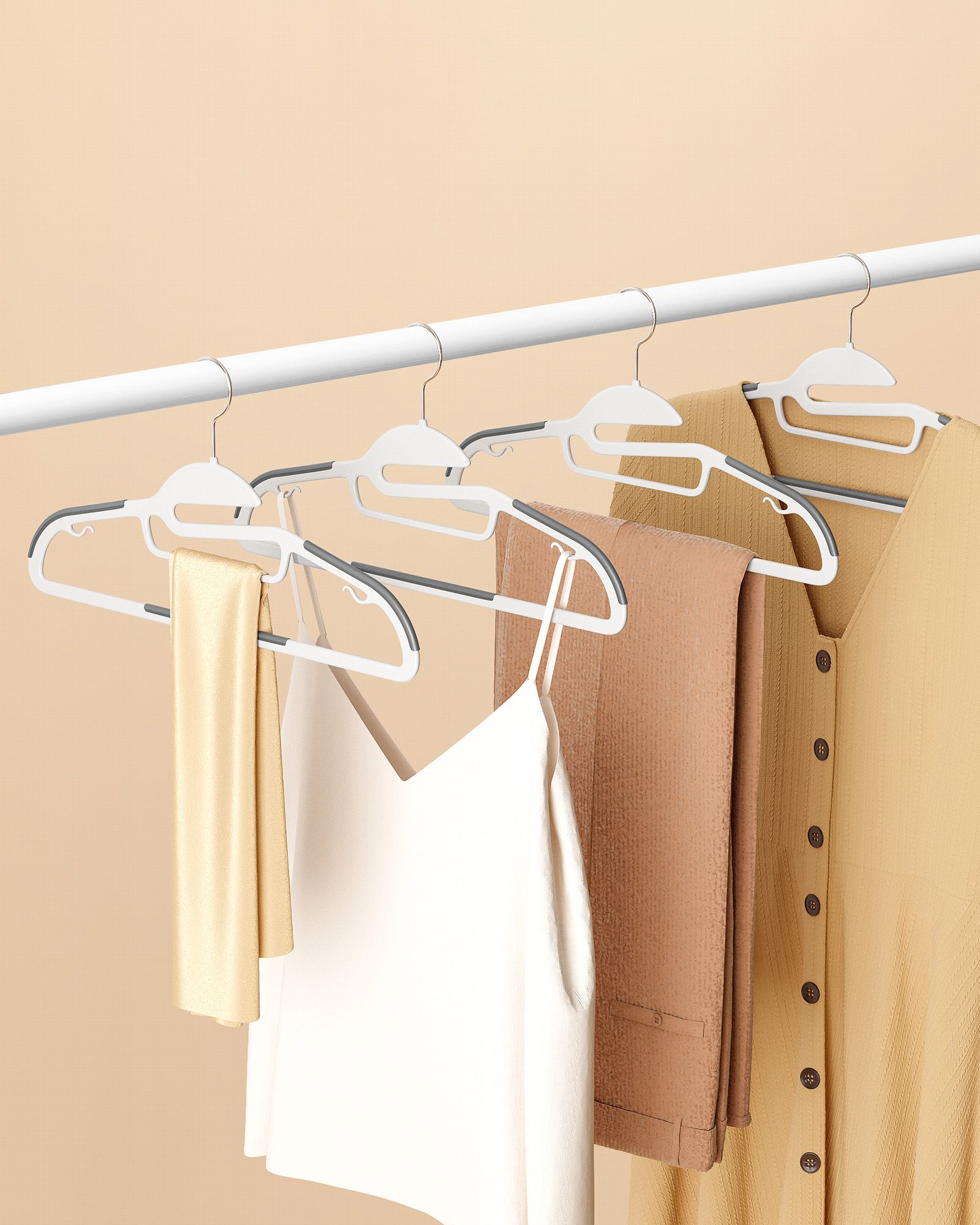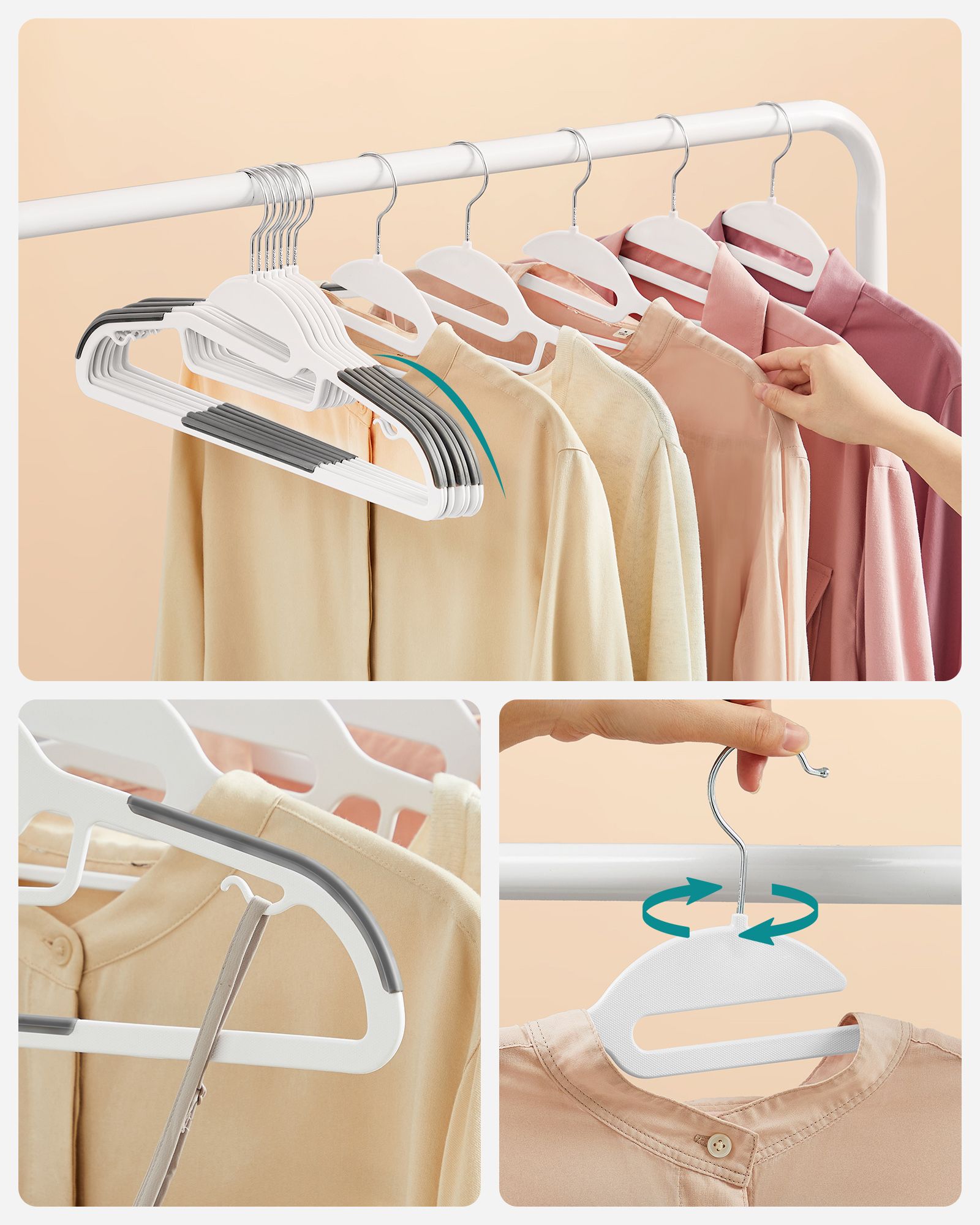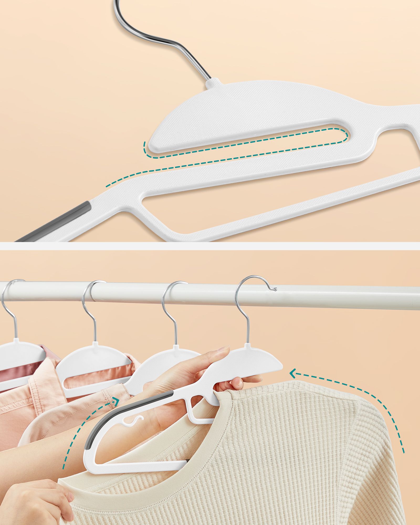 Fleksible b?jler til forskellige bekl?dningsgenstande B?jlerne har hver 2 sm? kroge til stroptoppe, bh’er, nederdele, bluser og bukser med l?kker. Derudover kan du h?nge dine bukser p? midterstangen og t?rkl?der og slips p? den lille midterstang. Skridsikker og slank designTakket v?re gummiindsatserne p? skulderomr?det og p? midterstangen kan jakker, veste og bukser h?nges sikkert op. B?jlerne er kun 0,5 cm tykke og tager derfor kun lidt plads i kl?deskabet. De er dog robuste, ikke let skr?belige og kan uden problemer b?re tunge bekl?dningsgenstande. Mere plads i kl?deskabet Endelig kan du h?nge jakker og bukser sammen p? en b?jle. Et komplet outfit kan s?ledes samles p? en b?jle ? s? sparer du ikke kun plads i kl?deskabet, men ogs? tid, som du ellers ville have spildt p? at lede efter passende t?j! Produktdetaljer: – Farve: Hvid-gr? – Materiale: ABS-plast, metal-kroge – St?rrelse pr. b?jle: 41,5 x 0,5 x 22,5 cm (L x B x H) – V?gt pr. b?jle: 86 g – Maks. statisk belastning pr. b?jle: 5 kg Leveringsomfang: – 50 x b?jler SONGMICS Bem?rkninger:- Hold b?jlerne v?k fra ant?ndelseskilder. – Brug ikke b?jlerne i rum med h?j temperatur. – H?ng ikke for tunge genstande og t?j p? b?jlerne. – Brug ikke disse b?jler i en t?rretumbler.