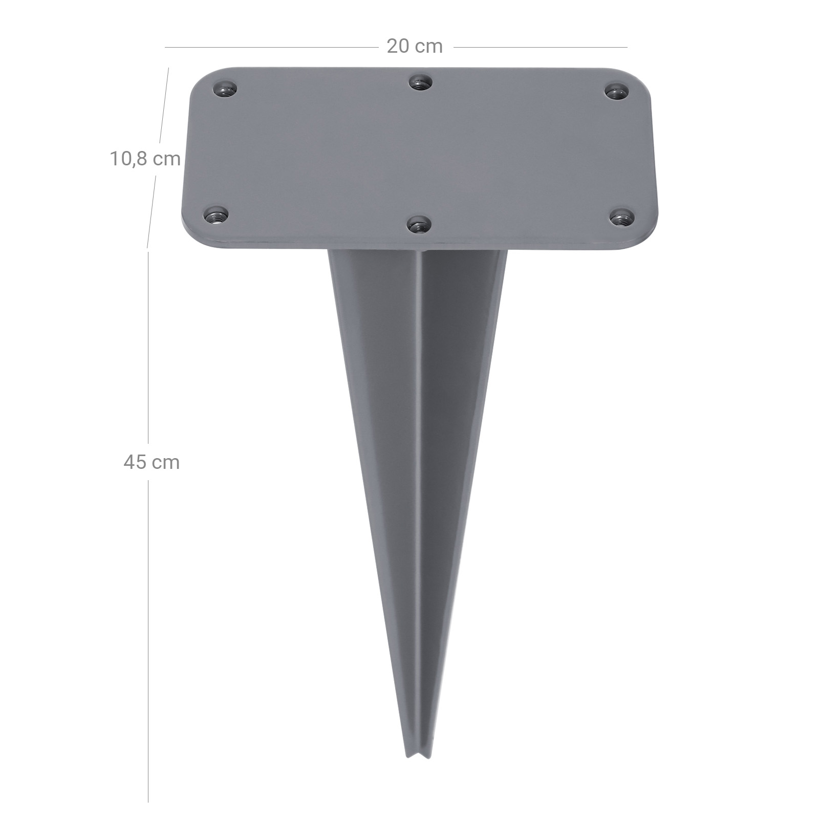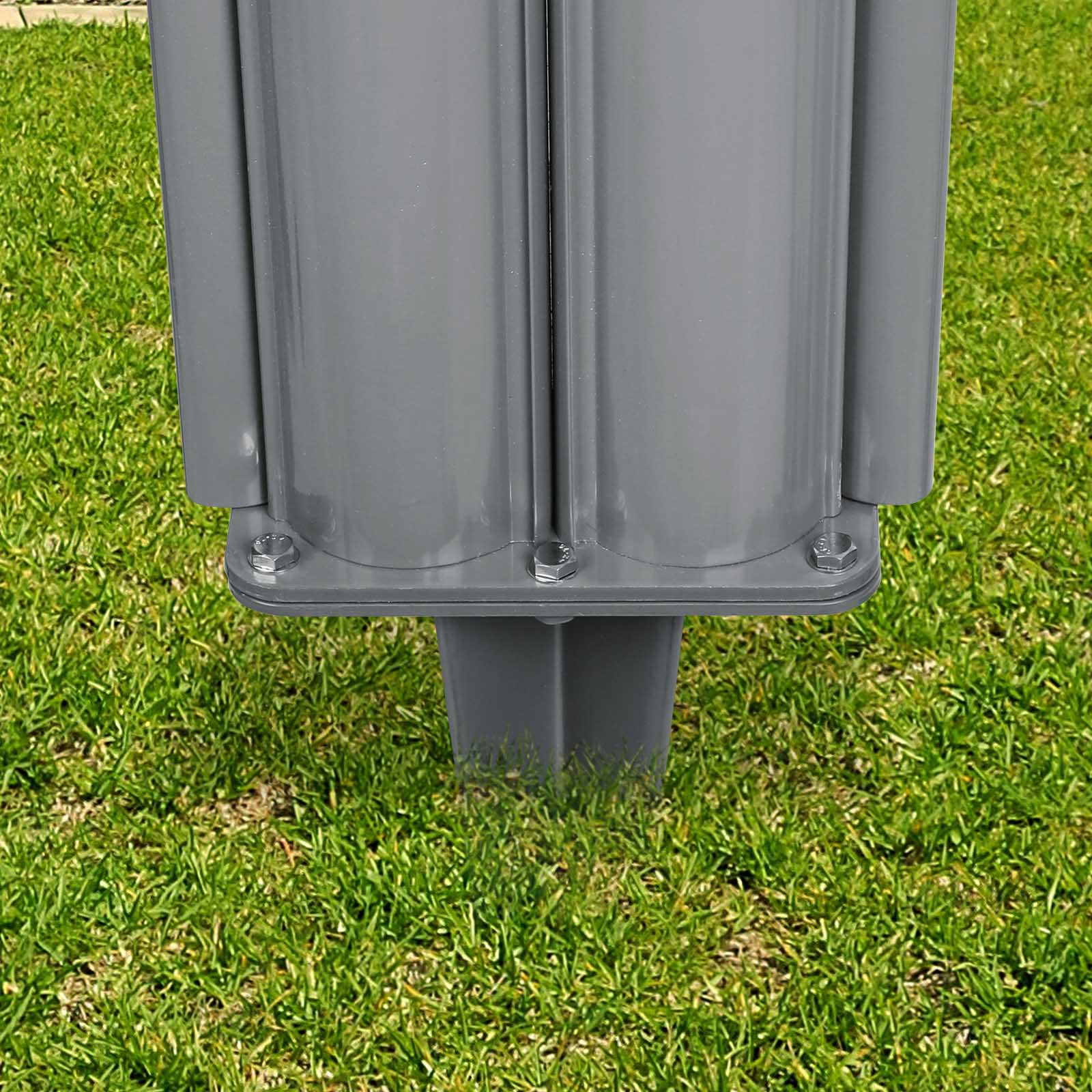 Sikker fastg?relse i haven Den dobbelte sidefortelt fastg?res sikkert i havens jord og gr?spl?ne med jordankeret. S? kan forteltet fleksibelt ops?ttes p? det ?nskede sted uden f?rst at skulle grave et hul og st?be beton. Hurtig montering Jordankeret sl?s blot ned i jorden. Markisekassen skrues fast p? jordankeret med de medf?lgende skruer, 3 skruer p? hver af de modst?ende sider. Skruerne leveres med skiveunderlag. H?jkvalitetsmateriale for lang levetid Pulverlakeret jern sikrer en lang levetid for jordankeret. Det holder fast i jorden og ruster ikke. Kontroller dog regelm?ssigt skruerne for at sikre, at de sidder godt fast. Produktdetaljer: Materiale: Pulverlakeret jern M?l: 20,2 x 10,7 x 46 cm (B x D x H) H?jde: 46 cm V?gt: 2,2 kg Farve: Gr? Leveringsomfang: 1 x Jordhylster 6 x Skruer med skiver