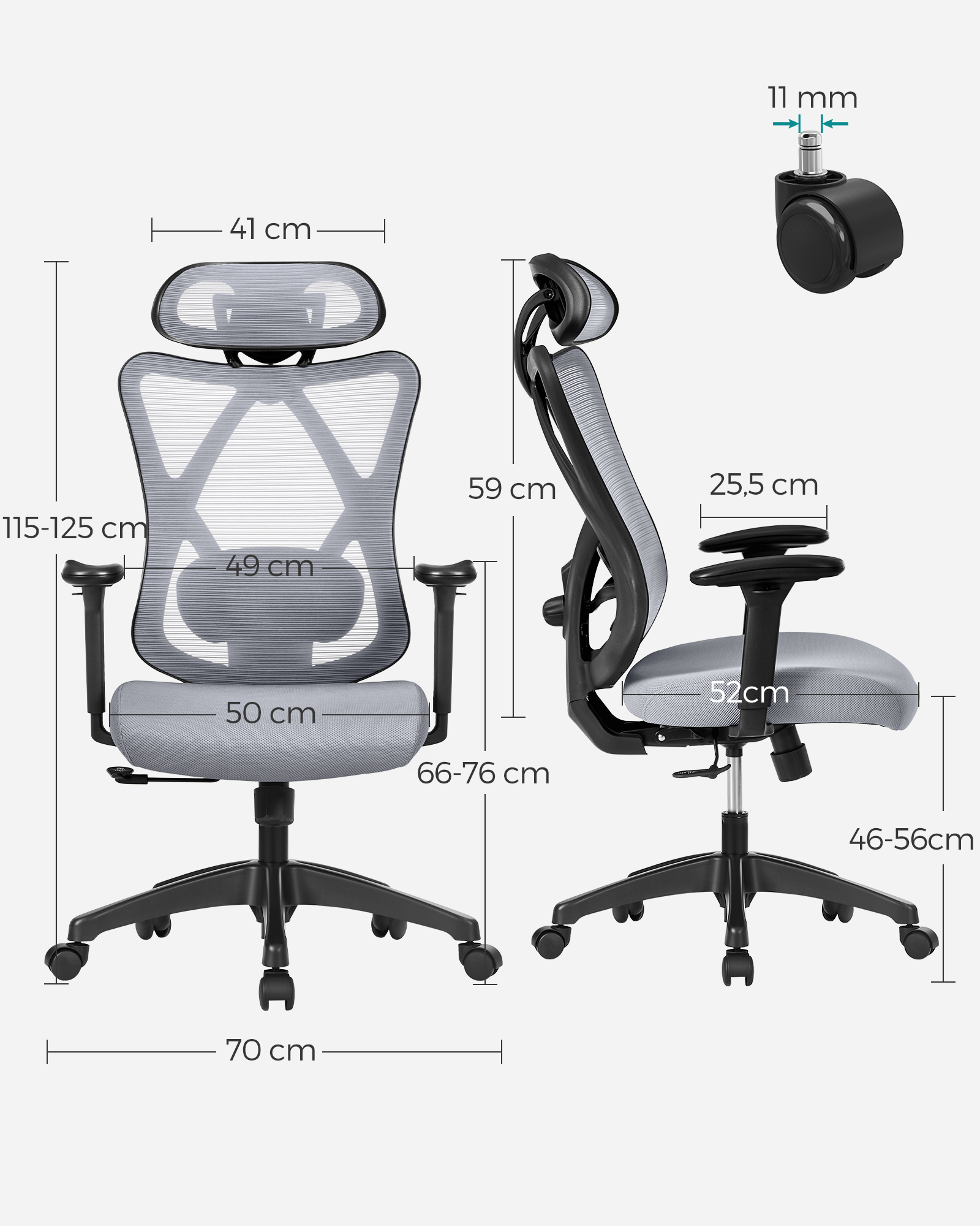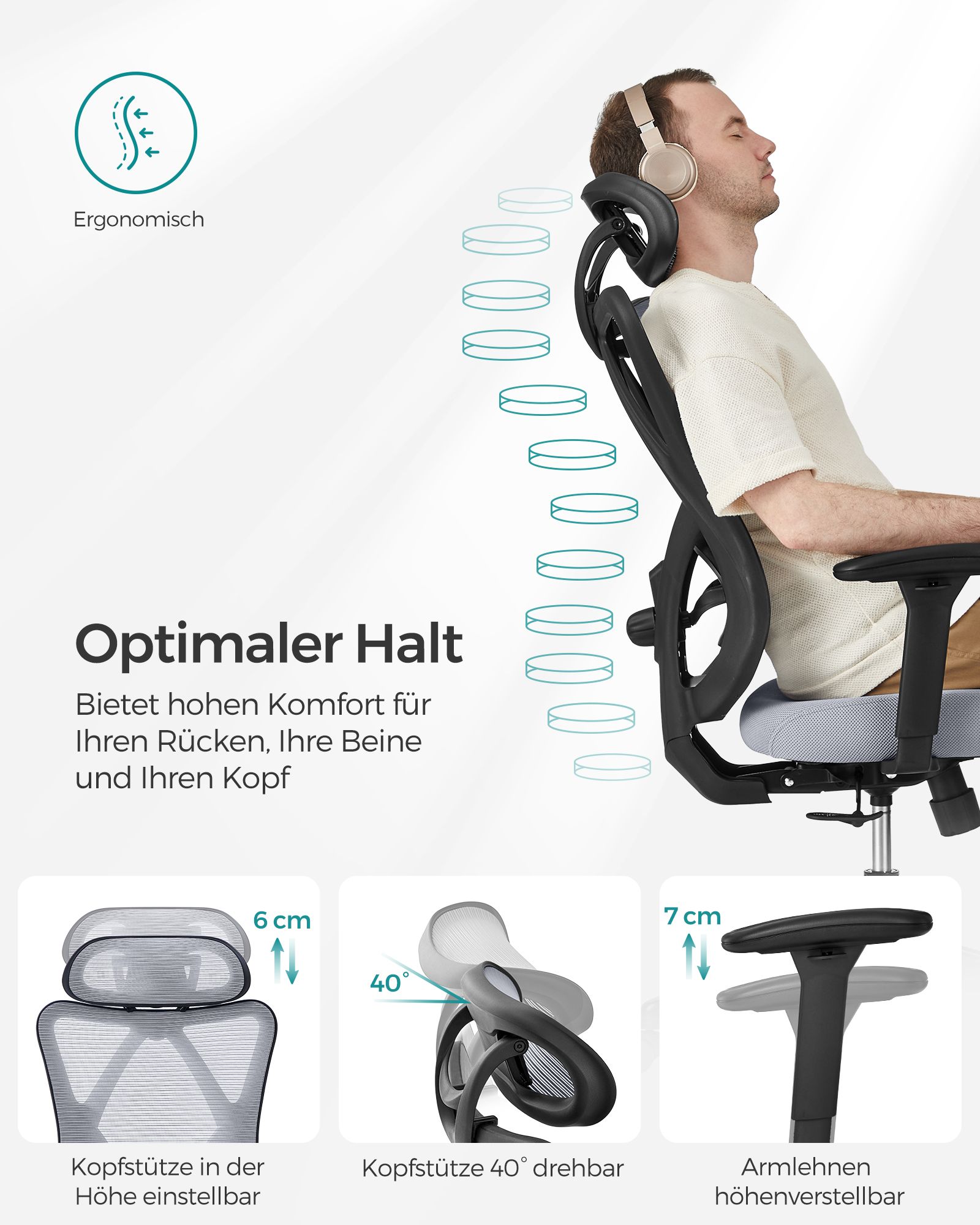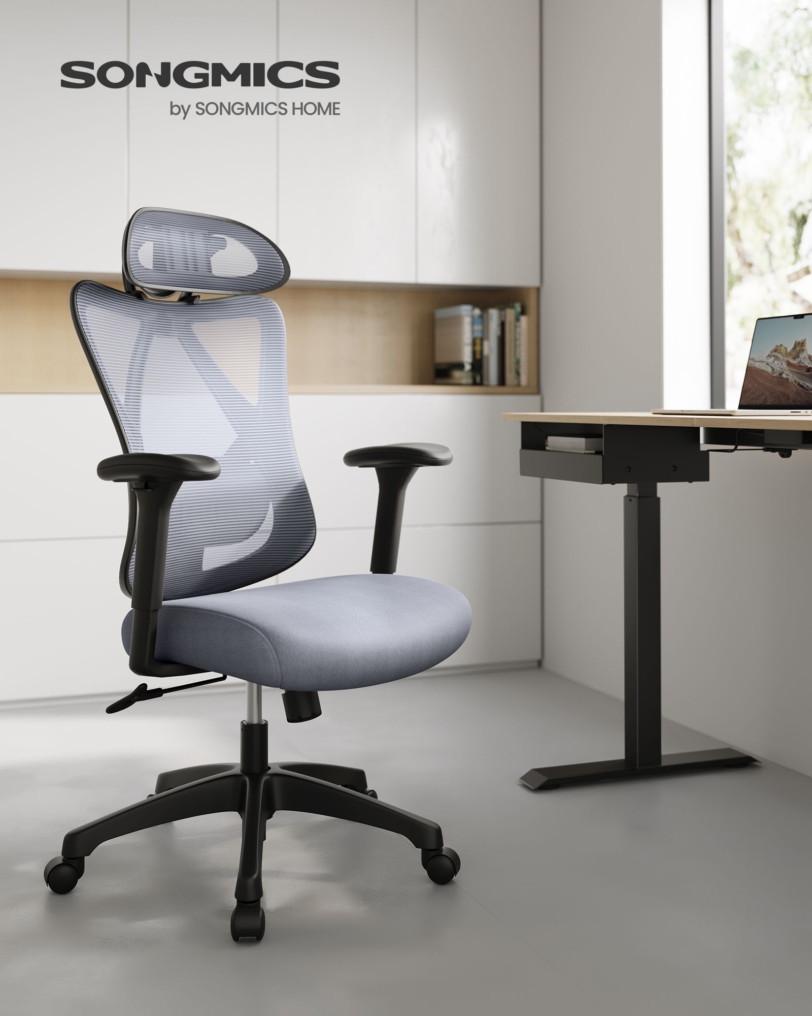 SONGMICS kontorstol, ergonomisk skrivebordsstol, computerstol, netstol, justerbar l?ndest?tte og nakkest?tte, belastbar op til 150 kg, h?jdejusterbar, sort OBN063B01