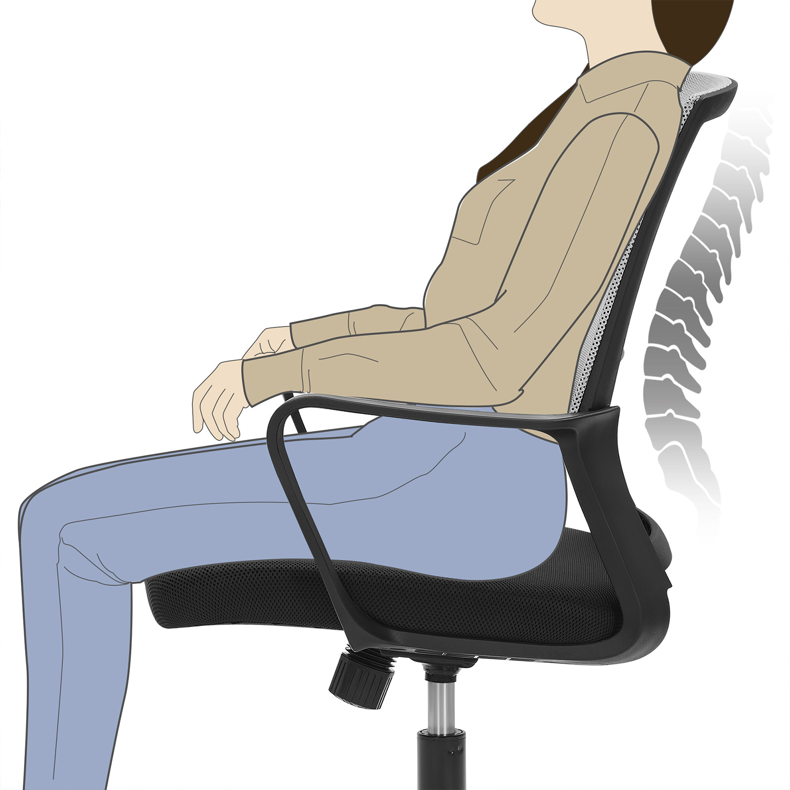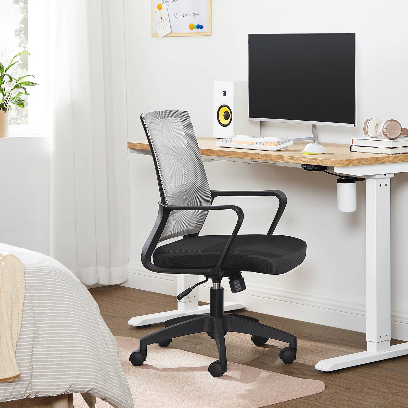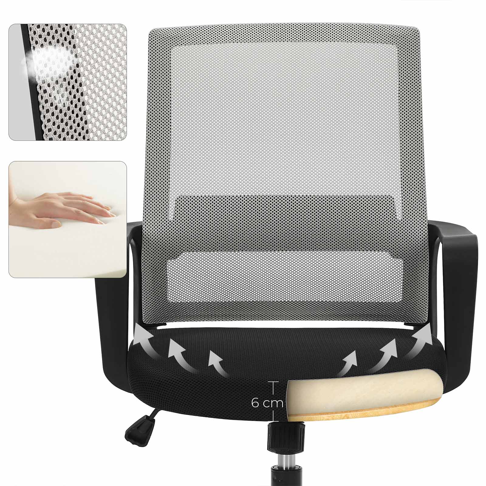 Ikke kun velegnet til kontorer: Denne netstol giver dig ogs? en behagelig siddeplads i dit arbejdsv?relse, n?r du spiller eller l?ser foran et stort vindue. Mange funktioner: Tr?k h?ndtaget under stolen udad for at aktivere vippefunktionen. S? kan rygl?net og s?det vippes op til 15? bagud samtidig. Modstanden i vippefunktionen kan ogs? justeres. Du skal blot dreje p? drejeknappen under s?det. Produktdetaljer: Farve: Gr? Materiale: Polyester, PP-plast, skum, nylon, st?l Samlet st?rrelse: 52 x 58,5 x (89-97) cm (L x B x H) S?deh?jde: 42-50 cm S?deflade: 50,5 x 48 cm (L x B) Rygst?ttens m?l: 47 x 50 cm (B x H) Arml?nets h?jde fra s?det: 17 cm V?gt: 8,5 kg Maks. statisk belastning: 120 kg Leveringsomfang: 1 x kontorstol 1 x tilbeh?rspakke 1 x vejledning
