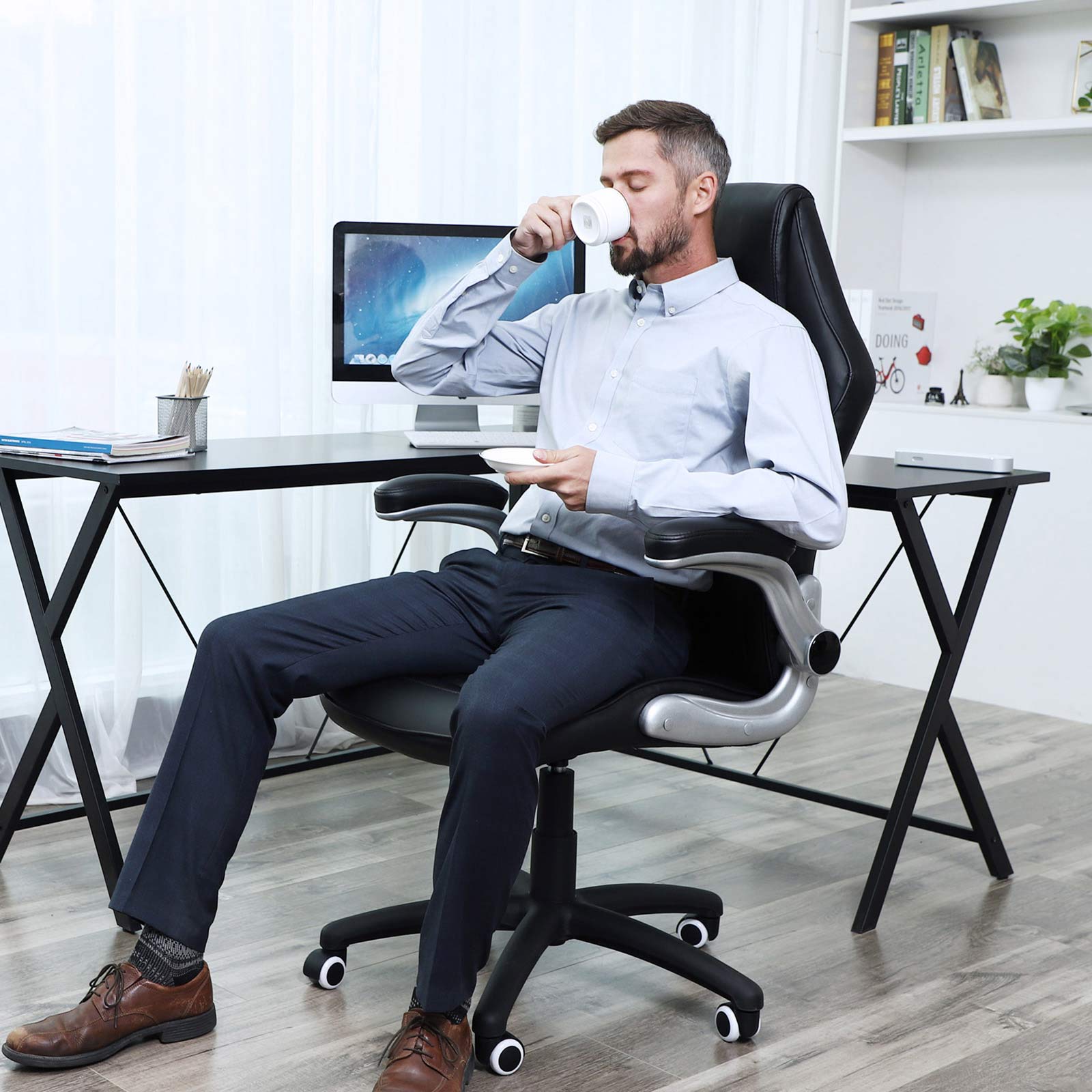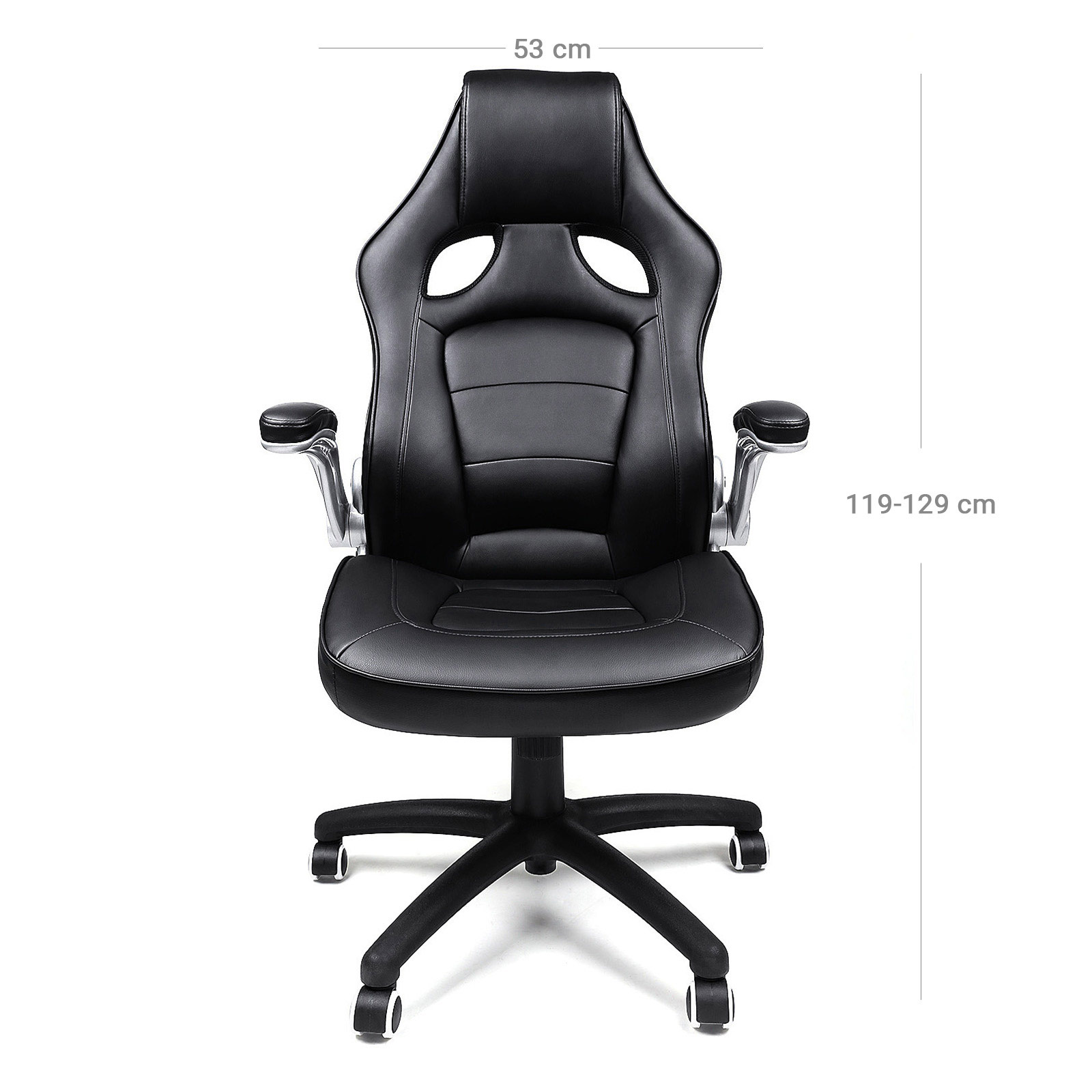 Beskrivelse: – Songmics er altid kundeorienteret og g?r sit yderste for at tilbyde produkter af h?j kvalitet til en god pris. Sogmics kontorstol i stilfuldt design kombinerer funktionalitet og komfort med forn?jelse! – Med materialer af h?j kvalitet og forbedrede tilbeh?rsdele er kontorstolen fra Songmics virkelig komfortabel, praktisk og holdbar. Et absolut blikfang i dit rum! Bem?rk: – N?r du samler st?ttedelen, skal du v?re opm?rksom p?, at siden med m?rket “Front” skal vende fremad. – Tag fat i den bageste h?jre h?ndtag, og tr?k i den, s? kan du justere s?deh?jden trinl?st ved at belaste eller aflaste stolen, mens h?ndtaget er trukket, indtil den ?nskede s?deh?jde er n?et. Tr?kker du h?ndtaget udad, aktiveres vippefunktionen. Rygl?net er derefter ikke fastgjort, og rygl?net st?tter ryggen i alle bev?gelser og bev?ger sig dynamisk med. Hvis du trykker h?ndtaget indad igen, deaktiveres vippefunktionen. Rygl?net kan fastg?res igen. – N?r vippefunktionen er aktiveret, bev?ger s?det og rygl?net sig sammen, n?r du l?ner dig tilbage. Rygl?nets h?ldning kan ikke ?ndres separat fra s?det. Produktdetaljer: – Total h?jde: ca. 119 – 129 cm – Rygl?nets h?jde: ca. 80 cm – S?deflade: 53 x 52 cm (B x D ) – S?deh?jde: ca. 45,5 – 54 cm – Materiale: PU + skum + st?l + nylon Leveringsomfang: – 1 x kontorstol – 1 x vejledning (tysk, engelsk, fransk, italiensk, spansk) – 1 x beslagspose