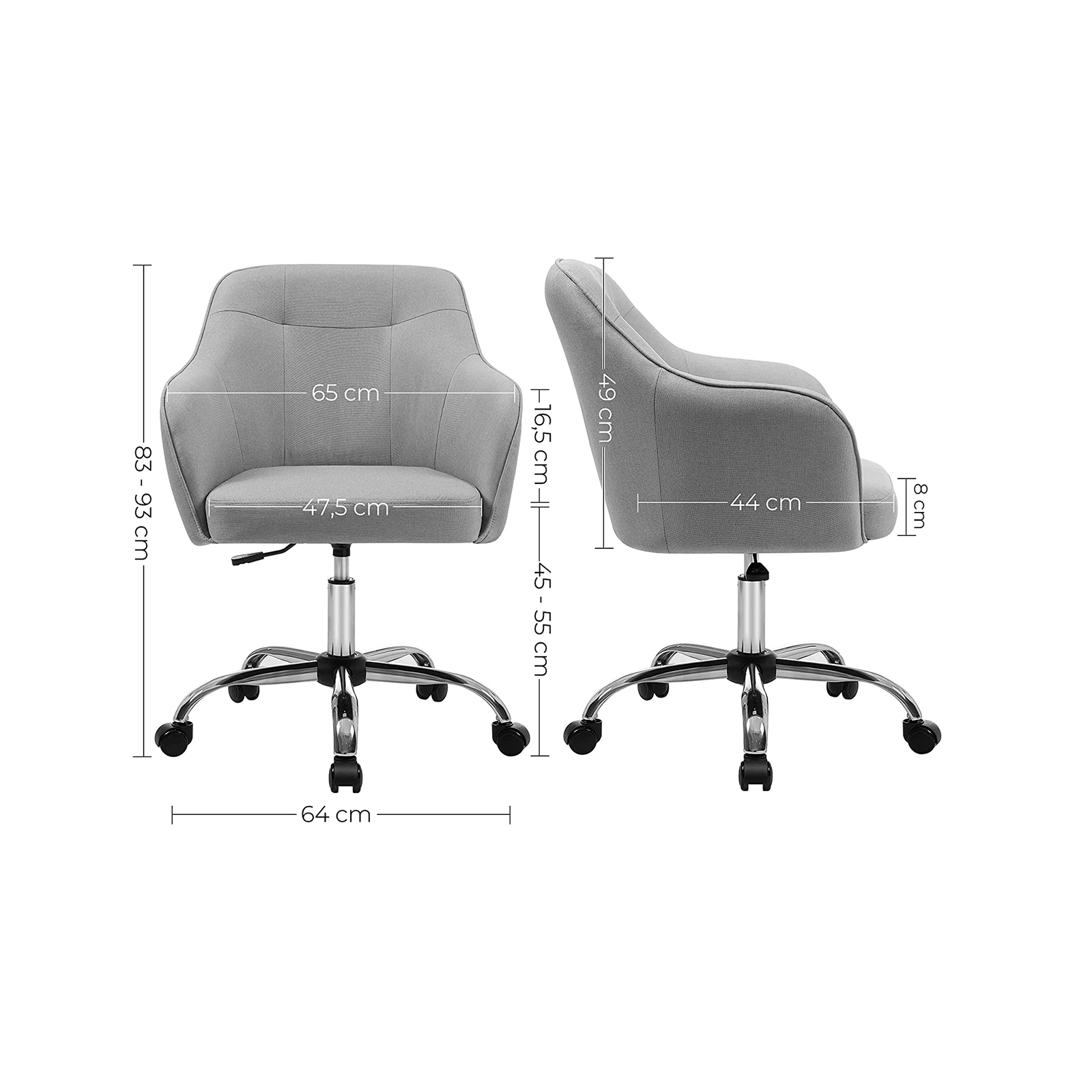 Topkomfort: Mennesker af forskellig h?jde har brug for stole i forskellige h?jder for at opn? optimal siddekomfort. Derfor er denne kontorstol h?jdejusterbar, s? den passer til b?de store og sm? kontorhelte. Den velpolstrede rygl?n og arml?n fordeler desuden trykket p? din krop optimalt. Den ?ndbare overflade af lysegr? imiteret h?r g?r det ogs? til en ren forn?jelse at sidde p? denne stol. Gennemt?nkte detaljer: Rygl?nets og arml?nets afrundede former giver denne kontorstol et unikt, moderne touch. PU-hjulene sikrer, at du kan glide smidigt gennem dit arbejdsv?relse, stue, sovev?relse og kontor. Med de medf?lgende reservescrews er du ogs? altid godt forberedt p? uventede h?ndelser.Produktdetaljer: Farve: Lysegr? Materiale: Stel af st?l og krydsfiner, skumfyldning, imiteret linned-overflade, PU-kunststofruller Stolens samlede st?rrelse: 65 x 69 x (83-93) cm (L x B x H) S?dets h?jde (fra gulvet): 45-55 cm M?l p? s?defladen: 47,5 x 44 cm (L x B) H?jde p? rygl?n: 49 cm V?gt: 9,4 kg Maks. statisk belastning: 120 kg Leveringsomfang: 1 x kontorstol 1 x tilbeh?rspakke 1 x vejledning