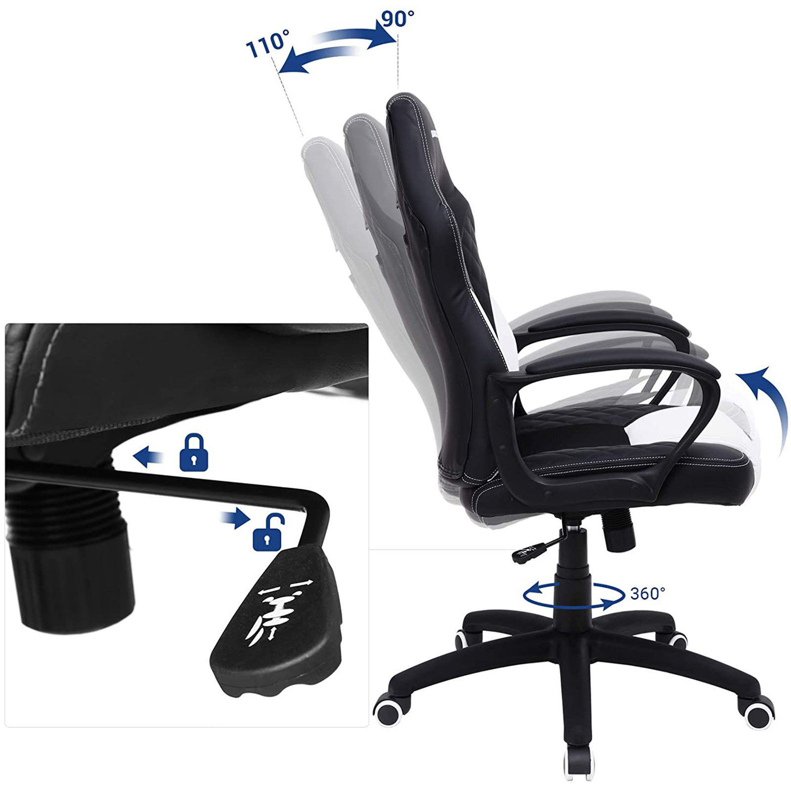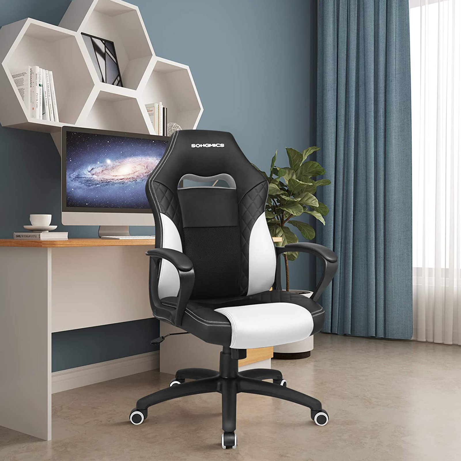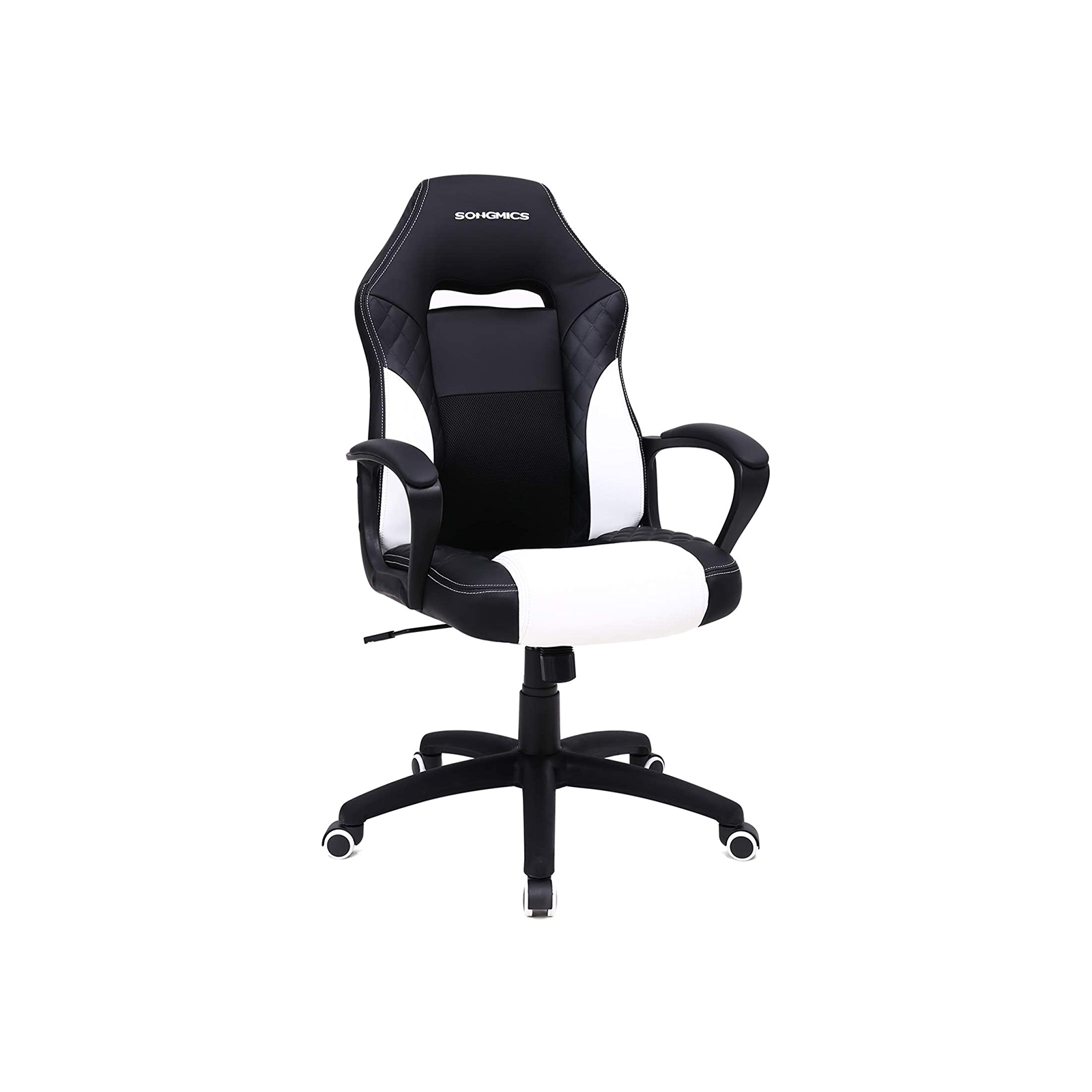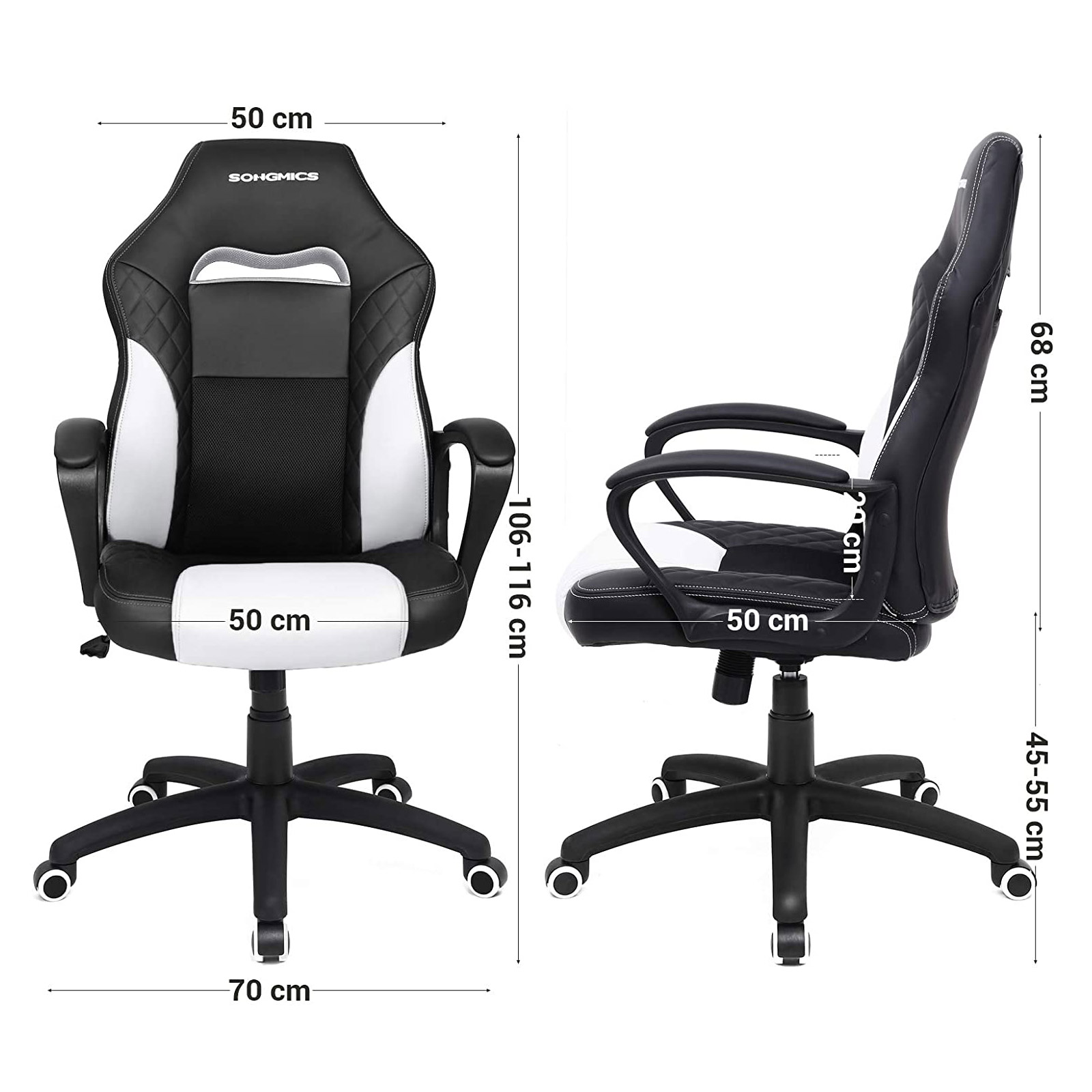 Passionerede gamere og flittige kontorhelte kan forvente f?lgende fordele: – Stilfuldt look med quiltet m?nster p? kunstl?derbetr?kket – Behagelig, formstabil skumpolstring – ?ndbare netstofelementer for h?j siddekomfort – S-formet rygl?n; giver god st?tte til din l?ndehvirvels?jle og nakke- Kan samles p? 10-15 minutter af ?n person- Gascylinder og kunstl?der testet af T?V RheinlandT?V-testet kvalitetIf?lge testrapporten fra T?V Rheinland opfylder gascylinderen i denne gamingstol kravene i EN16955:2017-04, klasse 3 for b?rende elementer i selvb?rende s?deh?jdejusteringselementer med energilagring til kontorstole (testrapport nr. 9465173_06). Vores leverand?r har f?et tildelt et tilsvarende “konstruktionstestet” certifikat (nr. 182836, gyldigt indtil 24.06.2020).Ogs? kunstl?derbetr?kket af PU blev testet af T?V Rheinland og viste ingen af de testede skadelige stoffer (f.eks. i henhold til REACH-forordningen) (rapport nr. 1160039759a 001).Produktdetaljer: – Farve: Sort-hvid – Materiale: PU-kunstl?der, skum, nylon – Samlet st?rrelse: 70 x 64 x 106-116 (L x B x H) – Bredde p? rygl?n: 50 cm – H?jde p? rygl?n: 68 cm – Bredde p? s?de: 50 cm – Dybde p? s?de: 50 cm – H?jde fra gulv til s?de: 45-55 cm – H?jde fra gulv til arml?n: 65-75 cm – V?gt: 14,5 kg – Maks. statisk belastning: 150 kg Leveringsomfang: – 1 x gamingstol – 1 x unbrakon?gle – 1 x beholder med tilbeh?r – 1 x vejledning (DE, EN, FR, ES, IT) SONGMICS Bem?rkninger:- Uds?t ikke produktet for st?rk sollys. – Hold produktet v?k fra skarpe eller spidse genstande for at undg? skader.