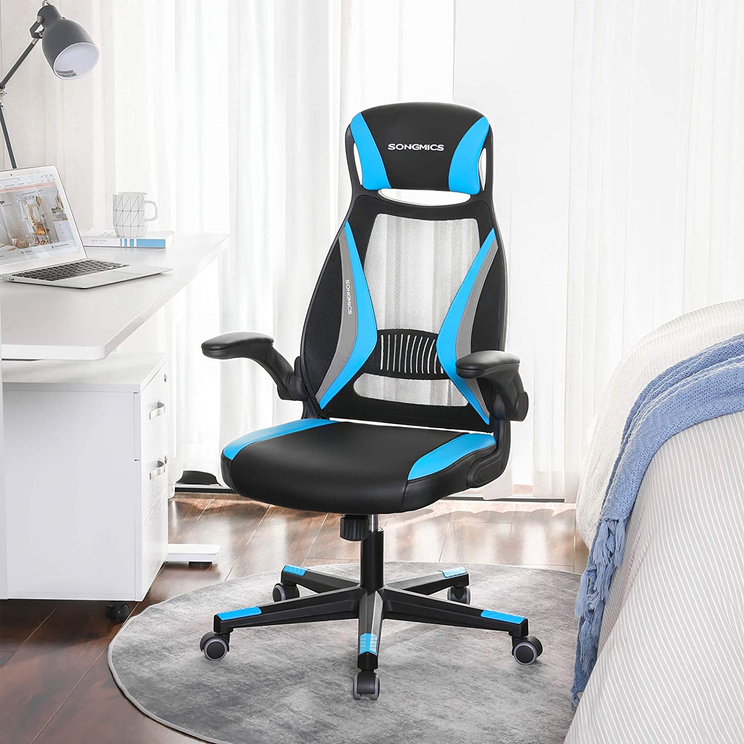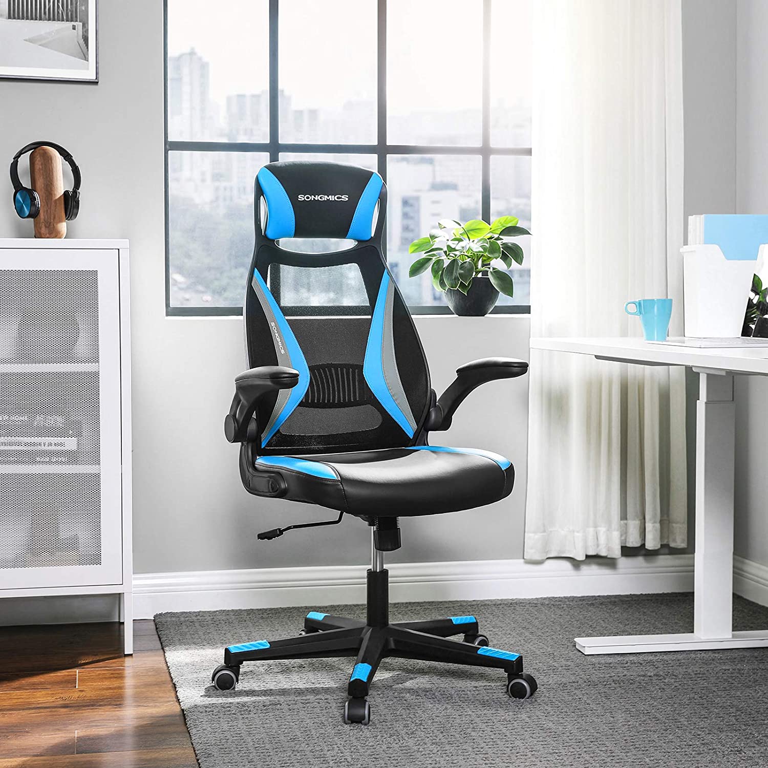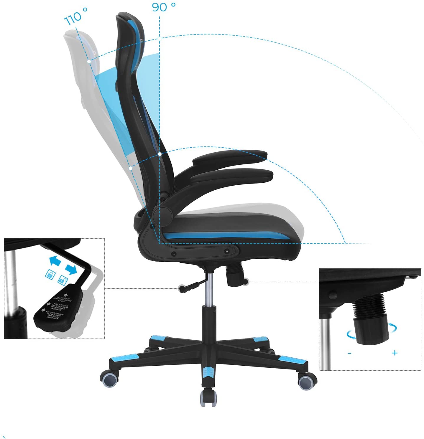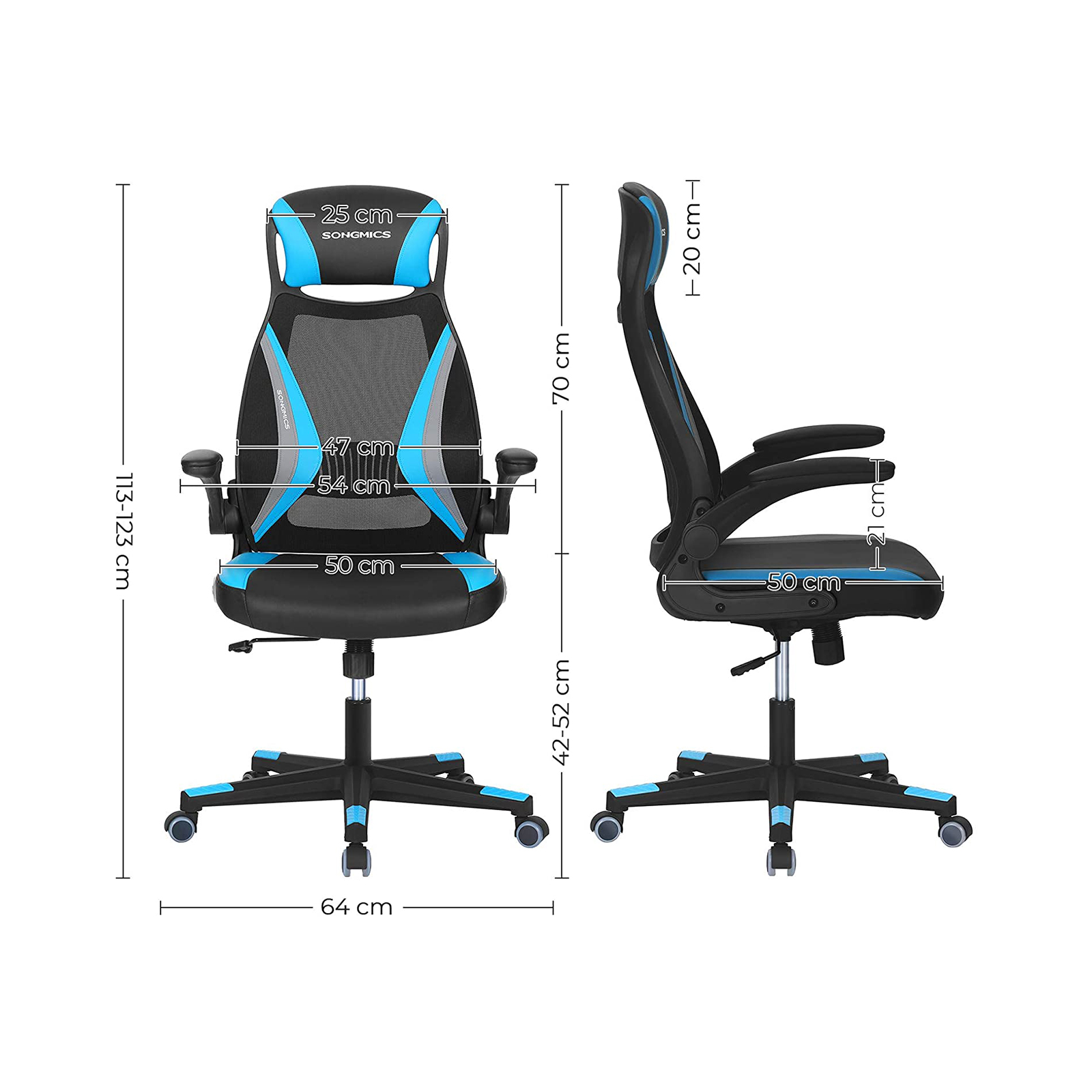 ?get produktivitet, forbedret hum?r En forkert kropsholdning g?r de i forvejen anstrengende arbejdstimer endnu mere ubehagelige. Find din ideelle kropsholdning med denne kontorstol: Din krop slapper af, din hjerne bliver mere produktiv, og 8 arbejdstimer flyver af sted. Fordele ved denne kontorstol: – Juster stolens h?jde for at finde din ideelle siddestilling, der passer til h?jden p? din sk?rm. – Takket v?re rygl?nets ergonomiske form kan du altid arbejde afslappet og med ret ryg. – Lad dine arme hvile p? de komfortable arml?n, der er betrukket med PU-kunstl?der. – Slap af i nakke og skuldre takket v?re den h?je rygl?n, der g?r over i en nakkest?tte. Produktdetaljer: – Farve: Sort-lysebl?-gr? – Materiale: St?l, skumpolstring, plast, PU-kunstl?der, stofoverflade, nylonhjul – Stolens samlede st?rrelse: 64 x 54 x (113-123) cm (L x B x H) – S?dets h?jde (fra gulvet): 42-52 cm – M?l p? s?defladen: 50 x 50 cm (L x B) – M?l p? rygl?n: 47 x 70 cm (L x H) – M?l p? nakkest?tte: 25 x 20 cm (B x H) – H?jde p? arml?n (fra s?defladen): 21 cm – V?gt: 13,5 kg – Maks. statisk belastning: 130 kg Leveringsomfang: – 1 x kontorstol – 1 x tilbeh?rspakke – 1 x vejledning (DE, EN, IT, FR, ES) SONGMICS Bem?rkninger: – S?t ikke produktet over et