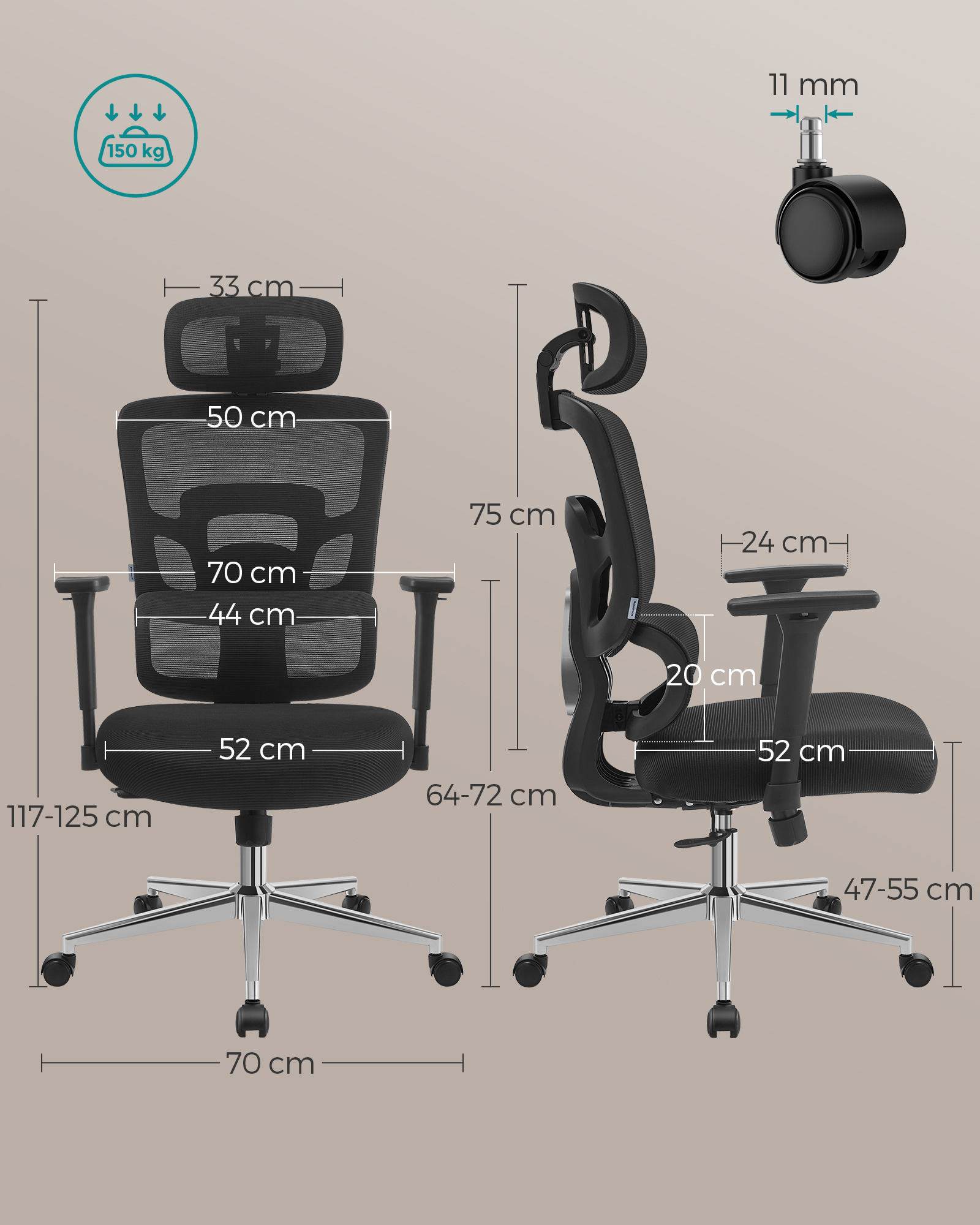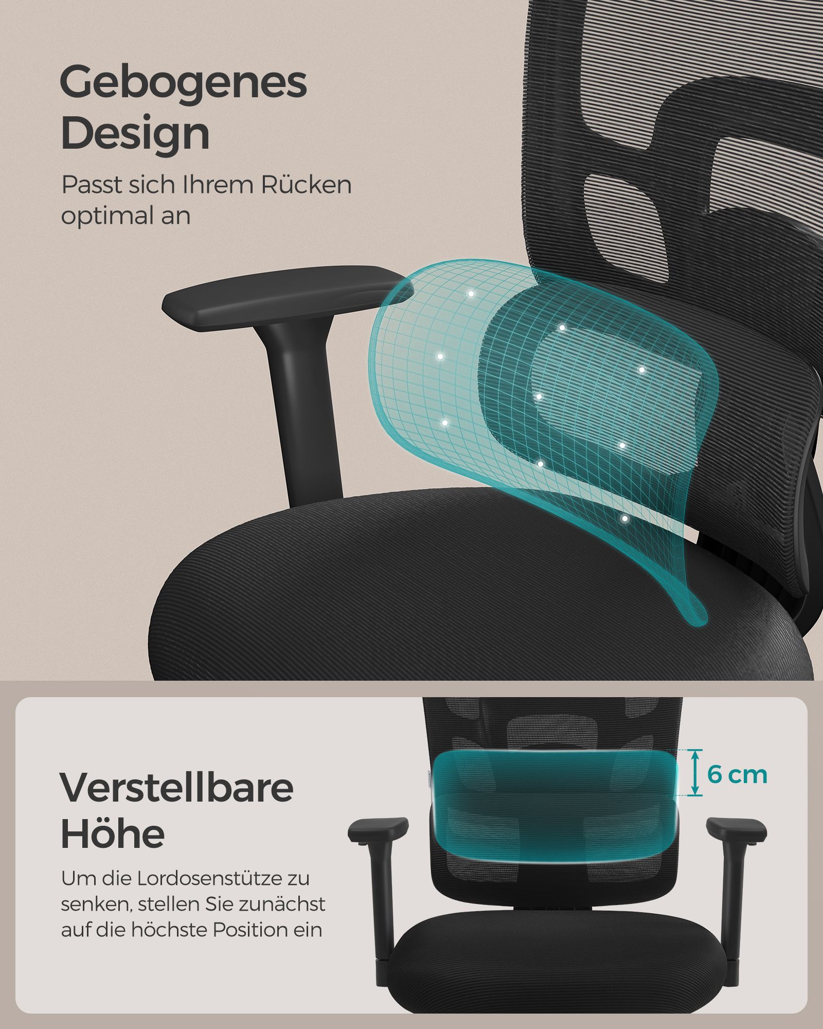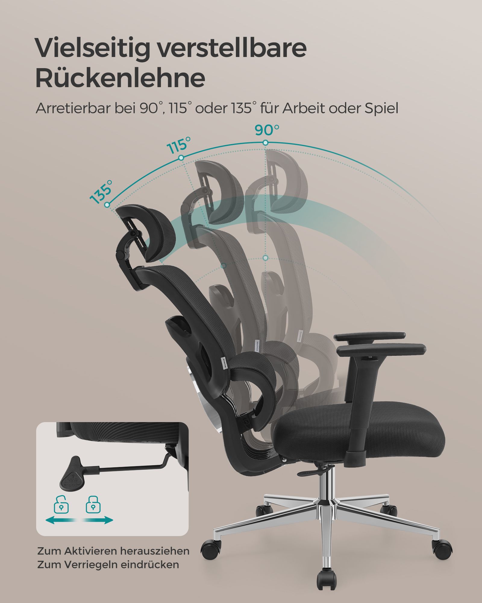 SONGMICS kontorstol, ergonomisk skrivebordsstol, h?j rygl?n, computerstol, h?jdejusterbar l?ndest?tte, justerbar nakkest?tte, arml?n, hjemmekontor
