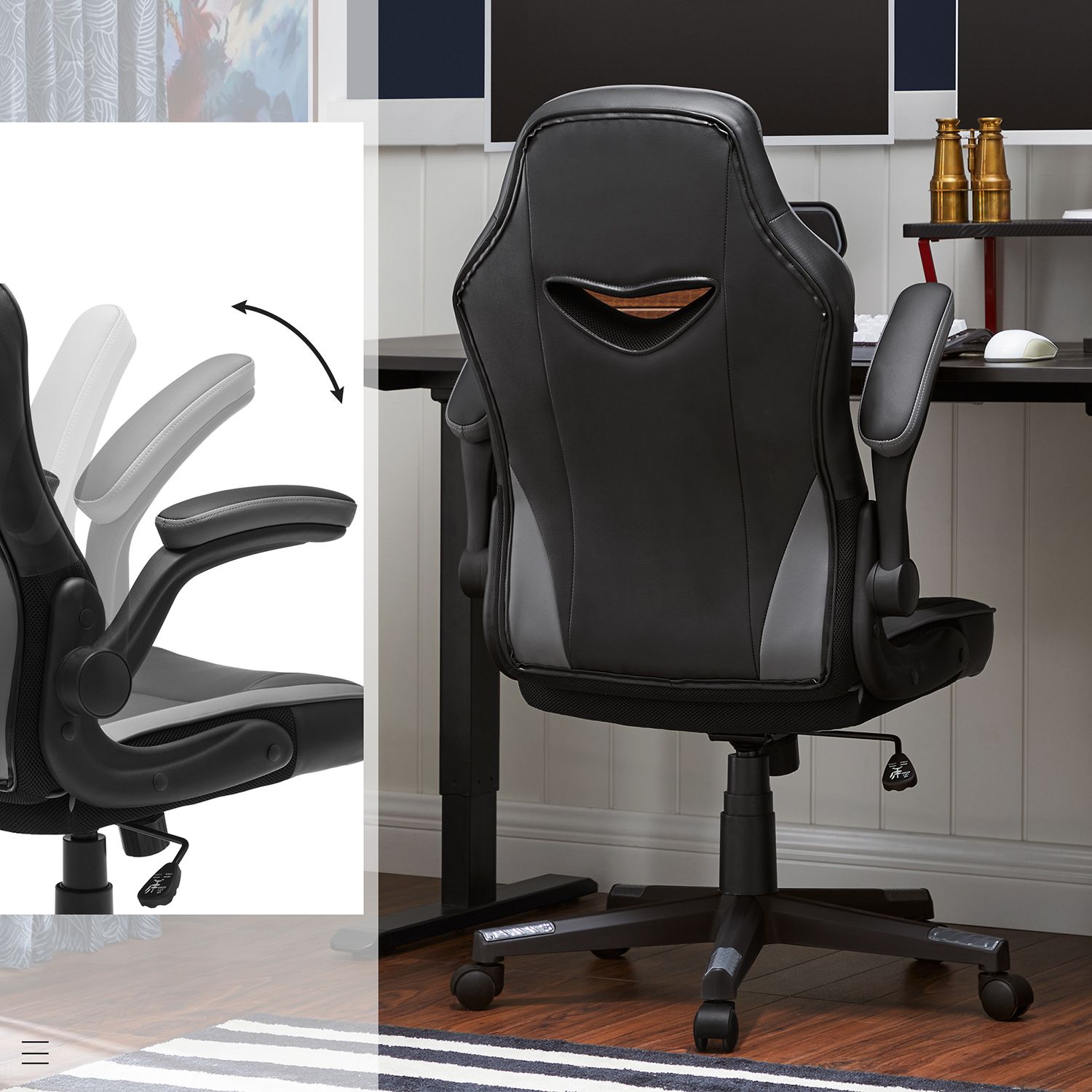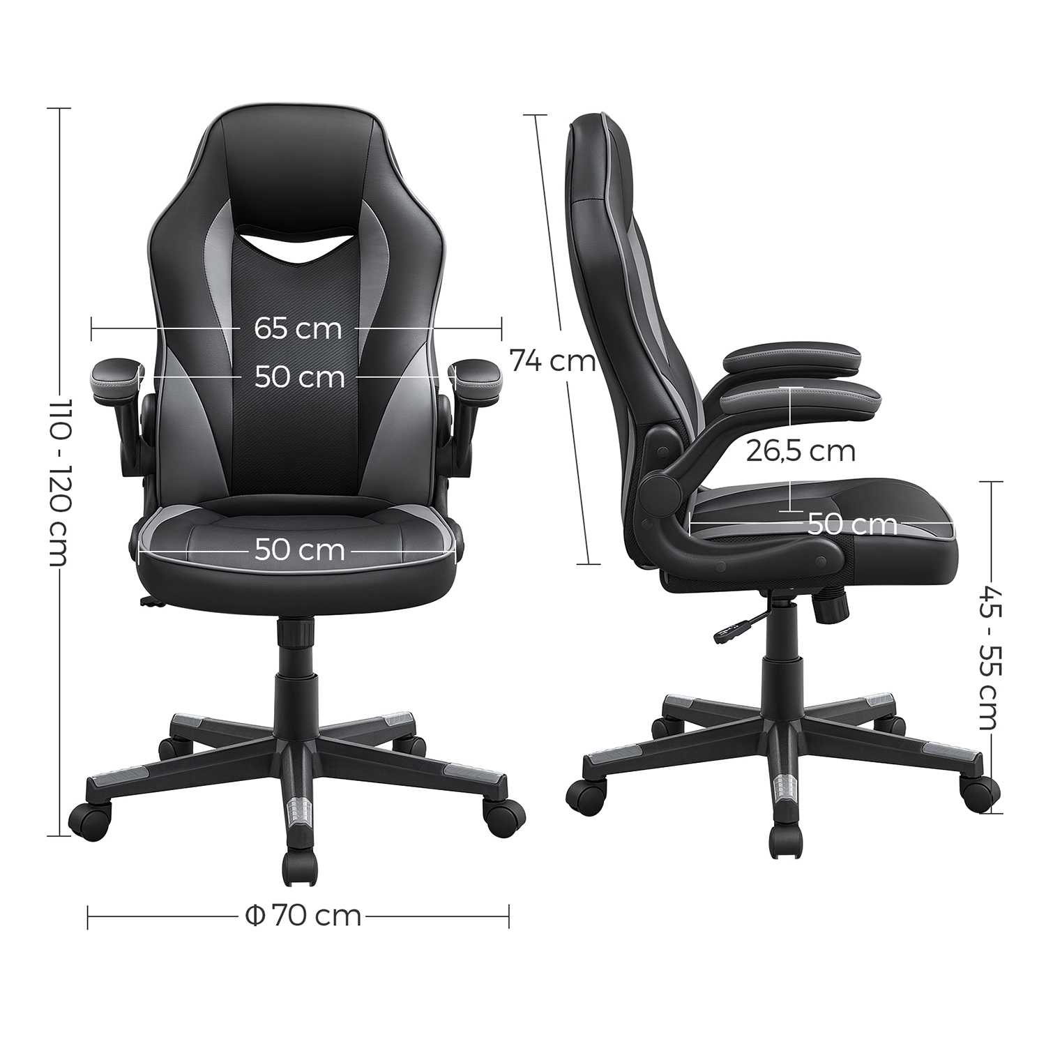 ?get produktivitet, forbedret hum?r: En forkert kropsholdning g?r de i forvejen anstrengende arbejdstimer endnu mere ubehagelige. Find din ideelle kropsholdning med denne kontorstol: Din krop slapper af, din hjerne bliver mere produktiv, og 8 timers arbejde flyver af sted. Fordele ved denne kontorstol: Juster stolens h?jde for at finde din ideelle siddestilling, der passer til h?jden p? din sk?rm.Takket v?re rygl?nets ergonomiske form kan du altid arbejde afslappet og med ret ryg. Lad dine arme hvile p? de komfortable arml?n, der er betrukket med PU-kunstl?der. Afslap nakke og skuldre takket v?re det h?je rygl?n. Takket v?re vippefunktionen og det komfortable polstrede s?de kan du slappe af i et par minutter og derefter forts?tte med at arbejde!Produktdetaljer: Farve: Sort-gr? Materiale: Stel af krydsfiner, skumfyldning, PU-kunstl?deroverflade Stolens samlede st?rrelse: 75 x 64 x (110-120) cm (L x B x H) V?gt: 14,6 kg Maks. statisk belastning: 150 kg Leveringsomfang: 1 x kontorstol 1 x tilbeh?rspakke 1 x vejledning SONGICs bem?rkninger: “Vippefunktion” betyder, at rygl?n og s?de bev?ger sig bagud samtidigt. Rygl?net p? denne stol kan ikke vippes bagud separat.