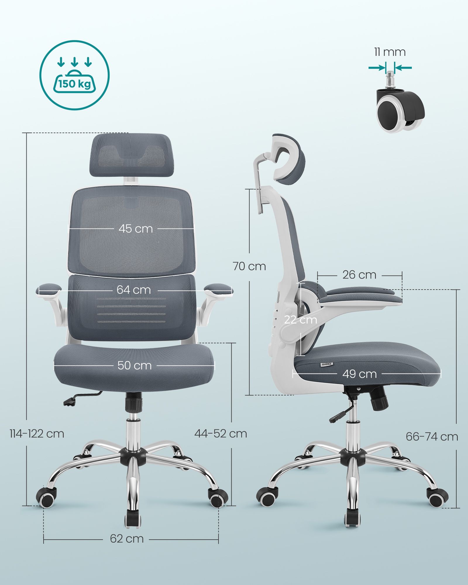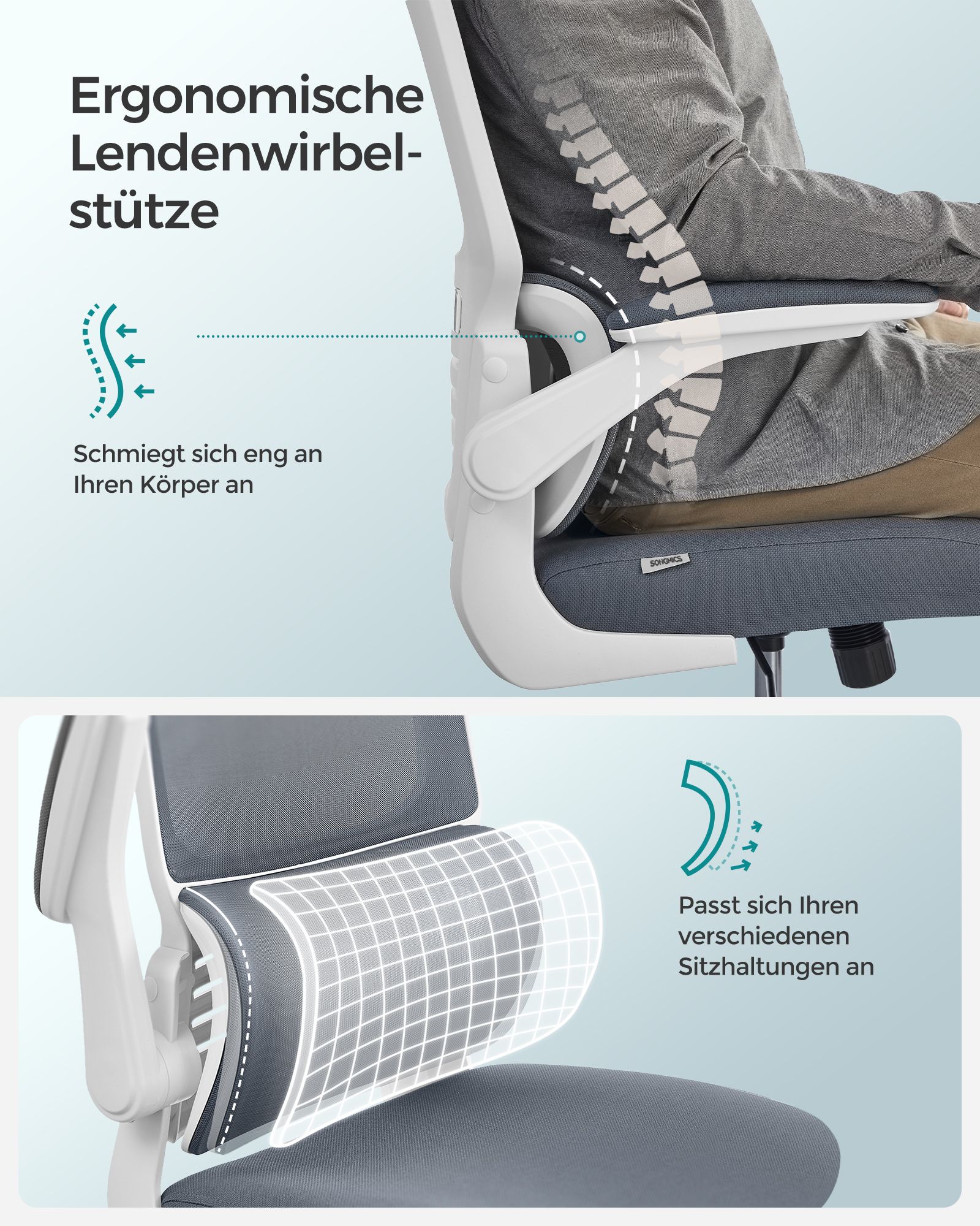 SONGMICS kontorstol, skrivebordsstol, ergonomisk, foldbare arml?n, h?j rygl?n, netstol med l?ndest?tte og justerbar nakkest?tte, vippefunktion