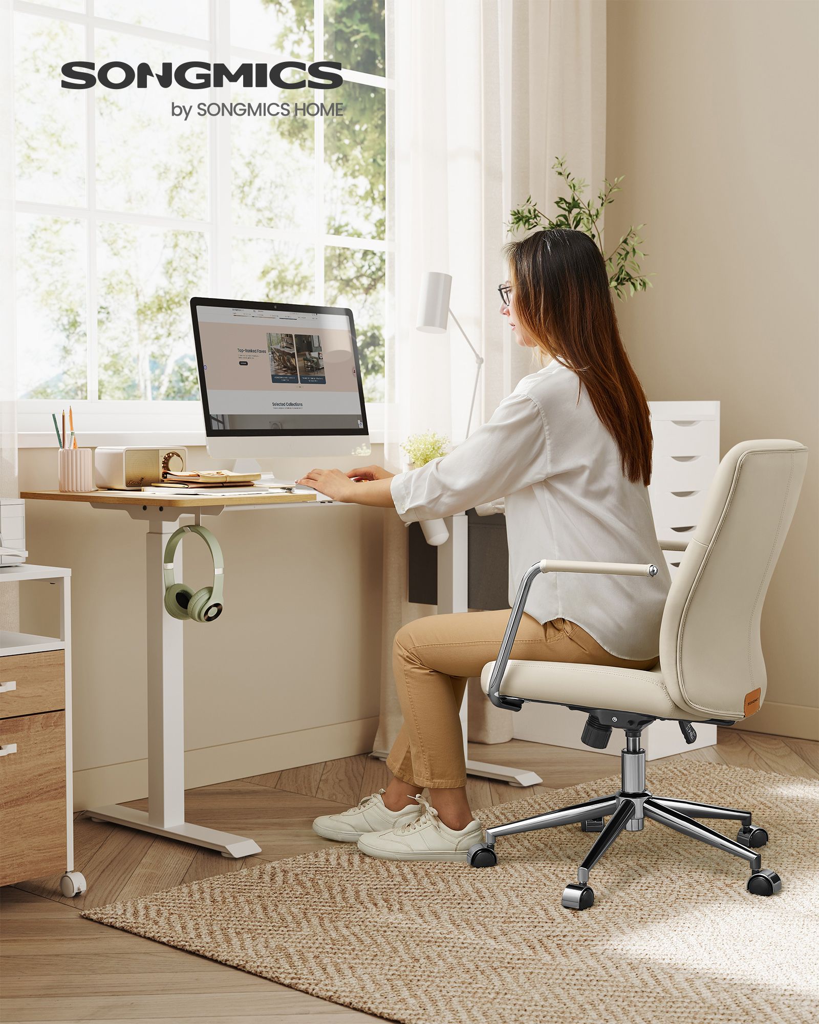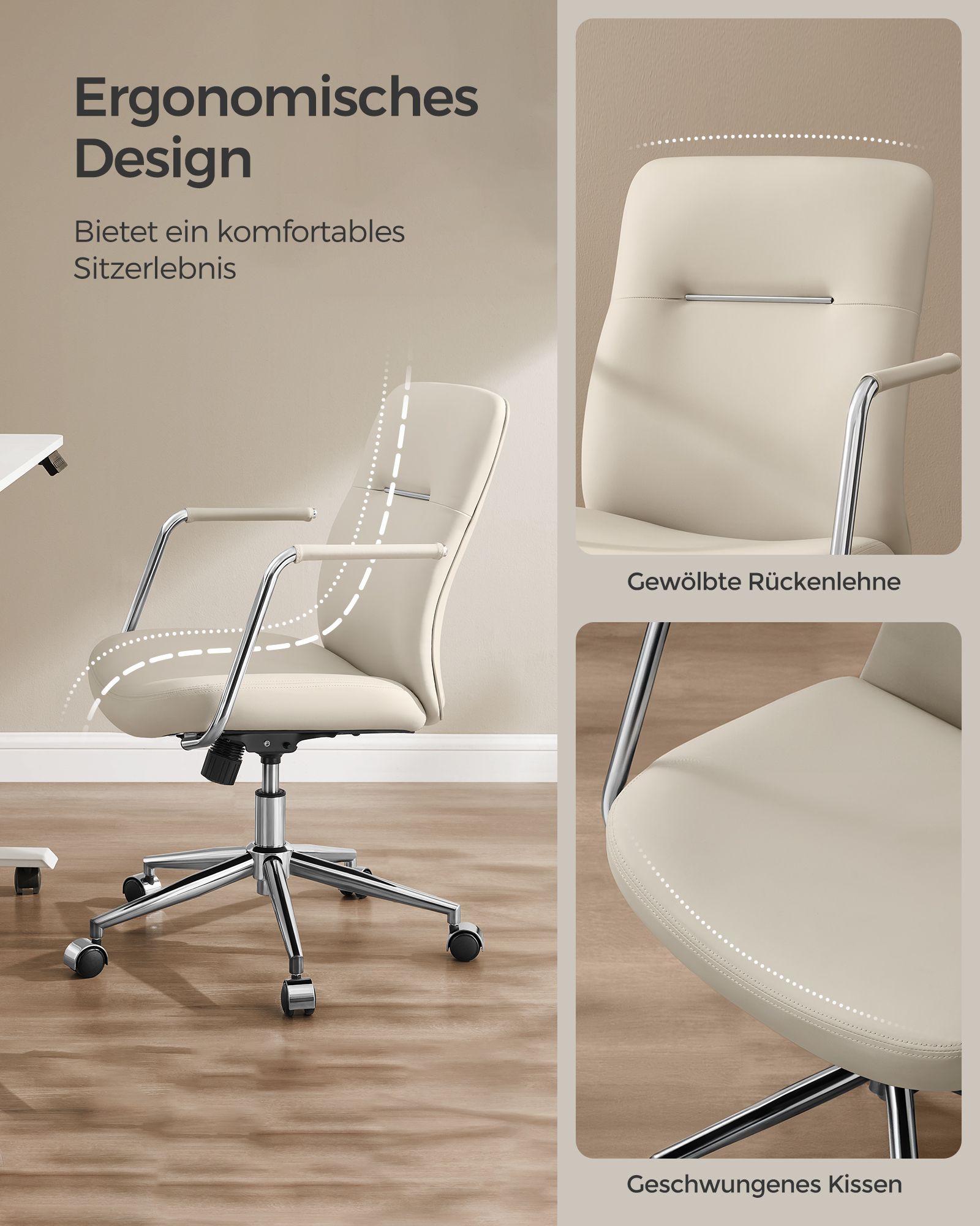 SONGMICS kontorstol, computerstol, PU-overflade, let at reng?re, h?jdejusterbar, behagelig rygl?n og buet s?de, belastbar op til 150 kg, bl?ksort OBG031B01
