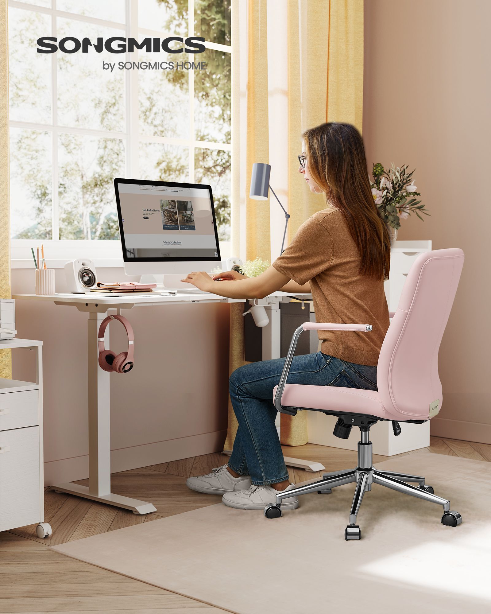 SONGMICS kontorstol, computerstol, PU-overflade, let at reng?re, h?jdejusterbar, behagelig rygl?n og buet s?de, belastbar op til 150 kg, bl?ksort OBG031B01