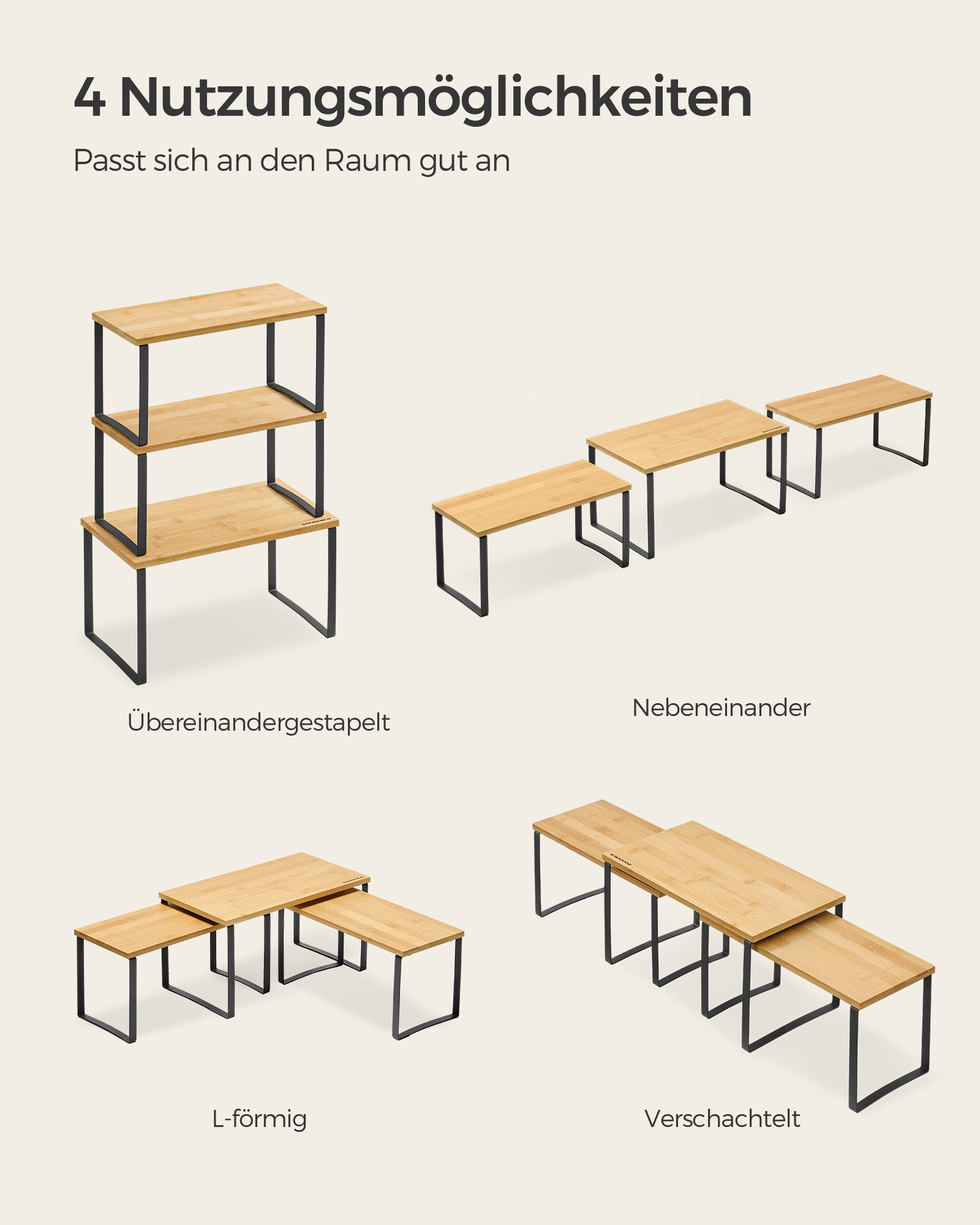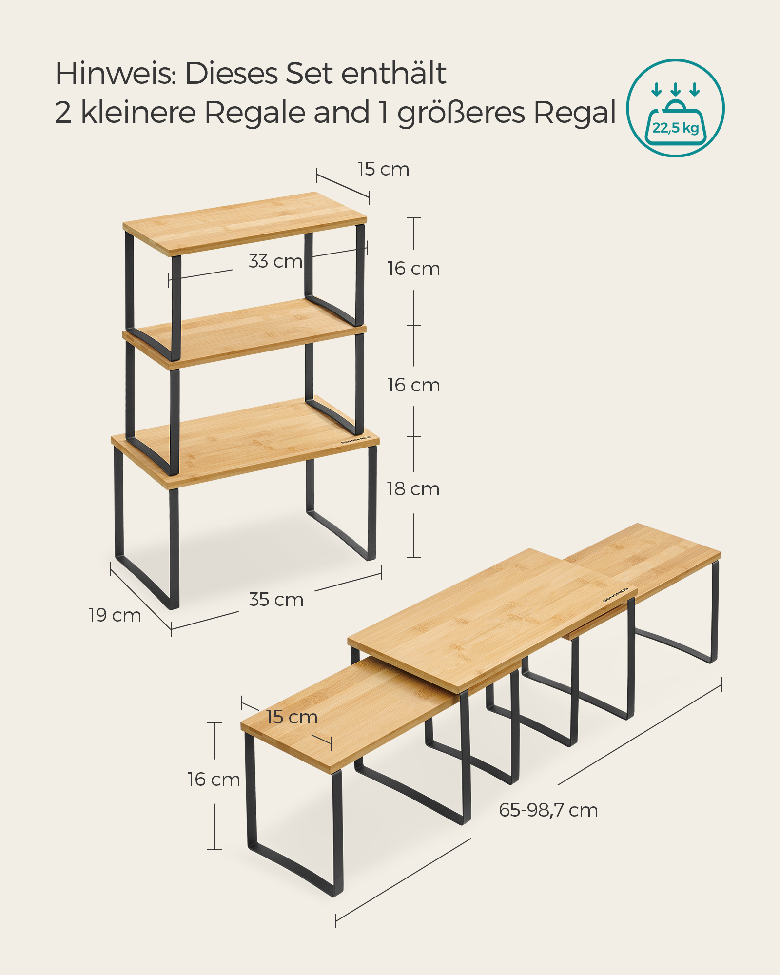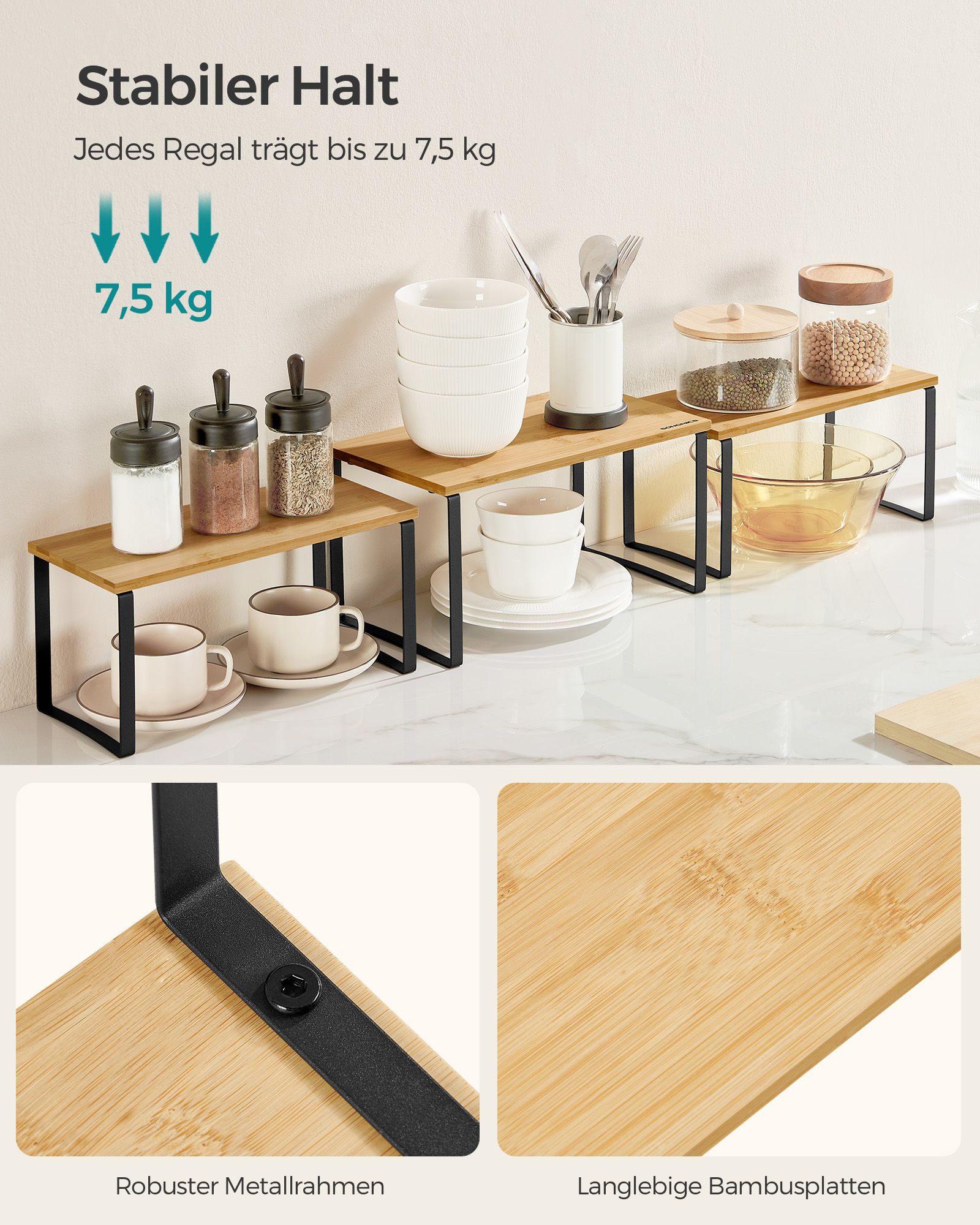 SONGMICS krydderihylde, 3-delt s?t k?kkenorganizer, k?kkenhylde, stabelbar, udvidelig, metal og bambus, bl?ksort-naturbeige KCS014B01