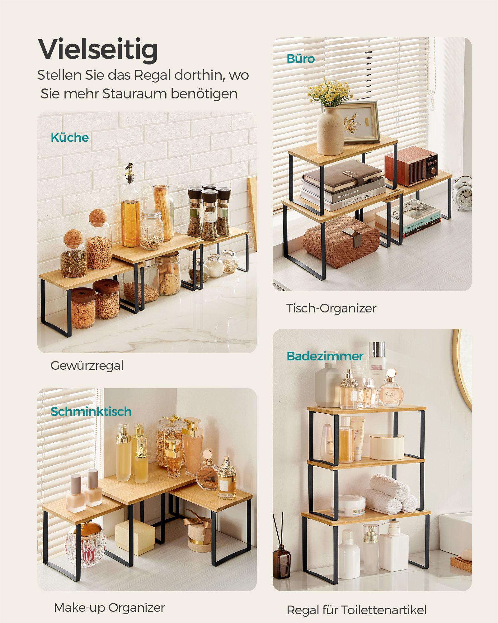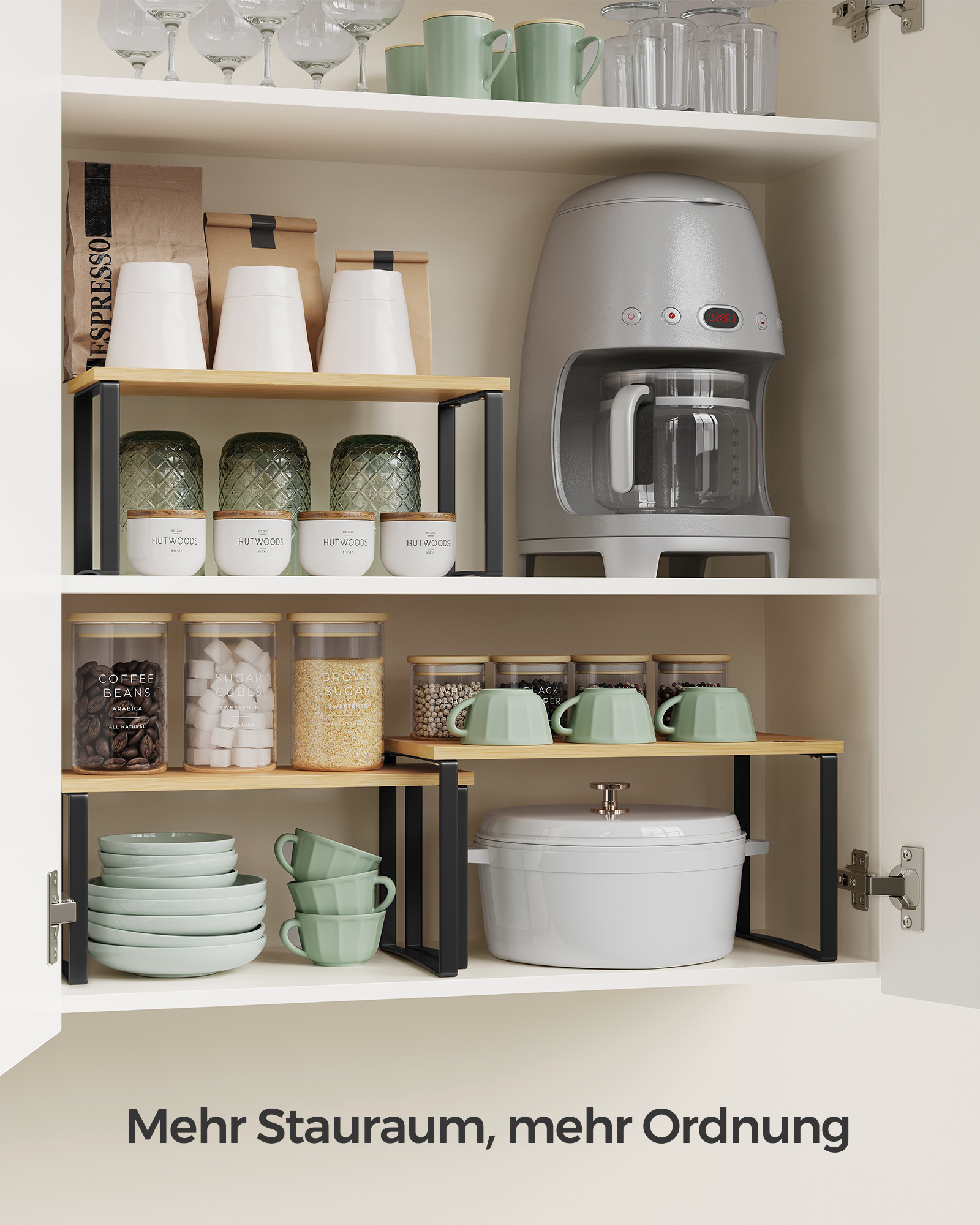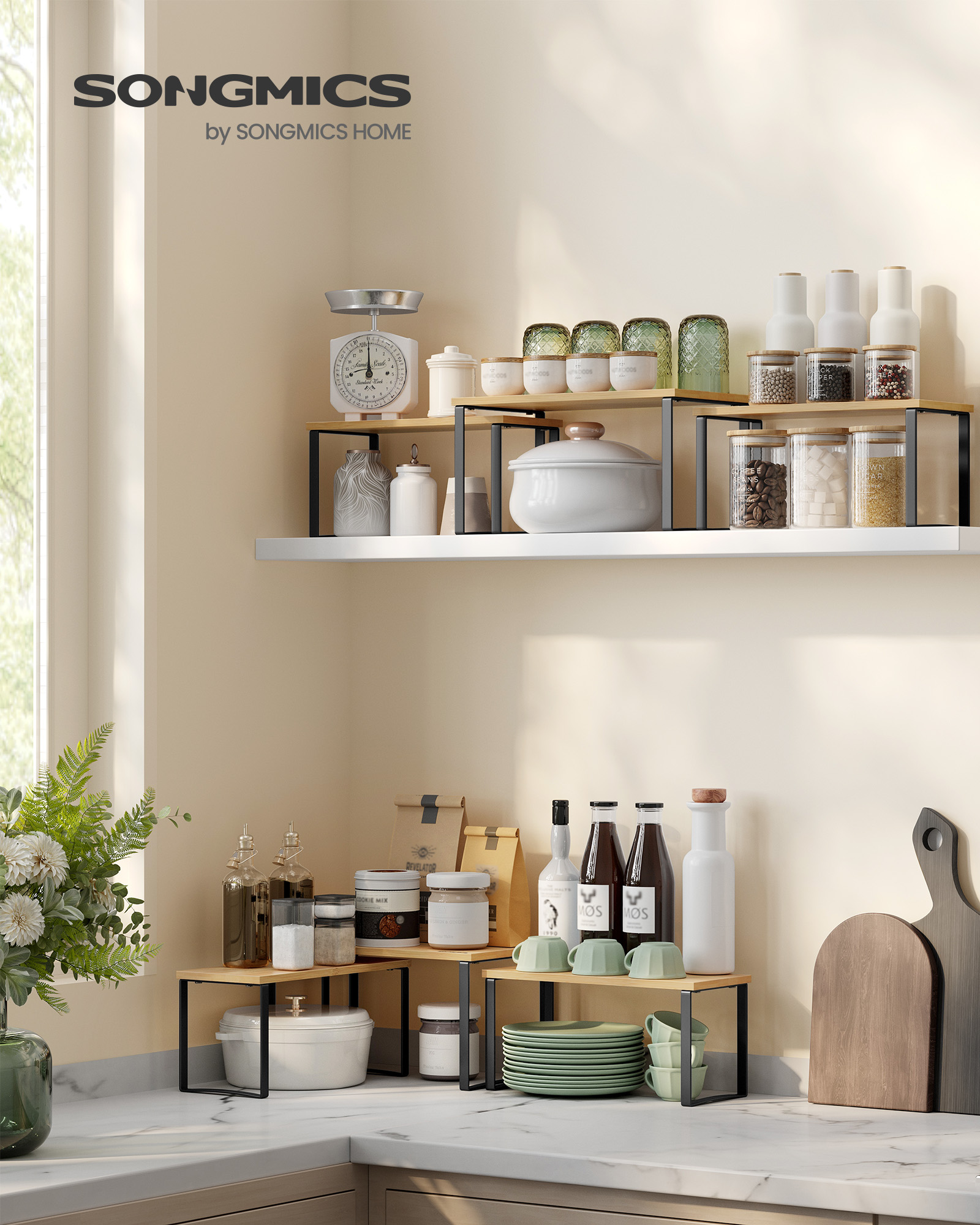 SONGMICS krydderihylde, 3-delt s?t k?kkenorganizer, k?kkenhylde, stabelbar, udvidelig, metal og bambus, bl?ksort-naturbeige KCS014B01