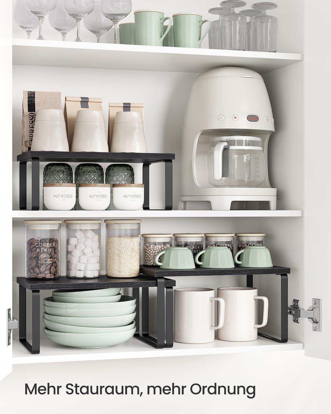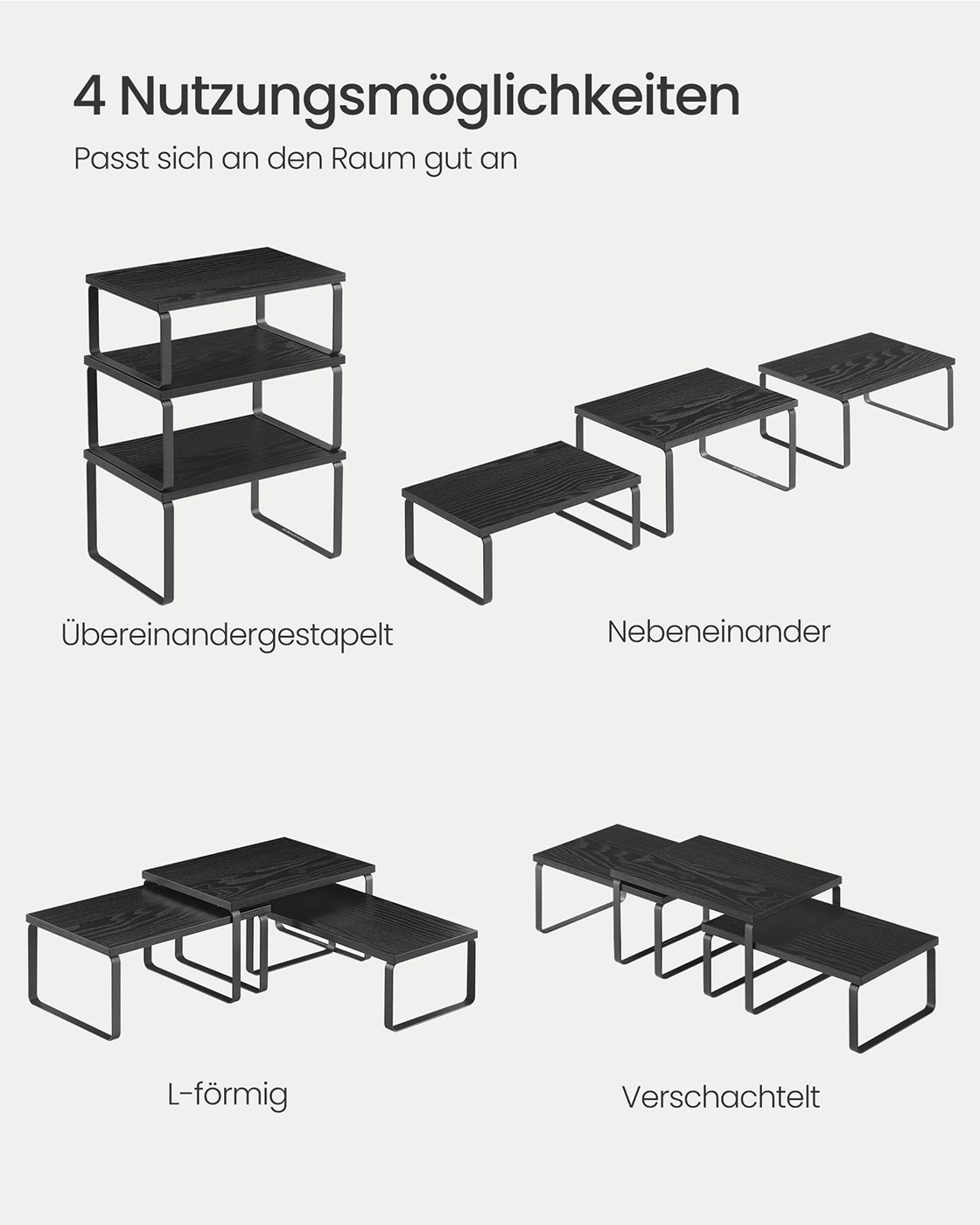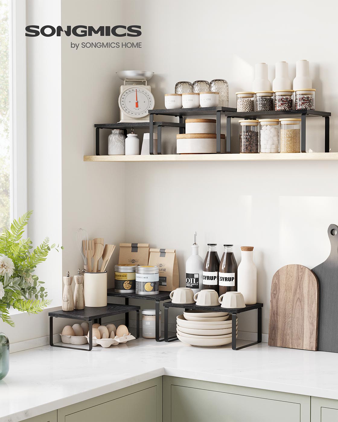 SONGMICS krydderihylde, 3-delt s?t k?kkenorganizer, k?kkenhylde, stabelbar, udvidelig, metal og bambus, bl?ksort-naturbeige KCS014B01